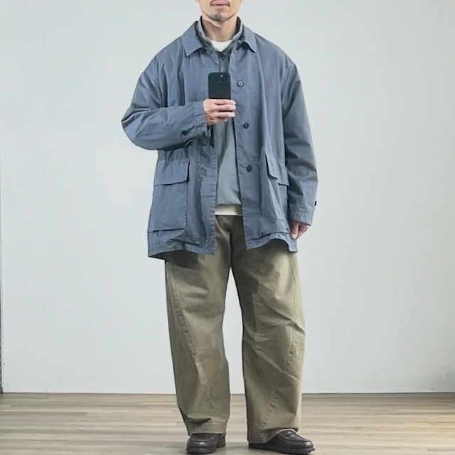 ℹ️着用イメージ画像はページ下部に掲載しています。スクロールしてご覧ください。 【アイテム説明】 高密度コットンツイルを使用した製品染めコート。 かなり細番手の糸を用いているため綾目はほとんど目立ちませんが、強度と美しい落ち感を重視し、あえて綾織で仕立てています。 ハリとしなやかさを併せ持つ生地は、製品染めによって奥行きのある表情に。 光の当たり方や動きによって、微妙な陰影が生まれます。 ゆとりのあるサイズ感ながら、小ぶりな襟とハーフ丈で全体のバランスを丁寧に設計。 リラックス感と端正さが共存するシルエットです。 春にはシャツコートのように軽やかに羽織れる一着。 けれど、その立ち位置はあくまで“コート”。 袖口には袖ベルトを配し、背面にはバックヨークを備えるなど、 細部までコートとしての構造を落とし込んでいます。 嵩張らない軽さがありながら、 着たときの佇まいはきちんと整う。 シャツの延長では出せない、 奥行きと説得力を持ったライトアウターです。 [カラー] ブルーグレー [素材/生産] コットン100% 日本製 [サイズ]46/48 肩幅/身幅/着丈/袖丈 56cm/68cm/81cm/57cm 58cm/70cm/83cm/58cm ※平置きでの計測です。手作業での計測のため、多少の誤差はご了承ください。 ■ブランド説明■ 【STILL BY HAND/スティル バイ ハンド】 直訳すると"いまだに手で"という意味になります。 そこには洋服というものがいくつもの人間の手によってうまれてくるという意味が込められています。 スティルバイハンドの手によって生みだされる洋服はシンプルさと品の良さをベースに、程よくトレンドやデザインを落とし込むことで完成します。この程よさの塩梅が絶妙。実際に袖を通していただいて初めて気づくような工夫やこだわりを感じていただけるはずです。