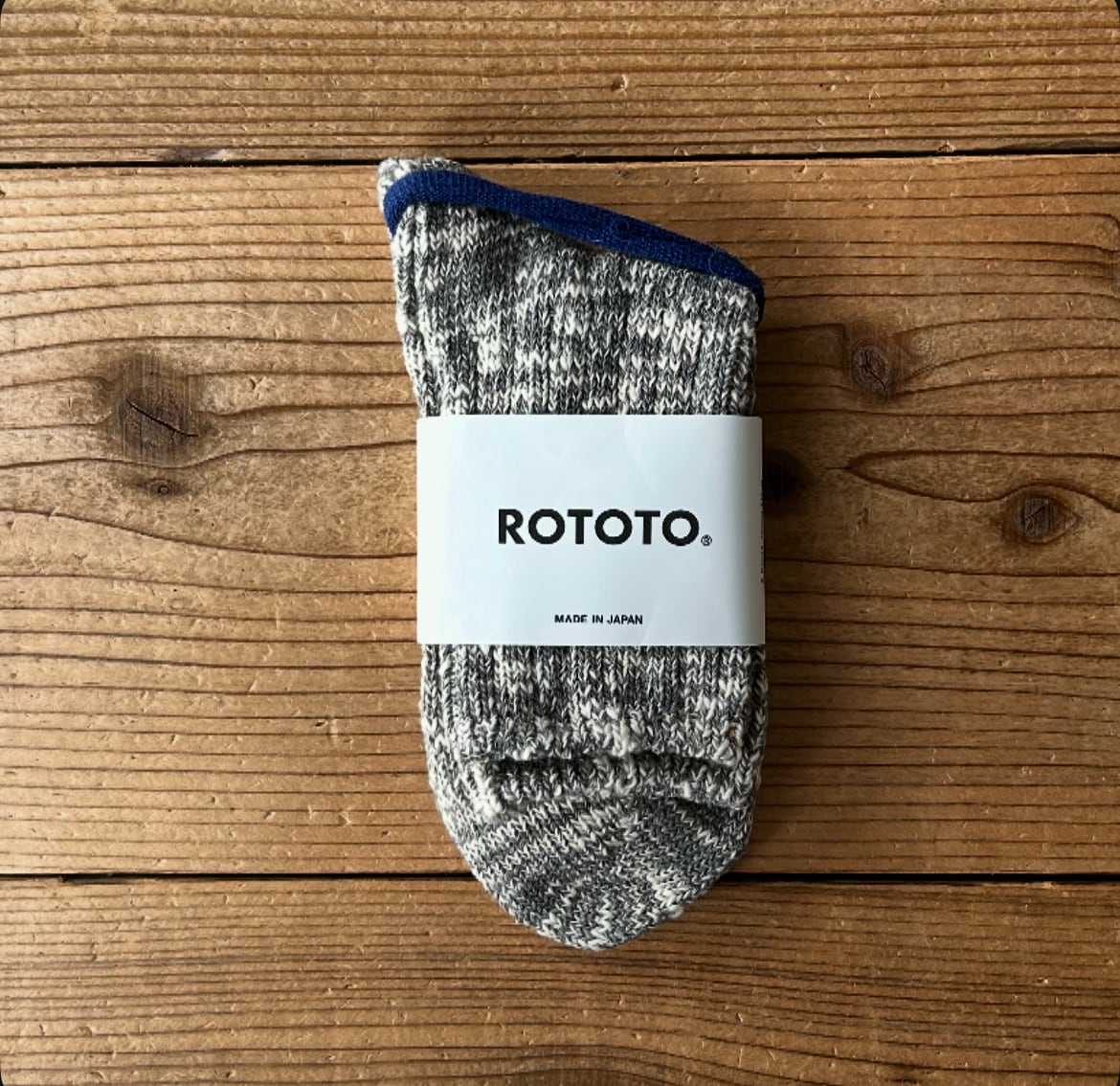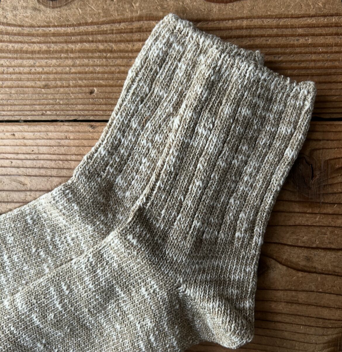希少な旧式編み機を使用し、太番手のオーガニックコットン糸とリサイクルコットン糸をミックスして編み立てたローゲージソックスです。