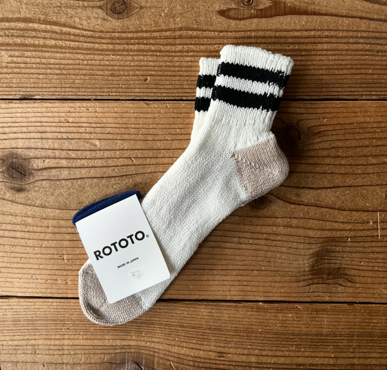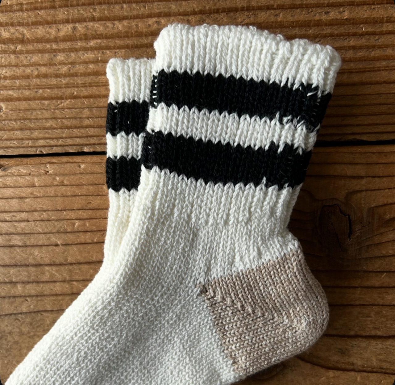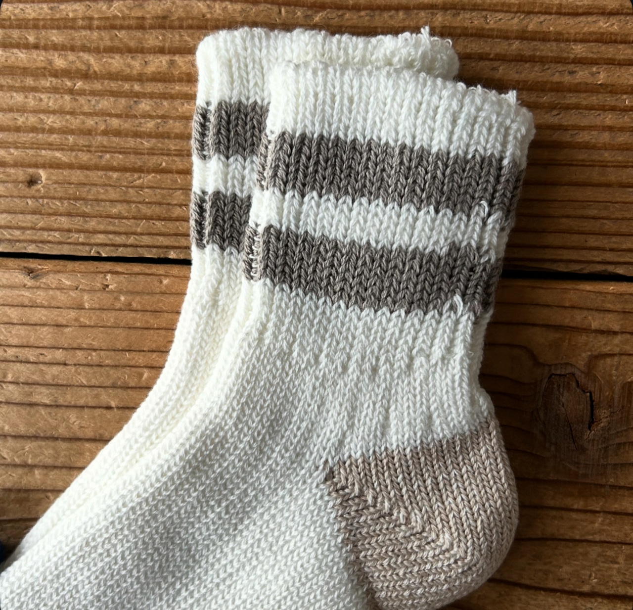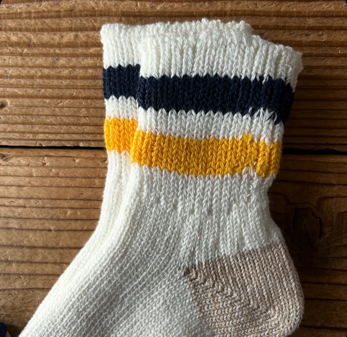 オーガニックコットン糸とリネン糸をミックスし、旧式のローゲージ編み機を使い3×1リブに編み立てた一足です。2ストライプがデザインポイントで、サンダルやスニーカーなどのコーディネートにも相性抜群です。