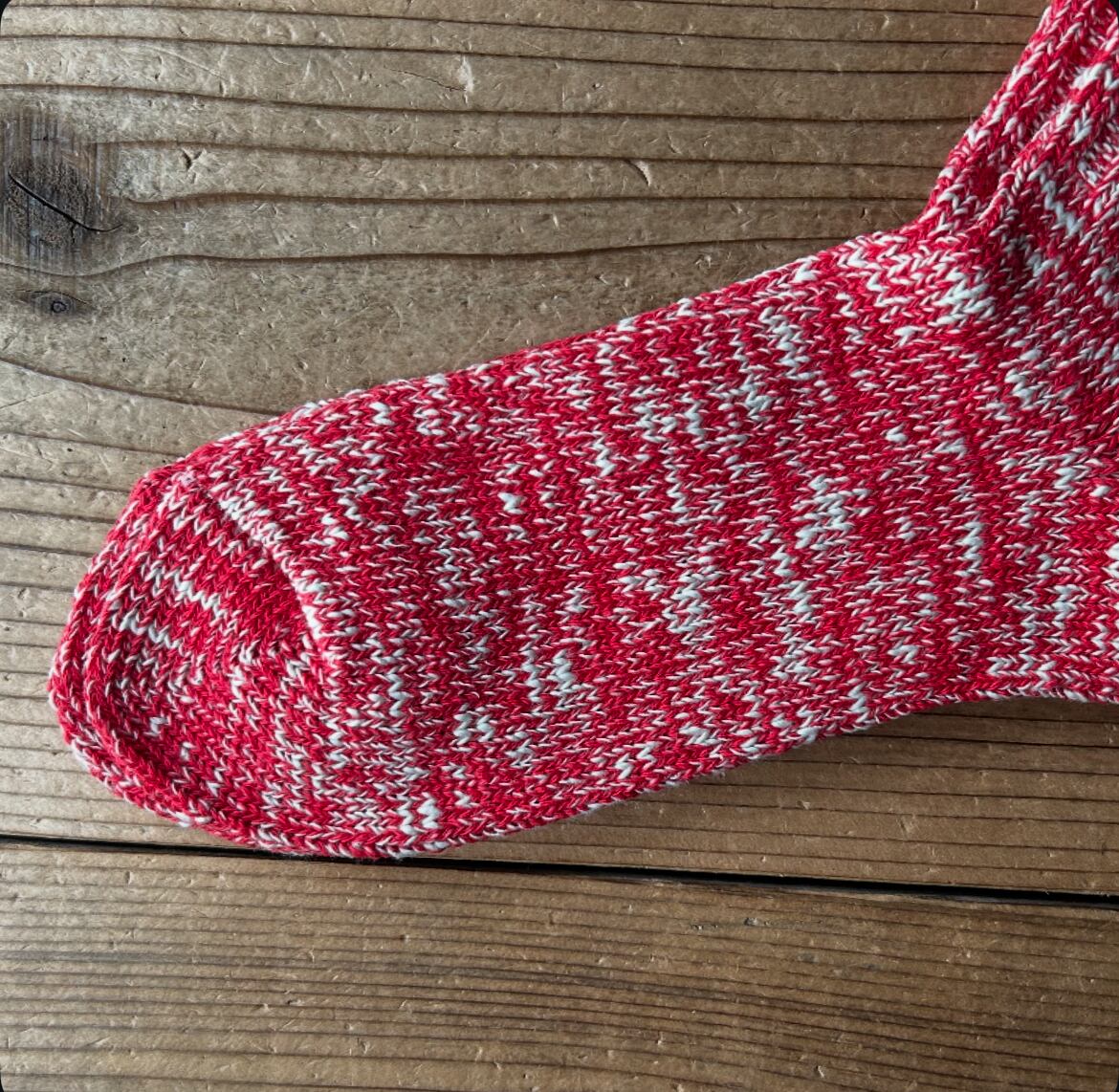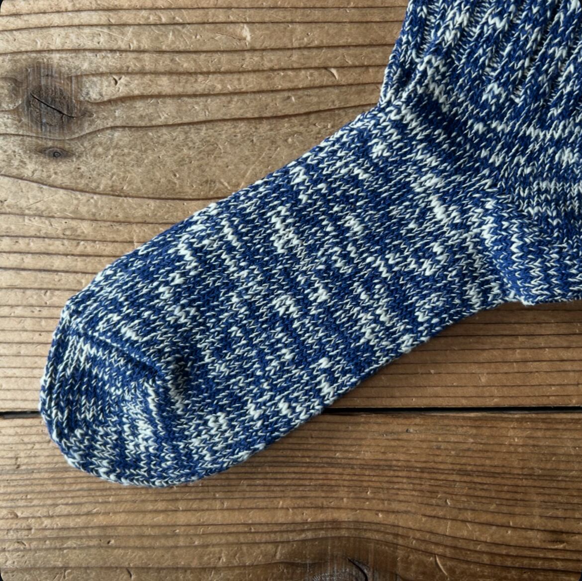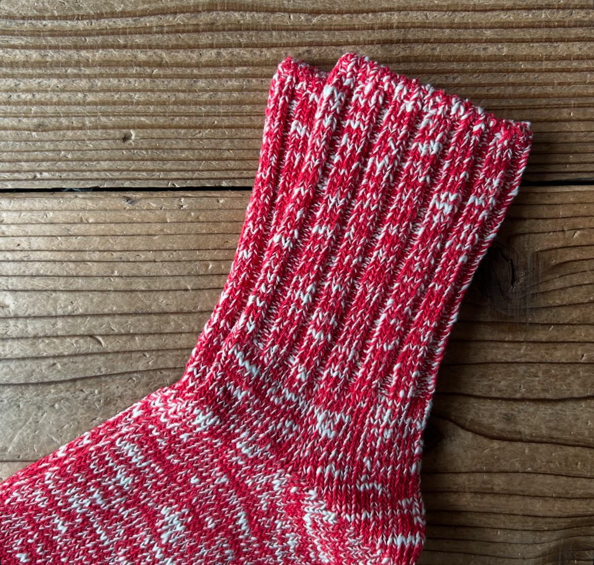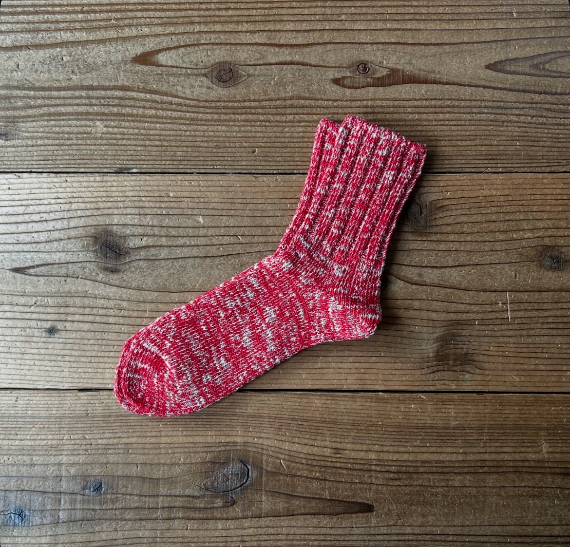 時代と共に扱える職人さんと編み機の数が減少傾向にある希少な旧式の編み機を使用したシンプルなローゲージソックスです。手紡ぎのようなデコボコしたオーガニックコットンのムラ糸と通常の紡績工程では省かれる短い綿の織維を再利用したリサイクルコットンの糸を使用しぎっくりと編み立てたエコなソックスです。