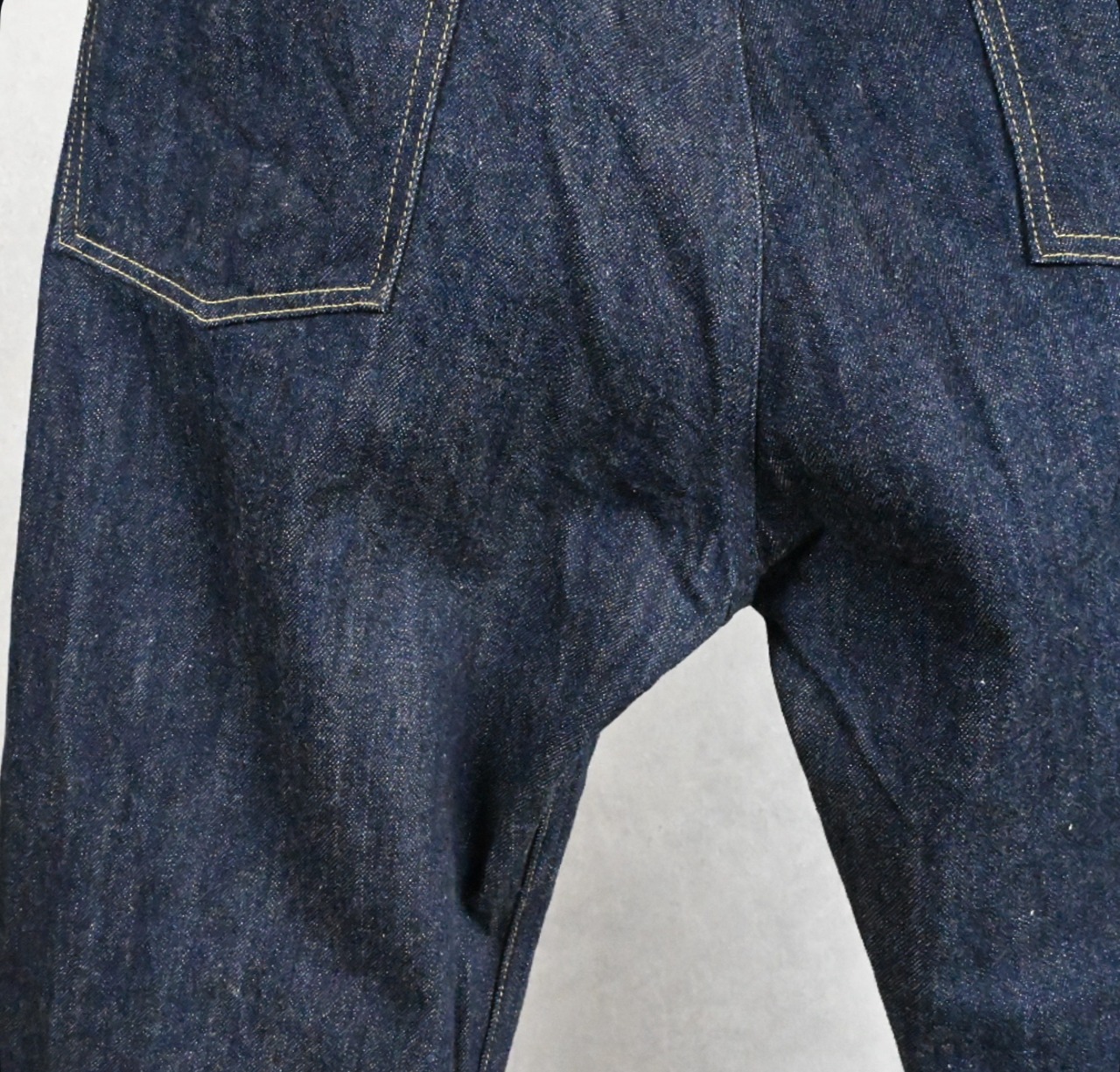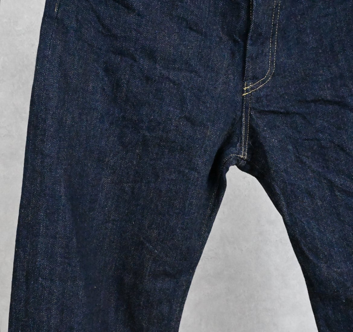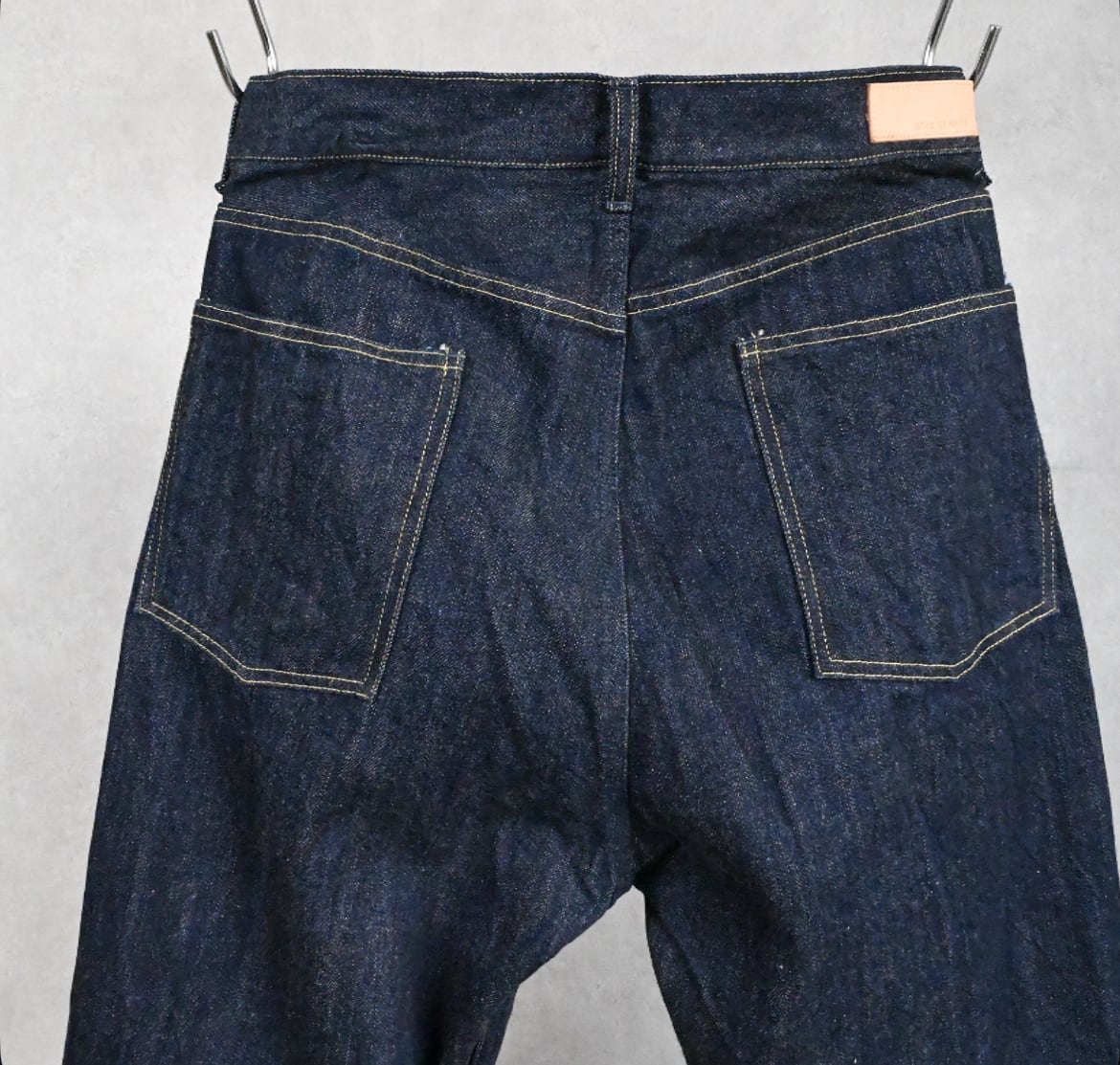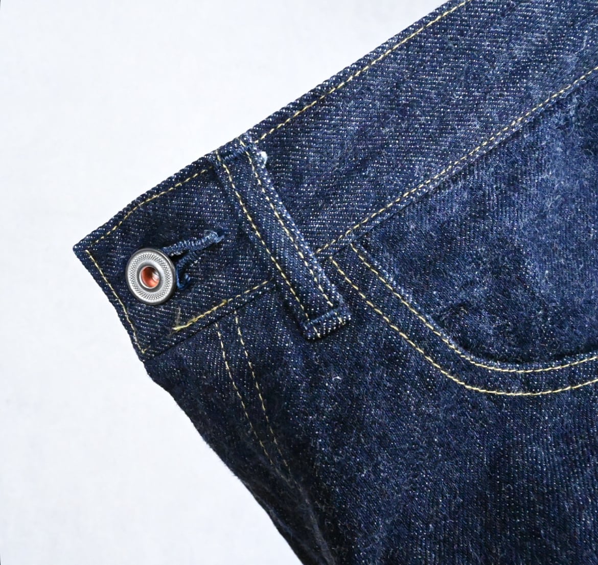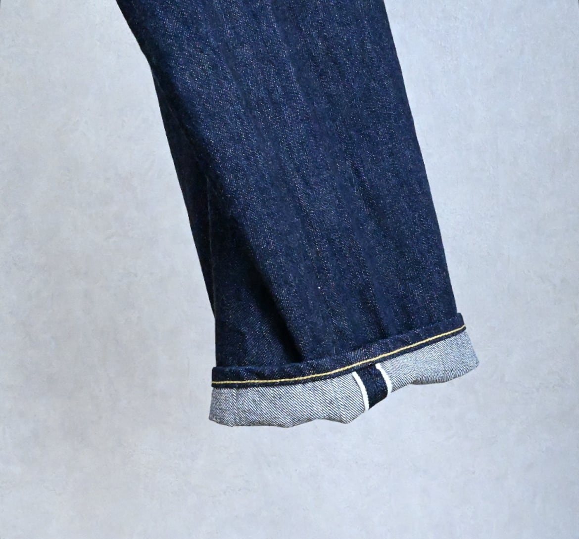 最近のデニムでは一般的なスキュー加工(ねじれ防止)を敢えてかけない事で、穿き込むでねじれが生じ、ビンテージライクな味が生まれることが狙い。