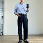 スラックスライクなデニムパンツをコンセプトにしたデニムスラックスとは対照的に、股上が深く中太、ほぼストレートシルエットの「WORK」顔が特徴です。