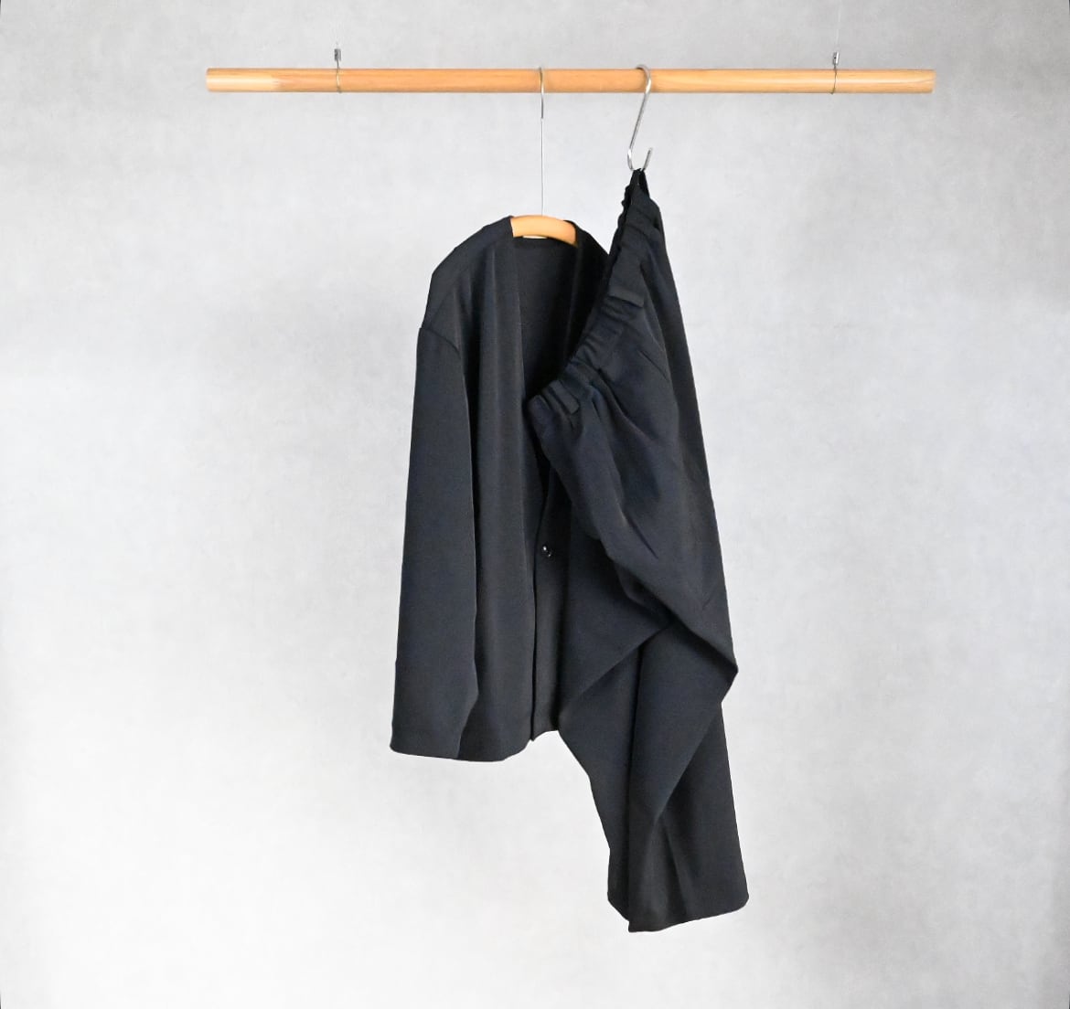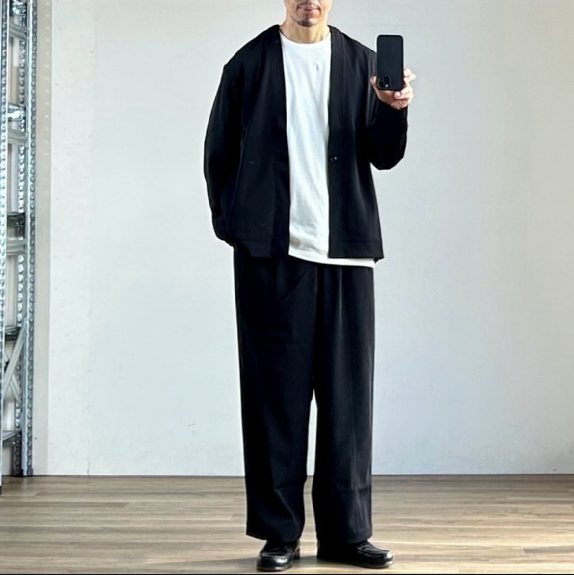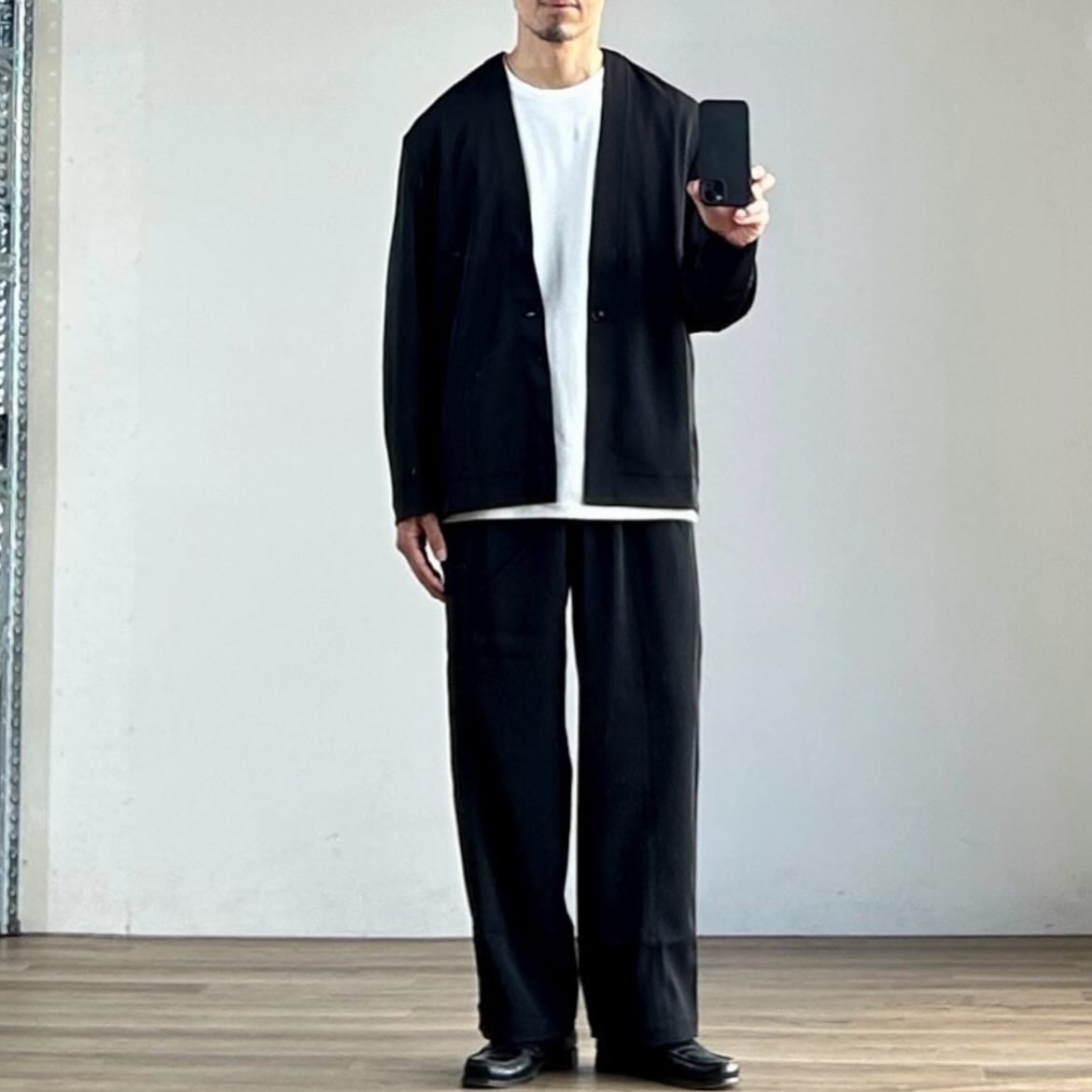 上品なウールのような微光沢感と、オチ感が高級感を演出してくれる超強撚のストレッチツイル素材を使用したノーカラージャケットとワイドパンツのセットアップです。