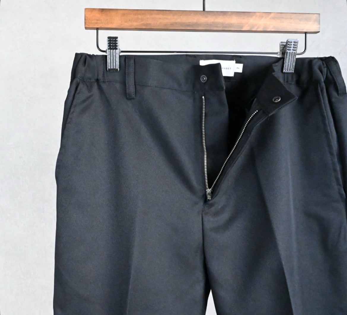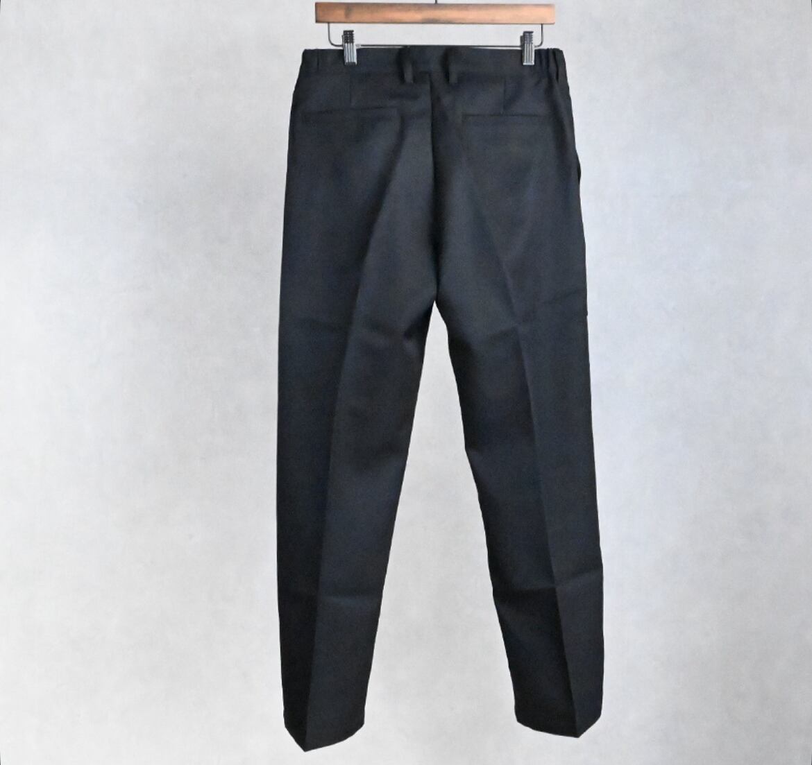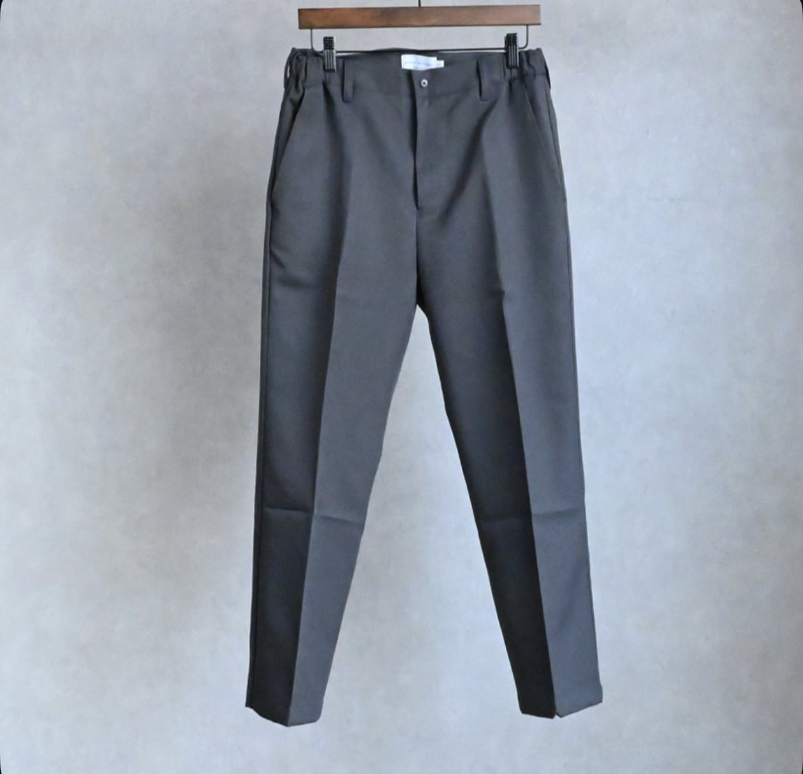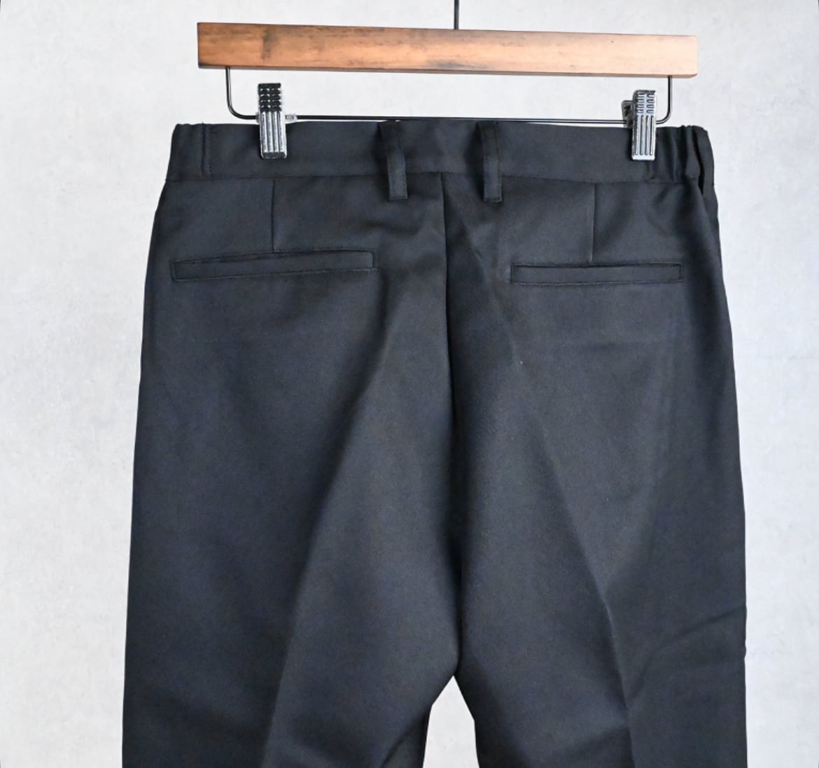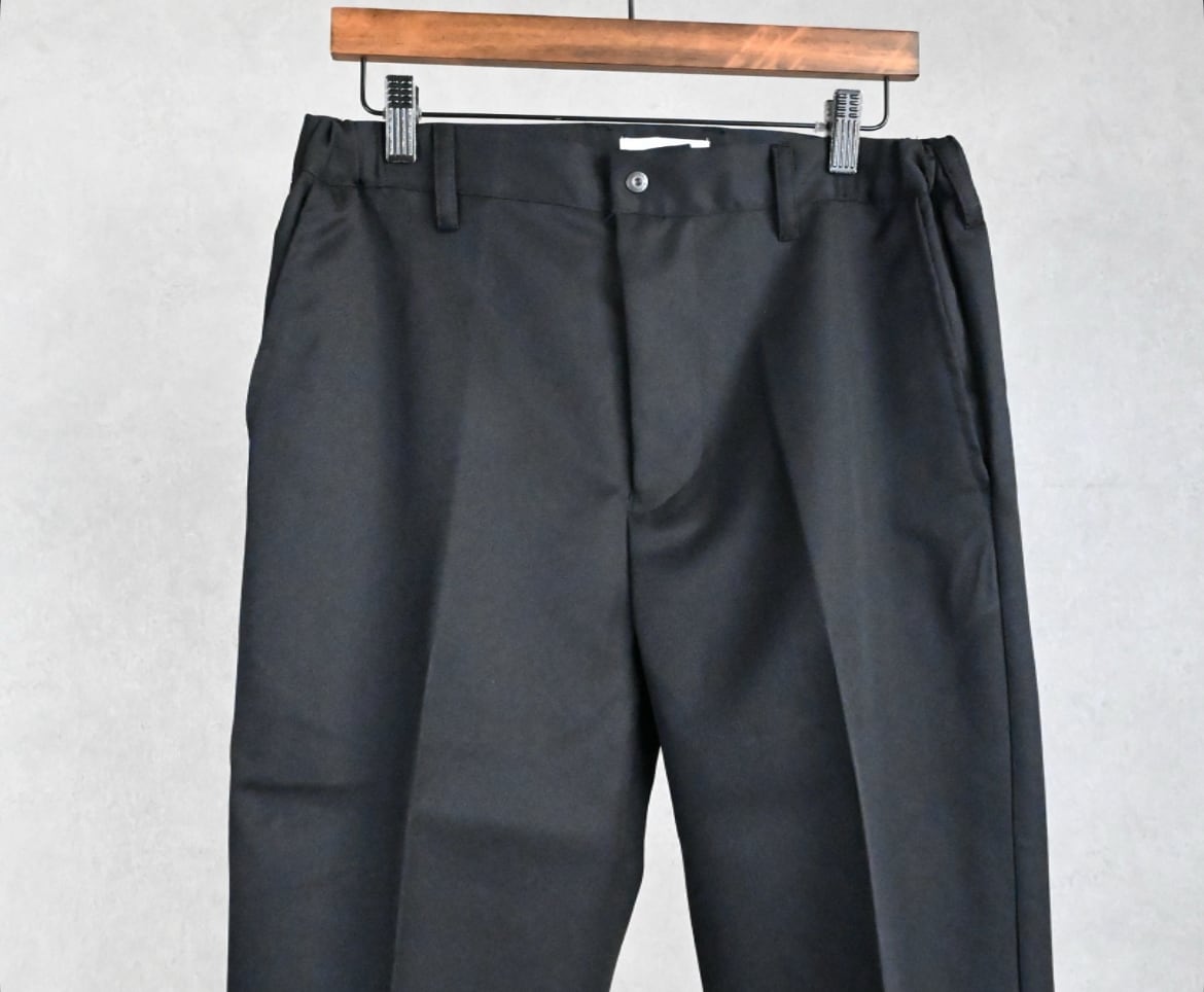 両サイドにゴムが入っているので、ベルトなしでも穿ける気軽さと、センタープレスが入ることにより生まれるスラックスならではの佇まいが魅力です。またフロントボタンにドットボタンを採用しているので着脱も◎。