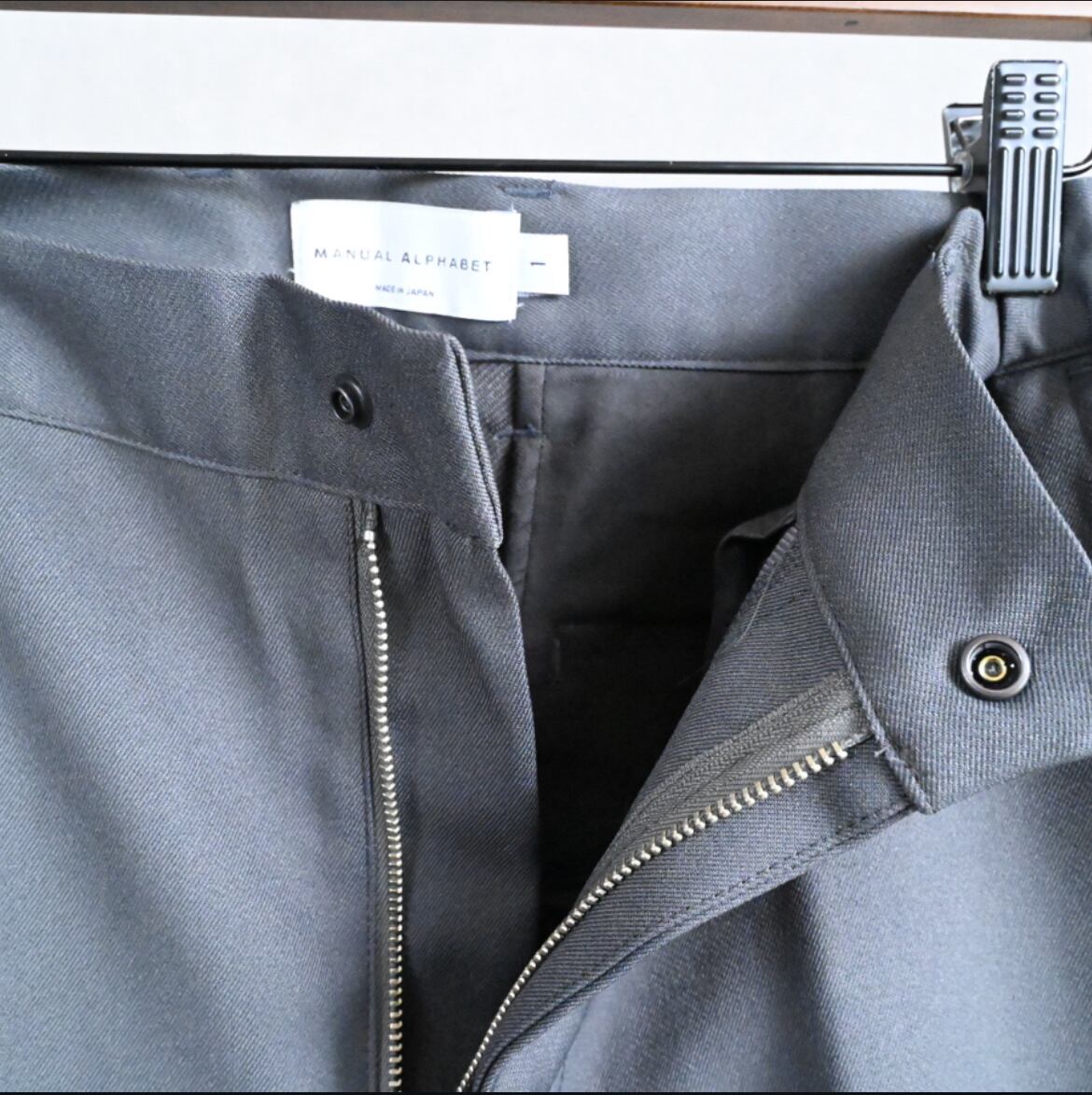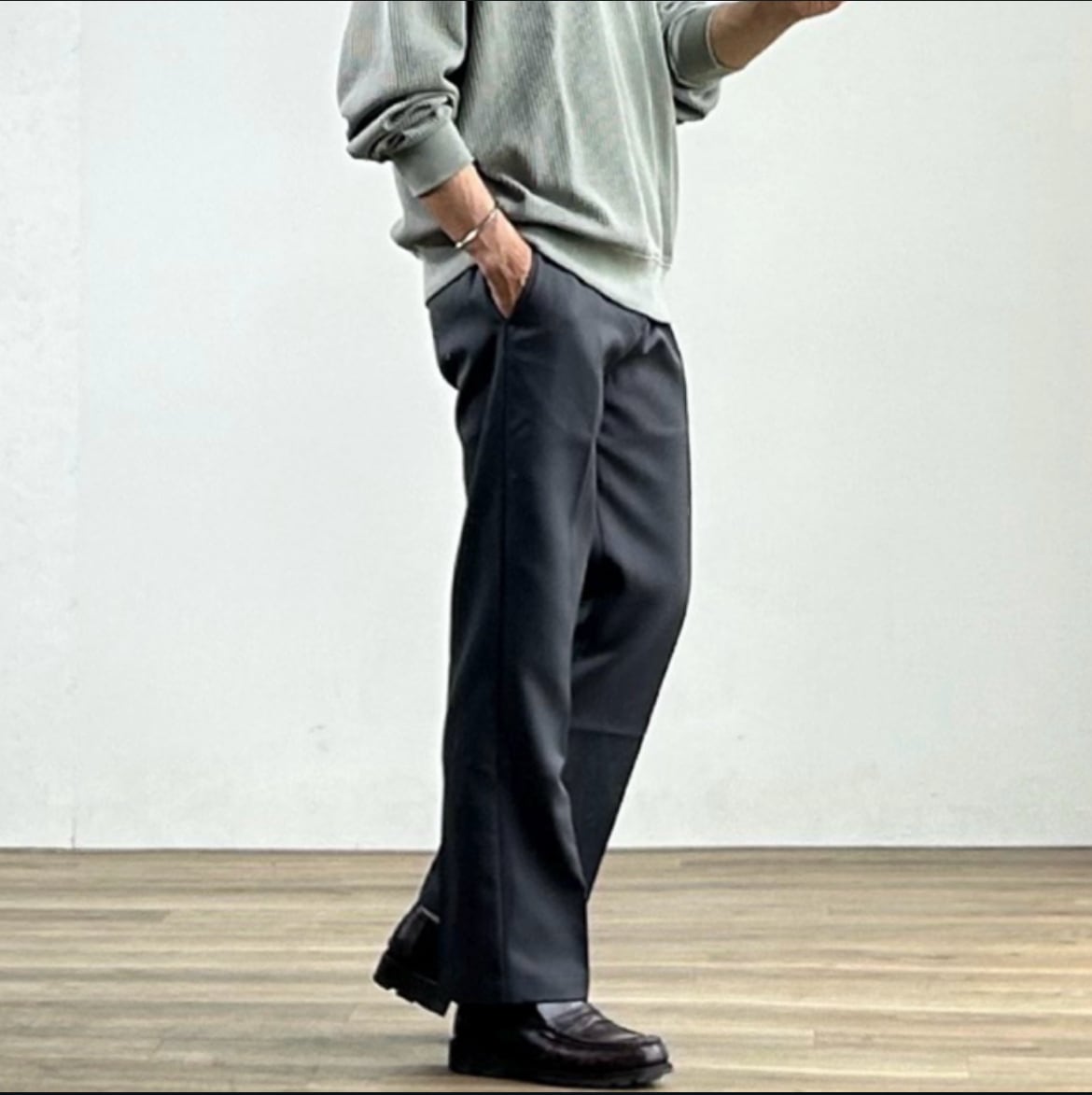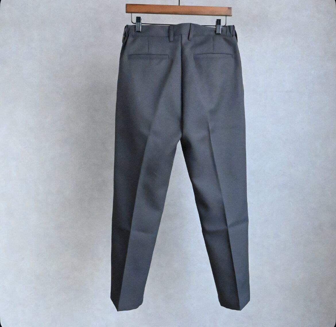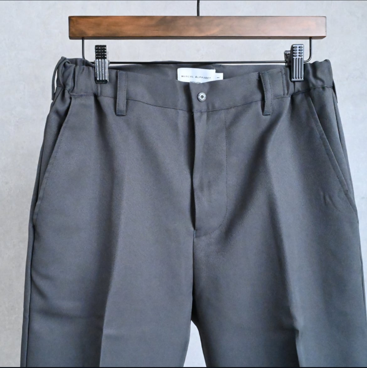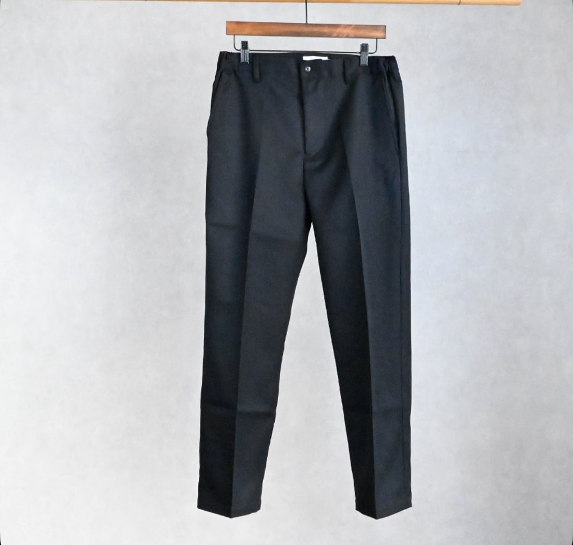 両サイドにゴムが入っているので、ベルトなしでも穿ける気軽さと、センタープレスが入ることにより生まれるスラックスならではの佇まいが魅力です。またフロントボタンにドットボタンを採用しているので着脱も◎。