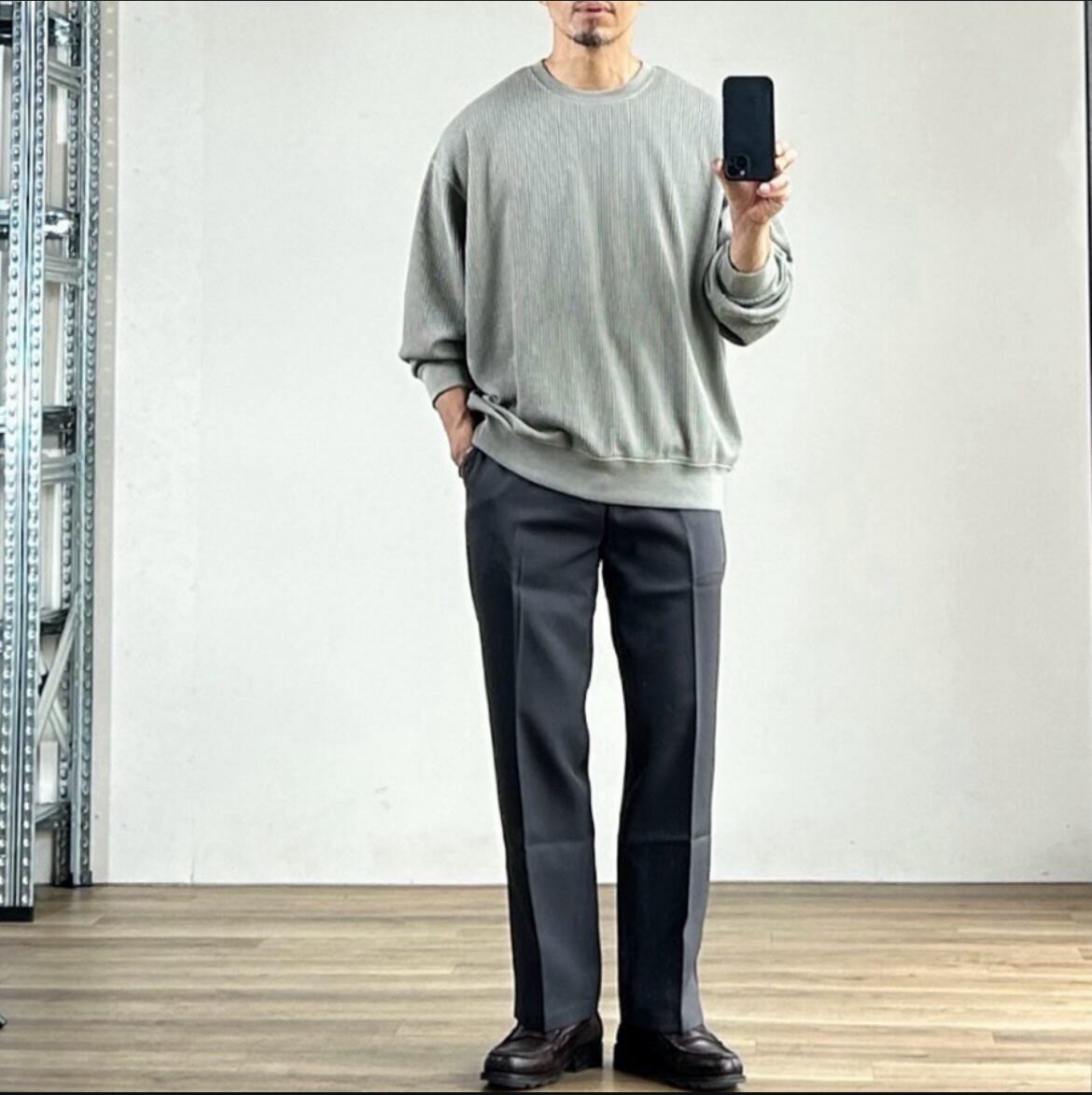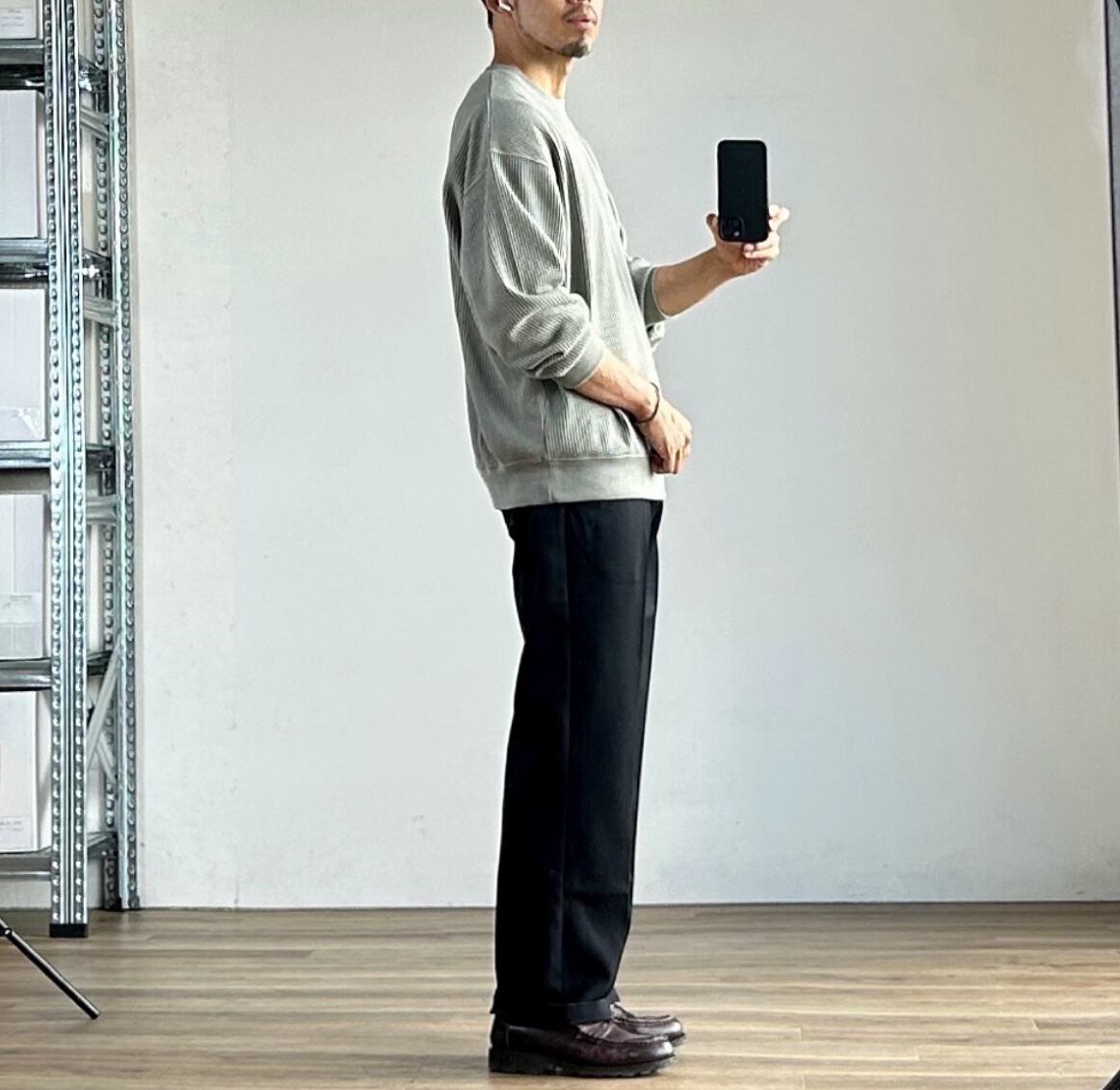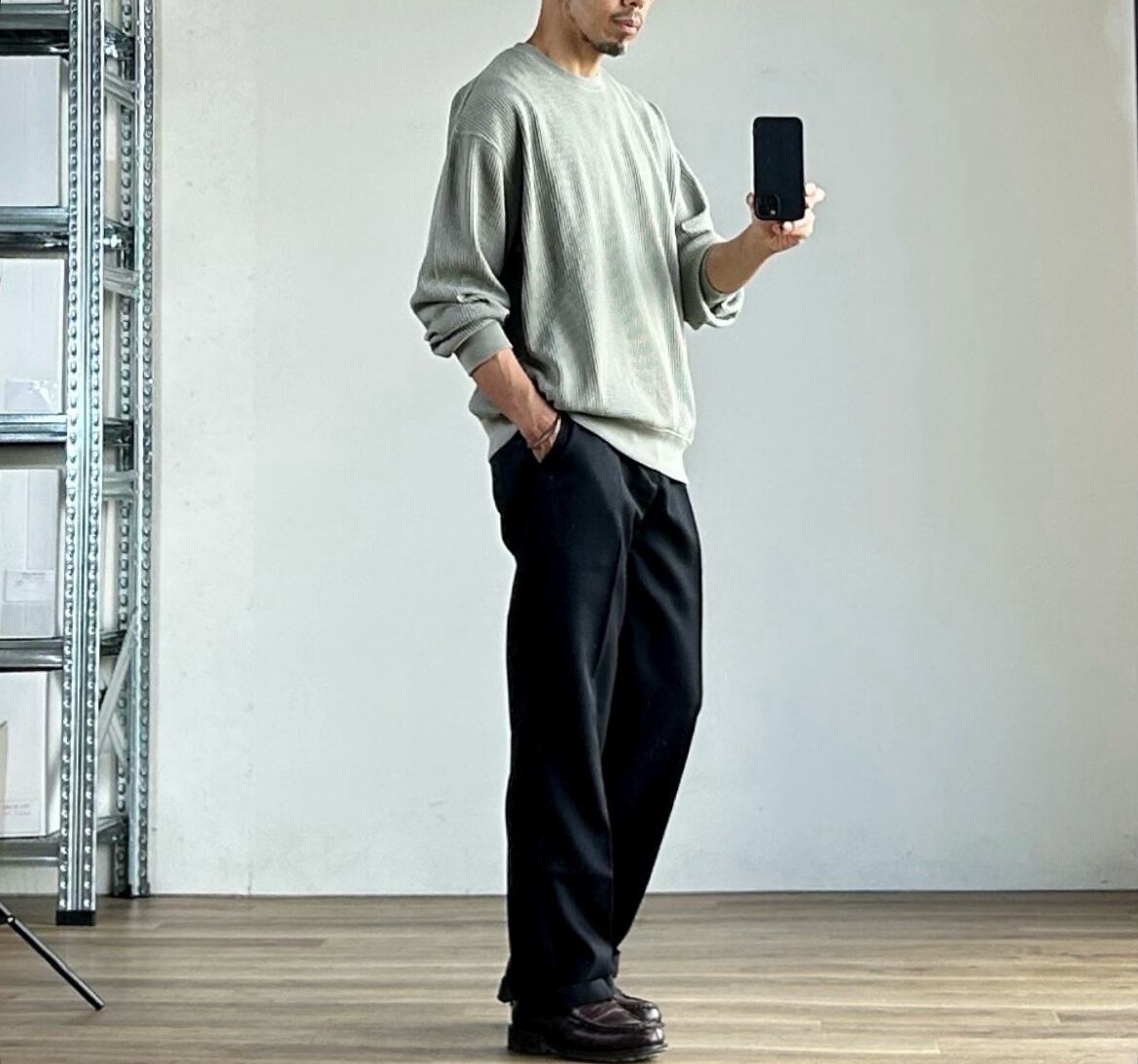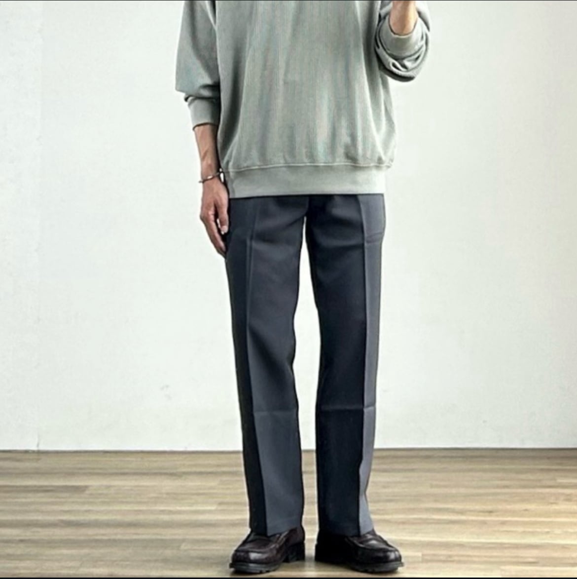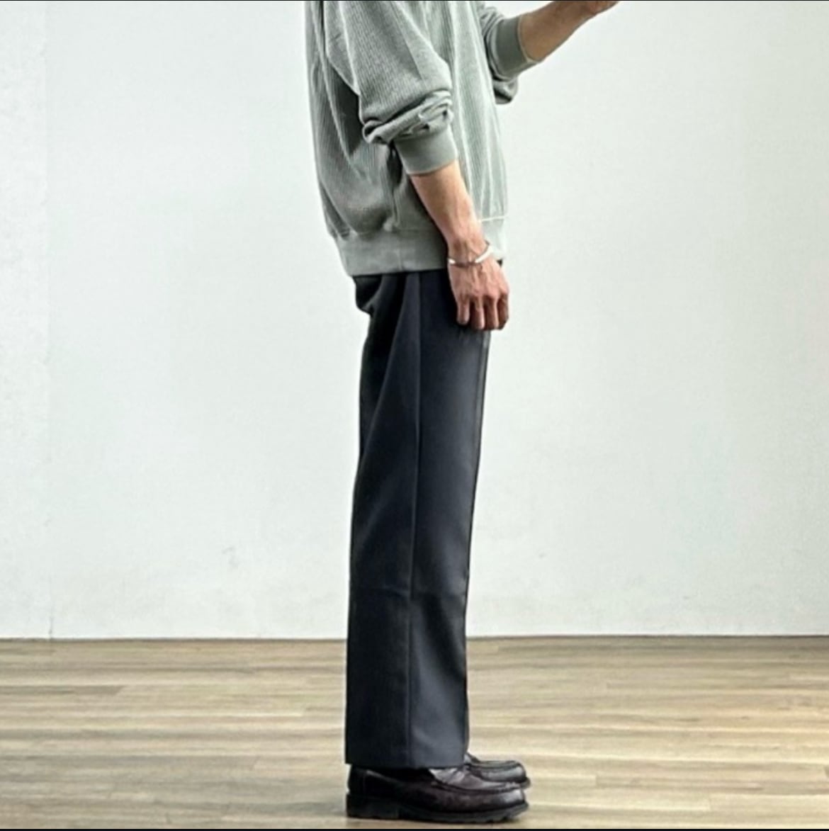 両サイドにゴムが入っているので、ベルトなしでも穿ける気軽さと、センタープレスが入ることにより生まれるスラックスならではの佇まいが魅力です。またフロントボタンにドットボタンを採用しているので着脱も◎。