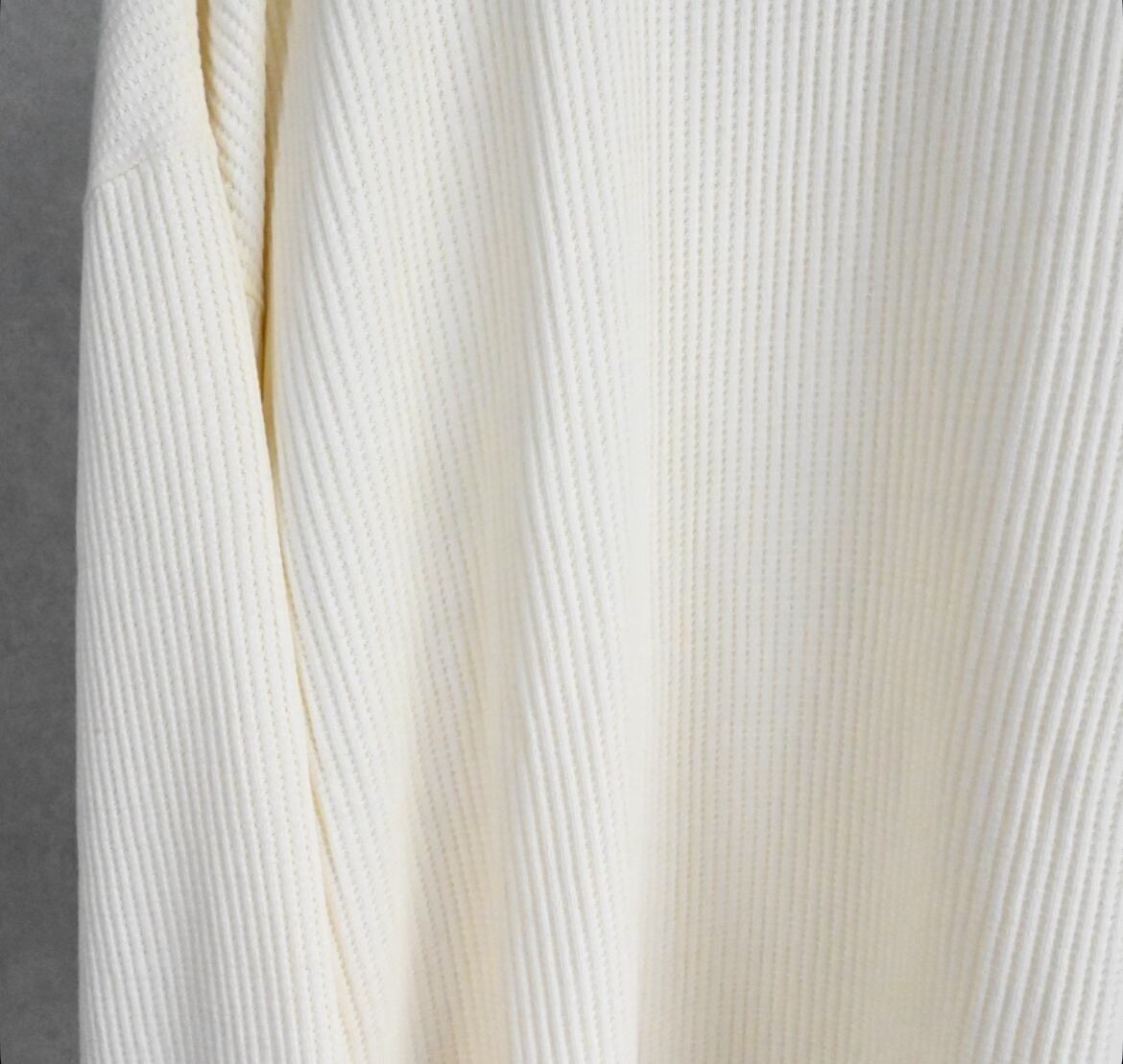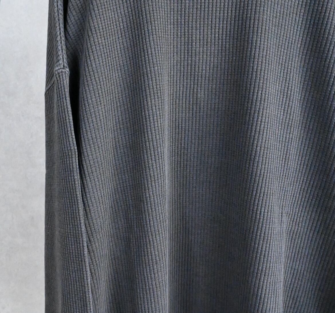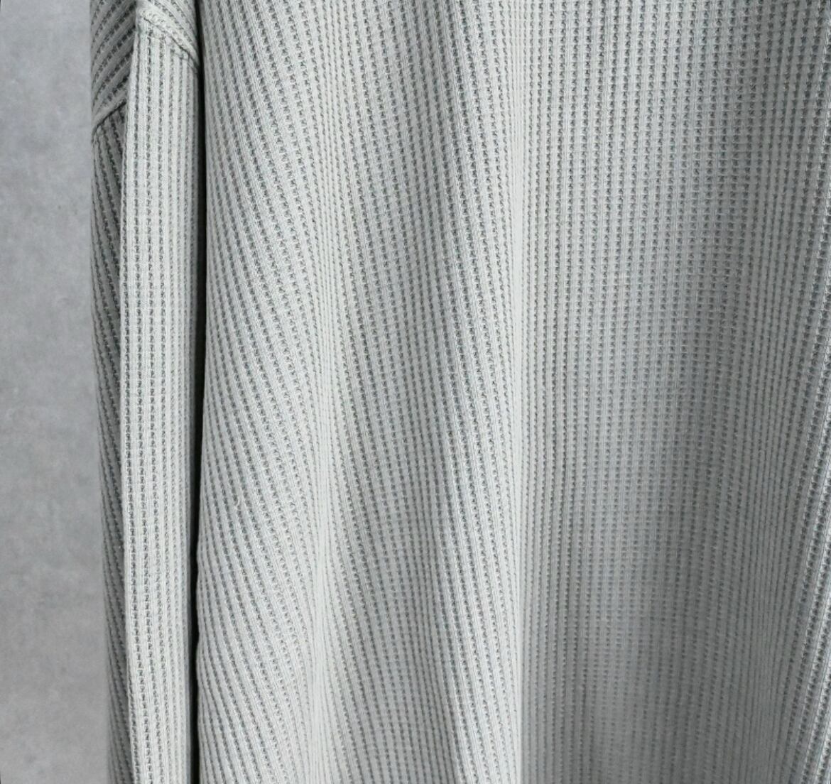 いわゆるサーマルTで、サーマルというと肌寒くなってから活躍するアイテムのイメージが強いかもですが、程よい厚みのワッフル生地は、秋の立ち上がりからロンT感覚で使える一枚です。