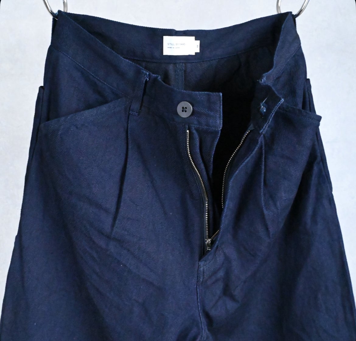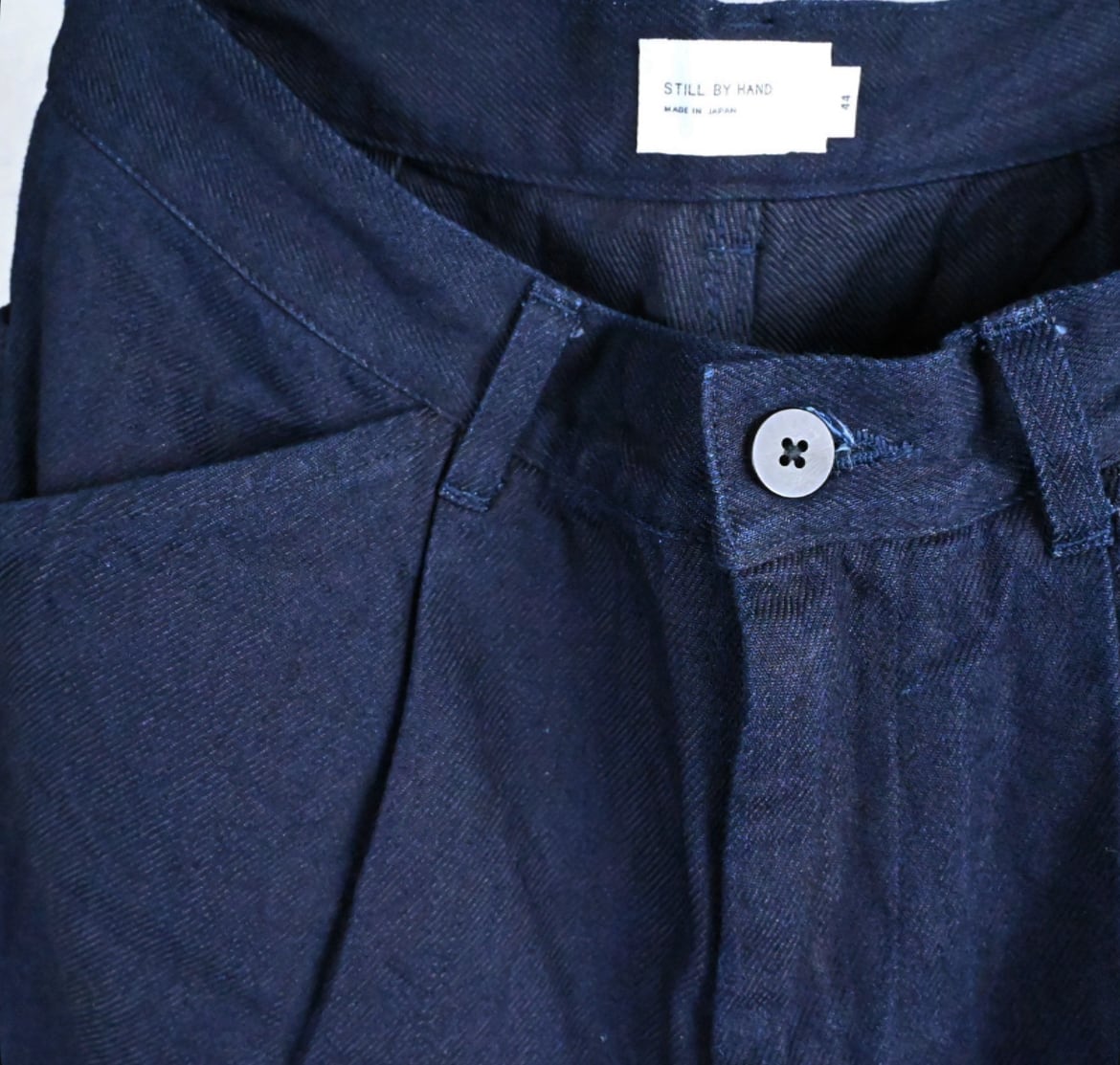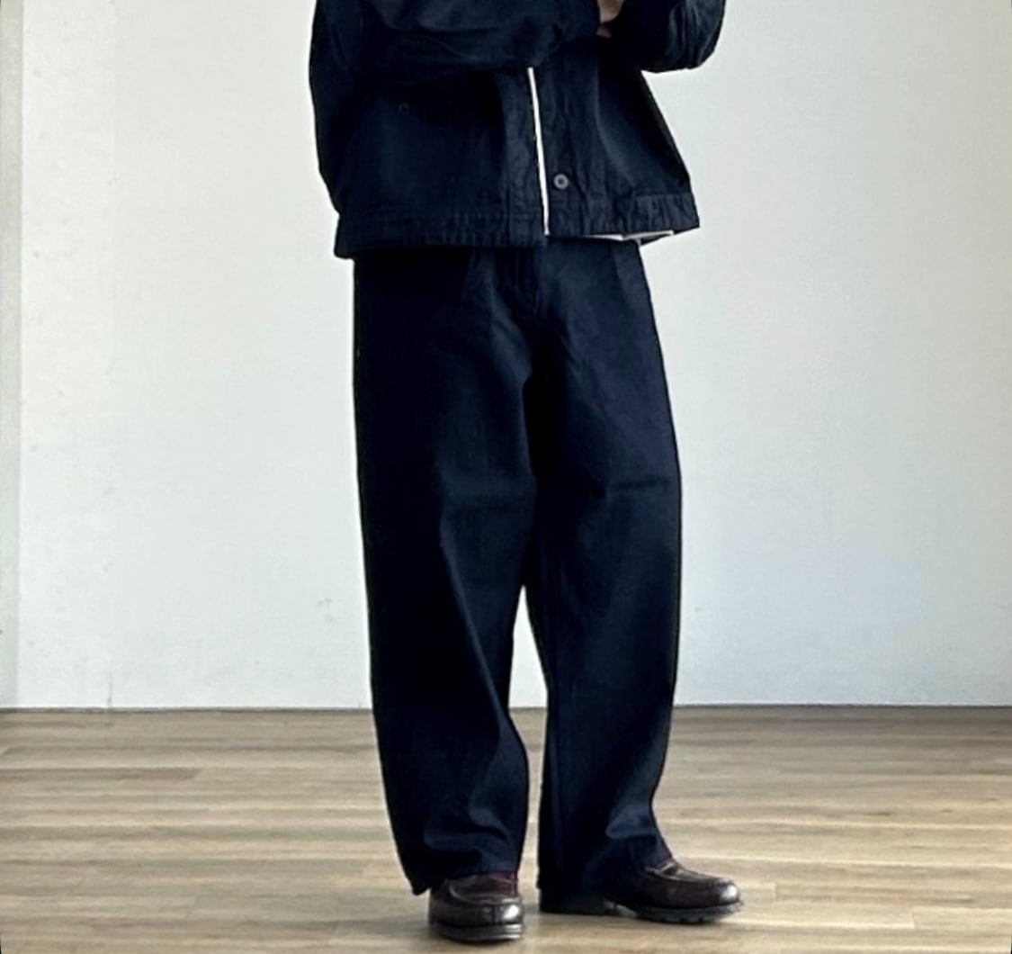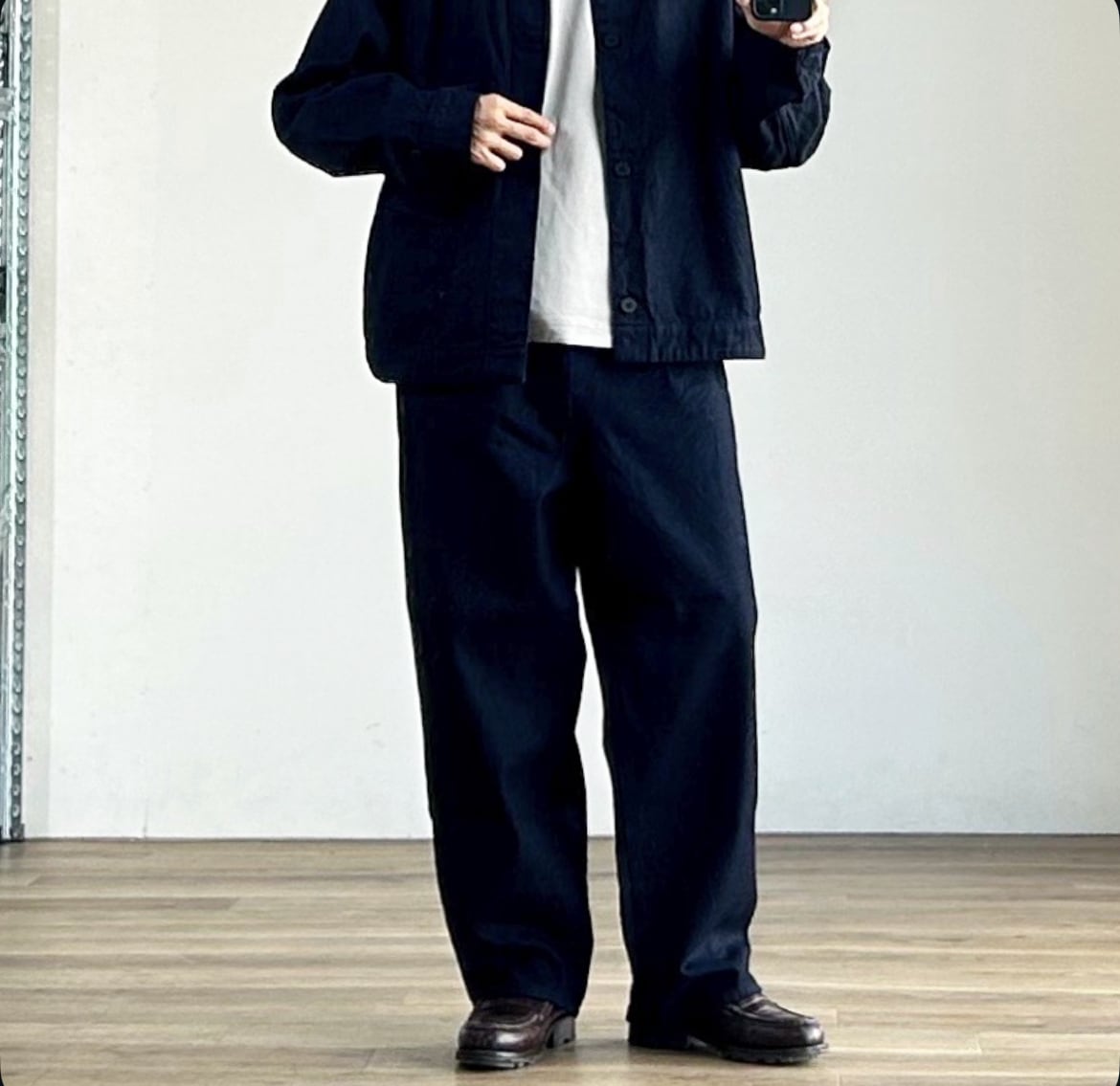 ☑️縦糸インディゴ × 横糸チャコールが生む、深みのあるダークネイビーが魅力で、ジャケット同様、経年変化で色に奥行きが生まれ、長く育てる楽しみも。