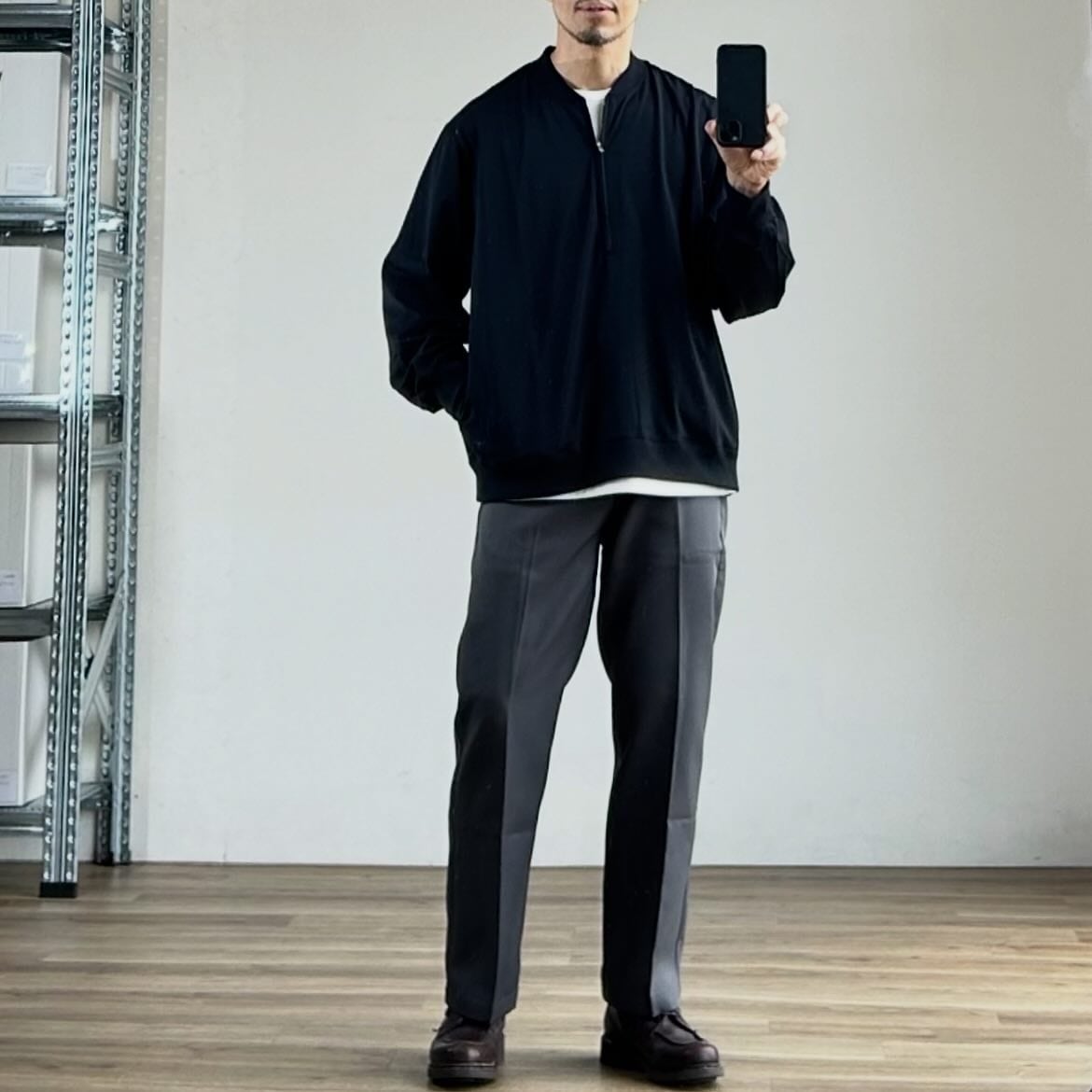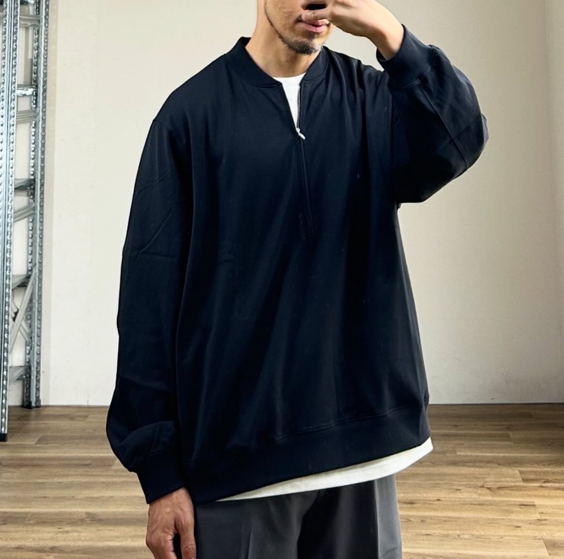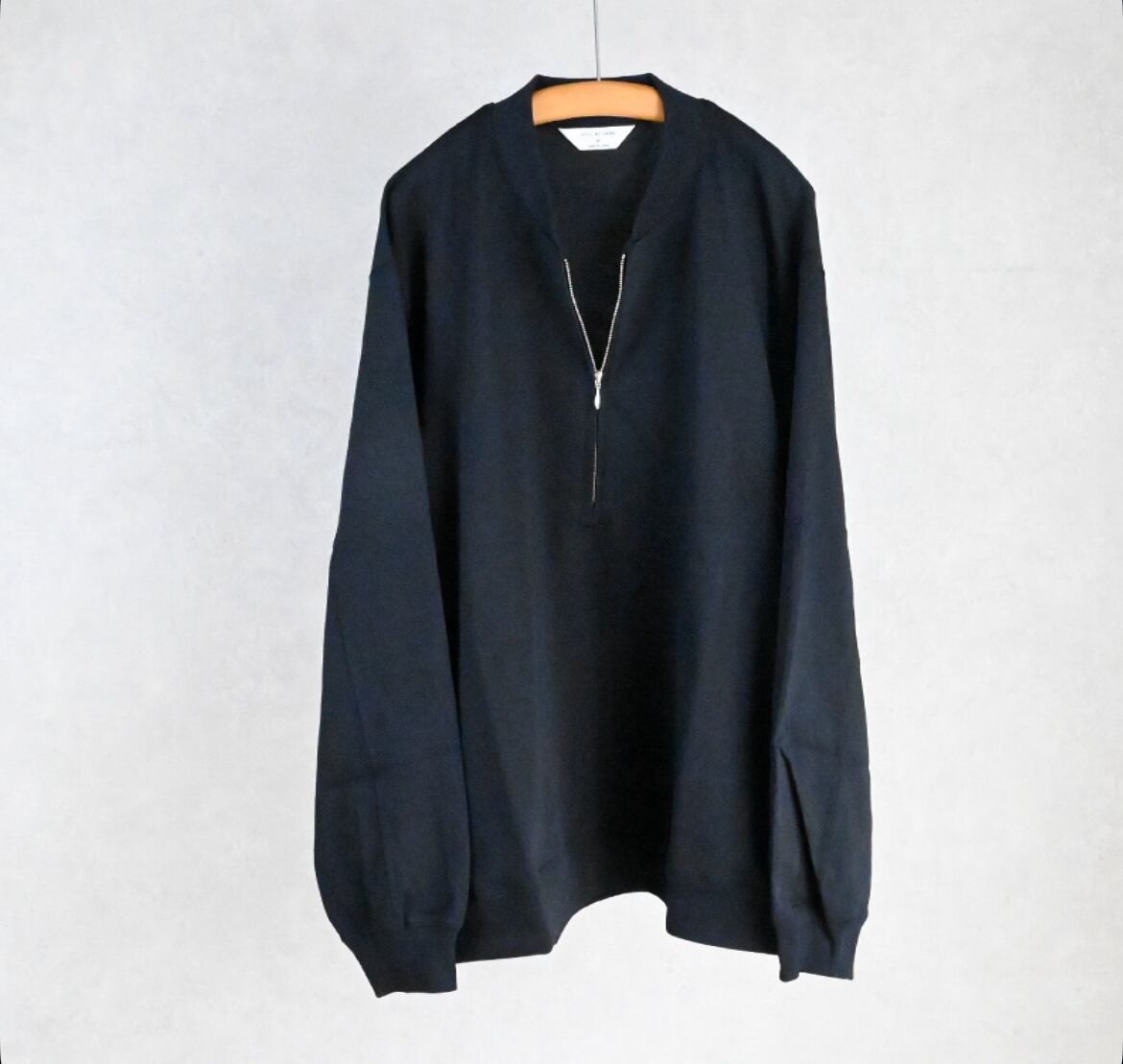 ハーフジップと脇ポケットを備えたデザインは、カットソー素材のアノラックのような佇まいで、ファッション性と実用性を両立しています。