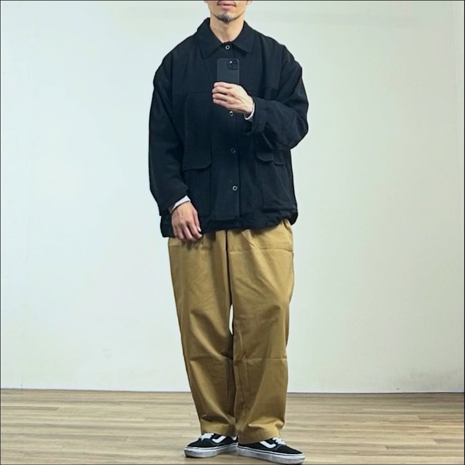サイドラインにふくらみを持たせたコクーンシルエットが特徴で、ポケットに手を入れた瞬間に完成する丸みは、計算し尽くされたパターンだからこそ生まれる独特の立体感です。