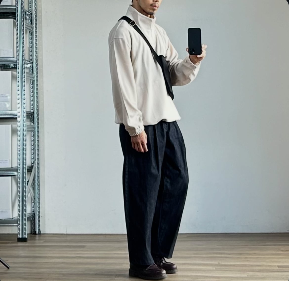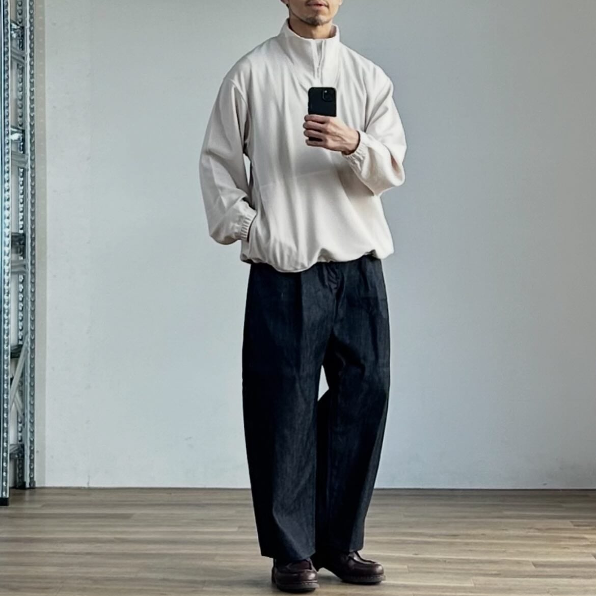 生地感の軽さもあって、「ハイネック=重たい」というイメージを覆す、新鮮なバランスを提供してくれます。