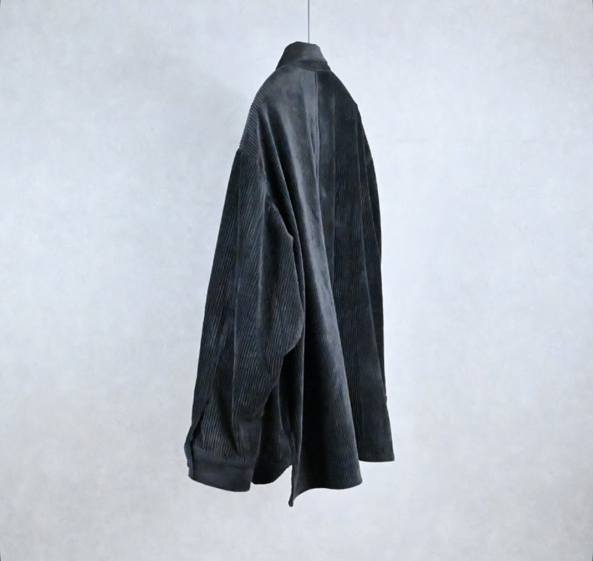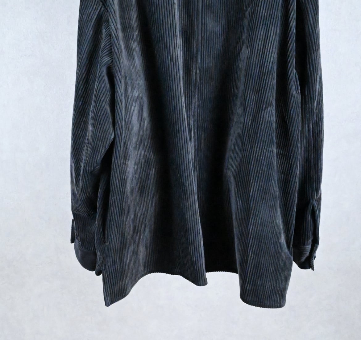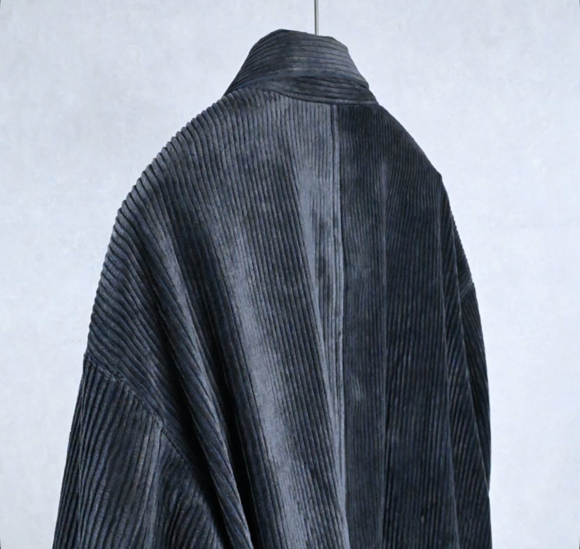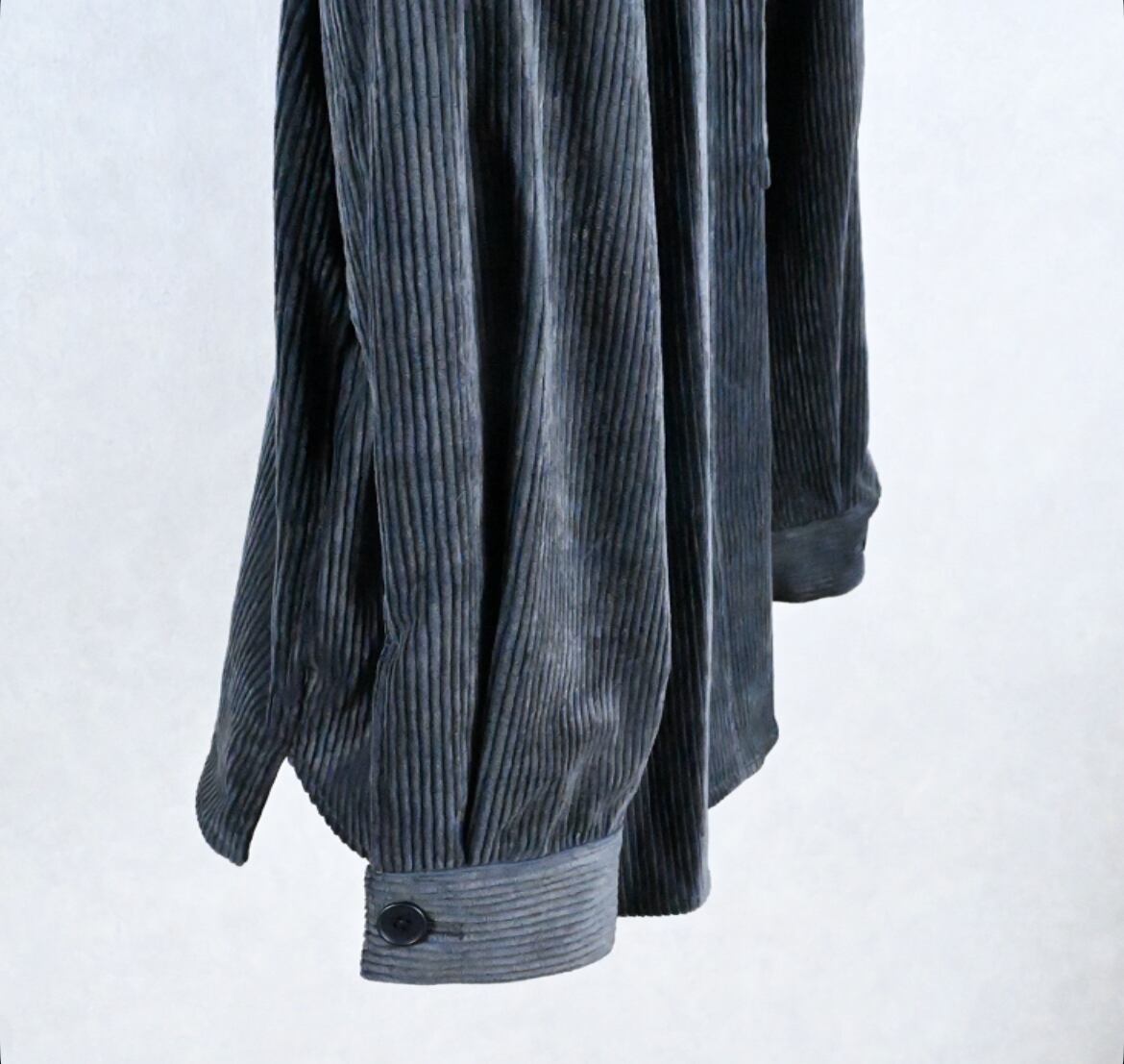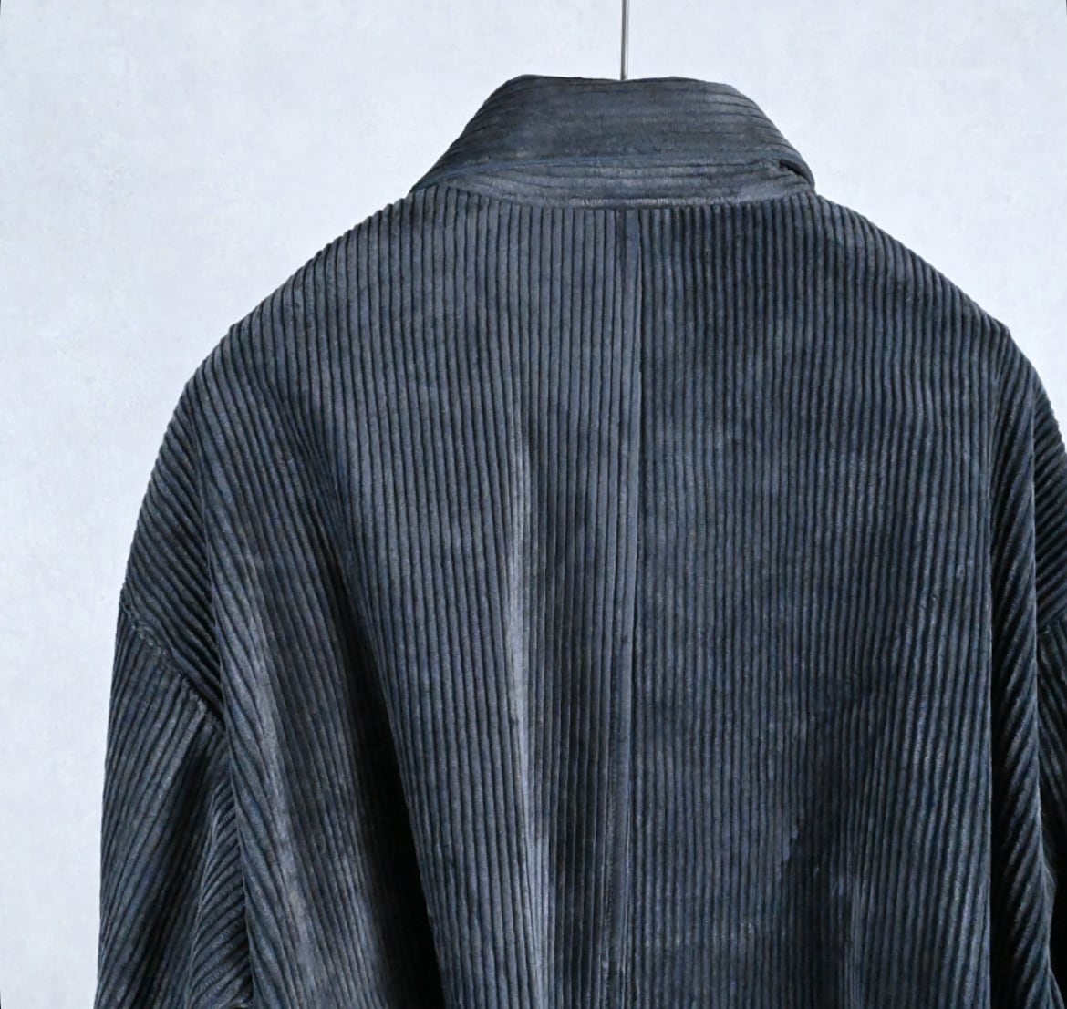 綿レーヨンの混紡糸を用いた太畝コーデュロイは、ふんわりとした質感に加えて、独特の落ち感とトロみが生み出す上品な表情が魅力。サッと羽織るだけで抜群のこなれ感を演出してくれます。