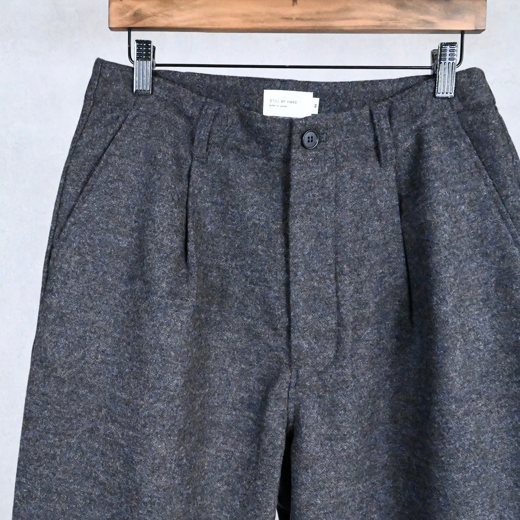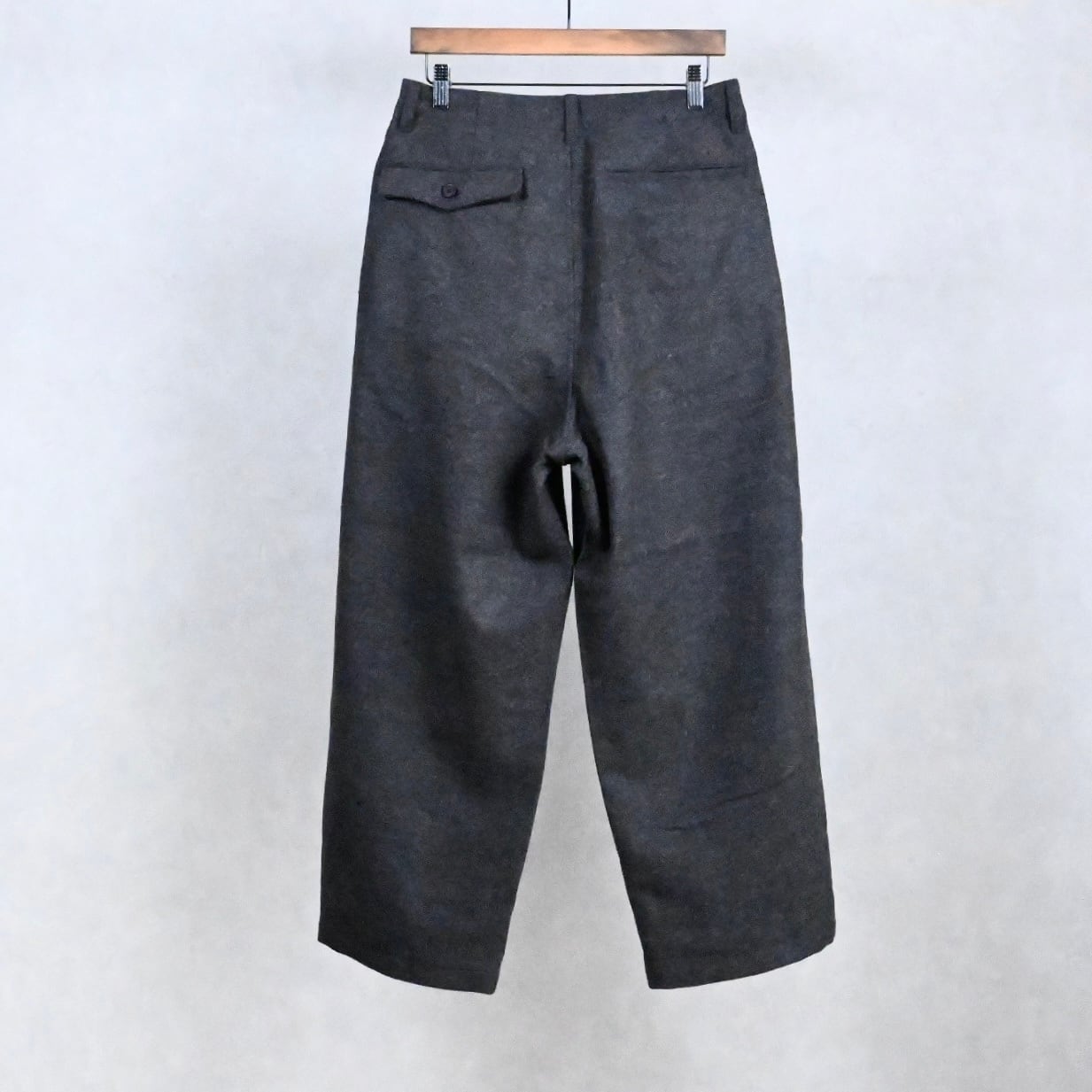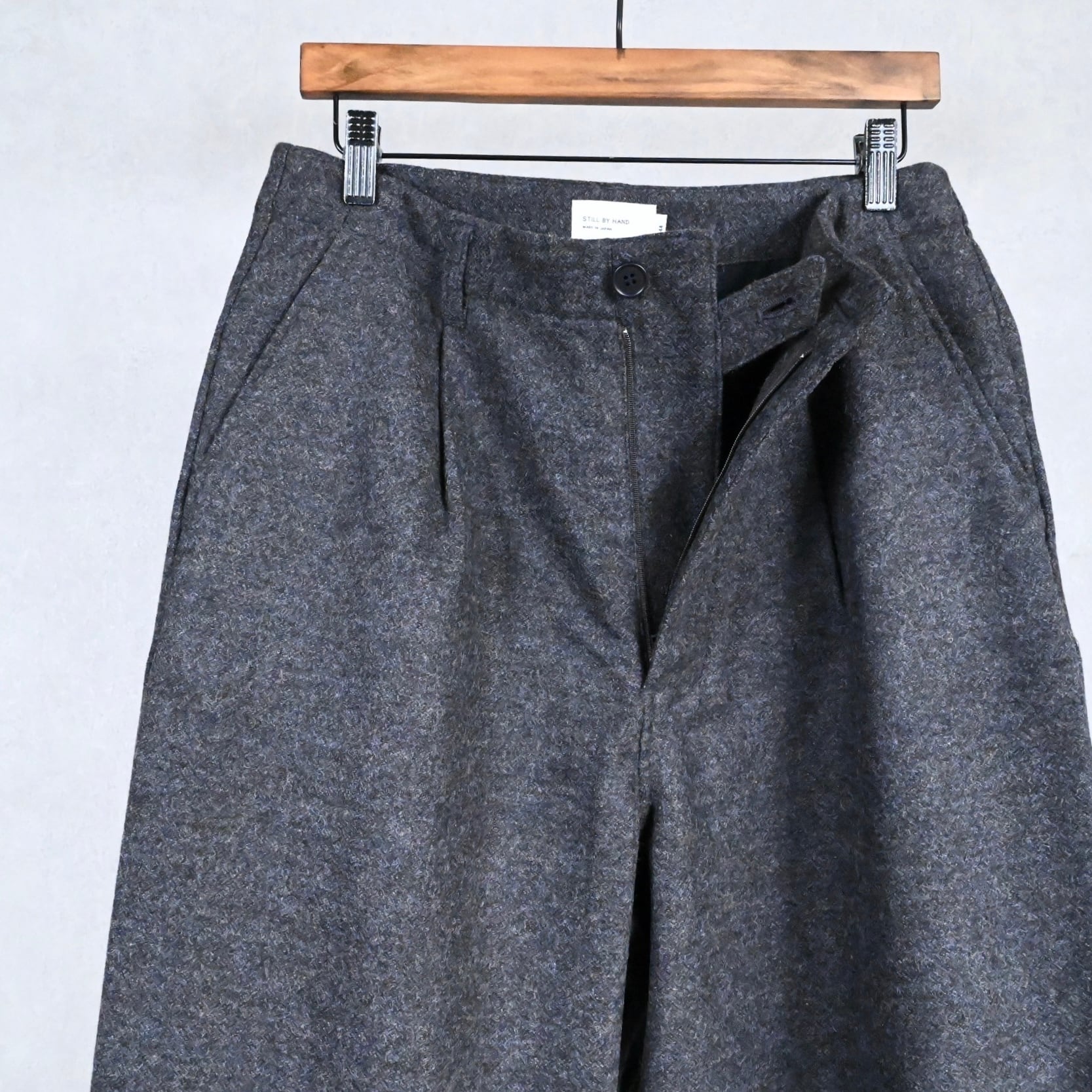 尾州の機屋さんが別注で作った糸を使用して作成したオリジナルのツイードライクな生地。柔らかく織っているため滑らかなタッチで落ち感もある縮絨風合いに仕上げました。