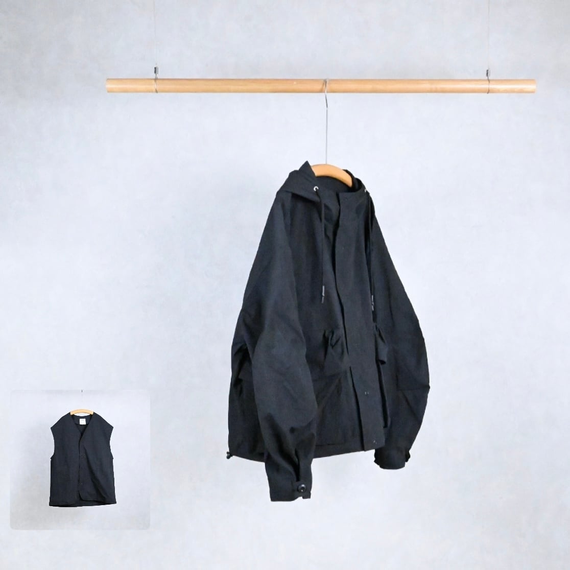 がさっとした質感が魅力の綿ポリエステル・ウェザー素材を使用した、ジャケット&ベストの2セットアウター。