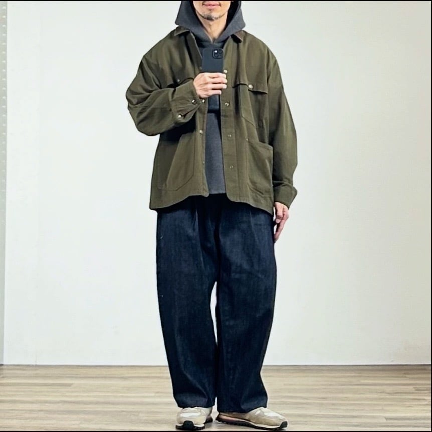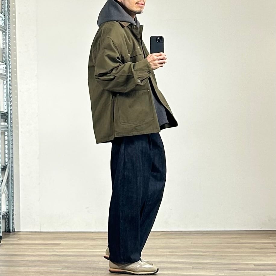 僕の体型だとSサイズが適正ですが、着用サンプルはデニムのボリュームに合わせてMサイズをゆったりと着用しています。