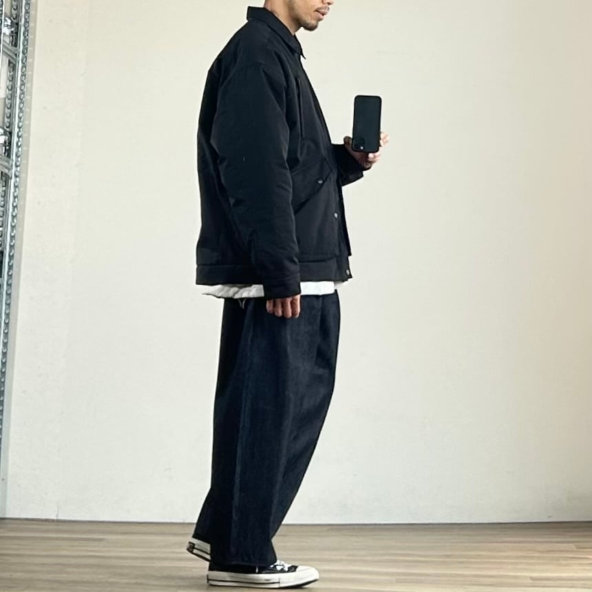 KELENらしいオーバーシルエットに加え、生地に適度なハリ感がある分、しっかりとボリュームの出るシルエットで、僕の体型だとワイドパンツを合わせた方が全体のバランスが取りやすい印象です。