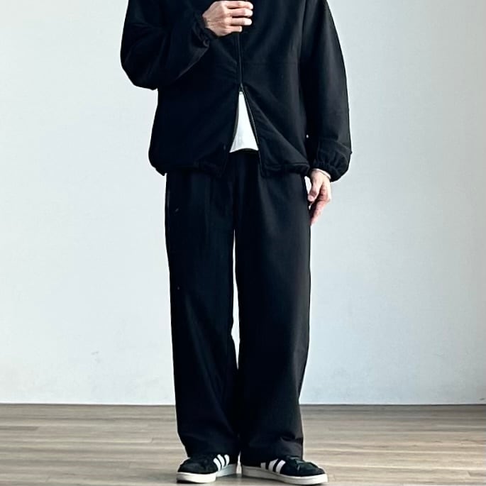 単体使いでも抜群の汎用性ですが、同素材のスタンドネックブルゾンと合わせれば、リラックスしながらも品よく整ったセットアップスタイルが完成。