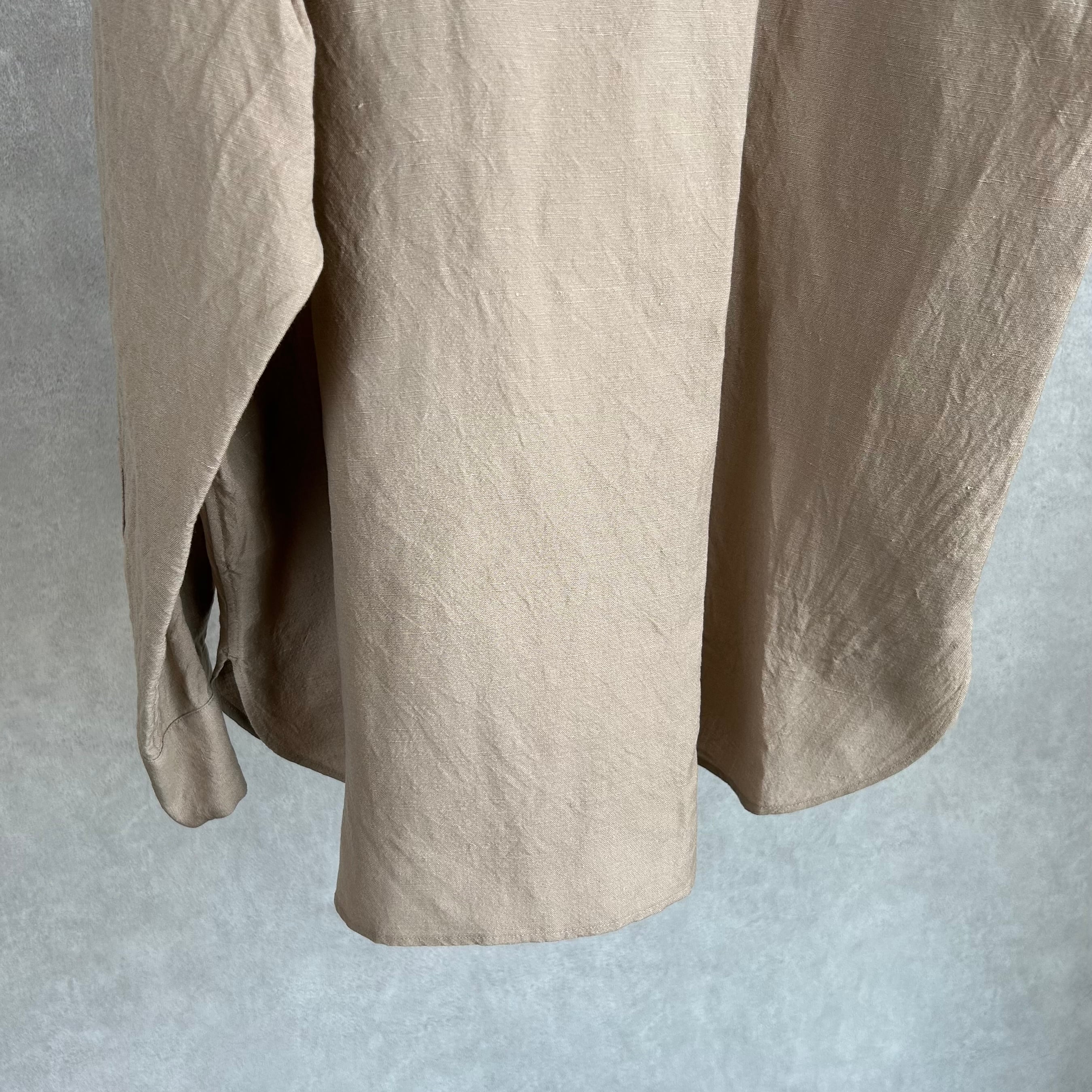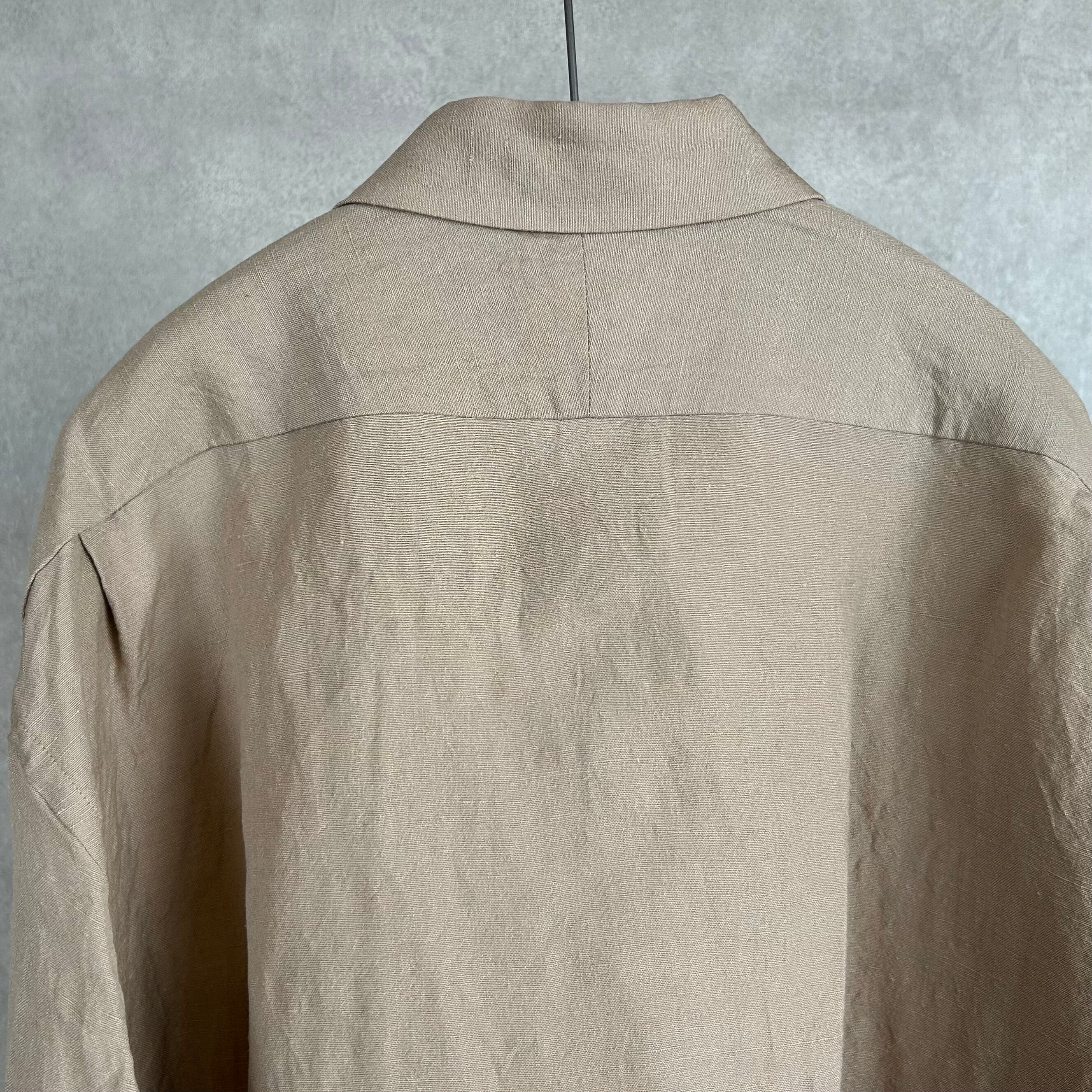 リネン特有の節感を残しつつ、梳毛糸を使用することでシワ感を抑え、上品な光沢を感じられる仕上がりに。