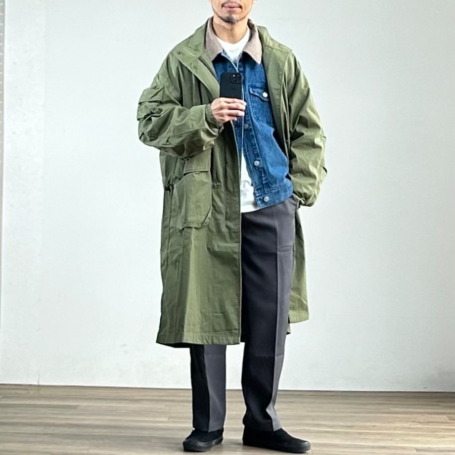 ミドルレイヤーで使った時の見え方が気になって、同じくKELENおすすめのモッズコートとレイヤードしてみました。