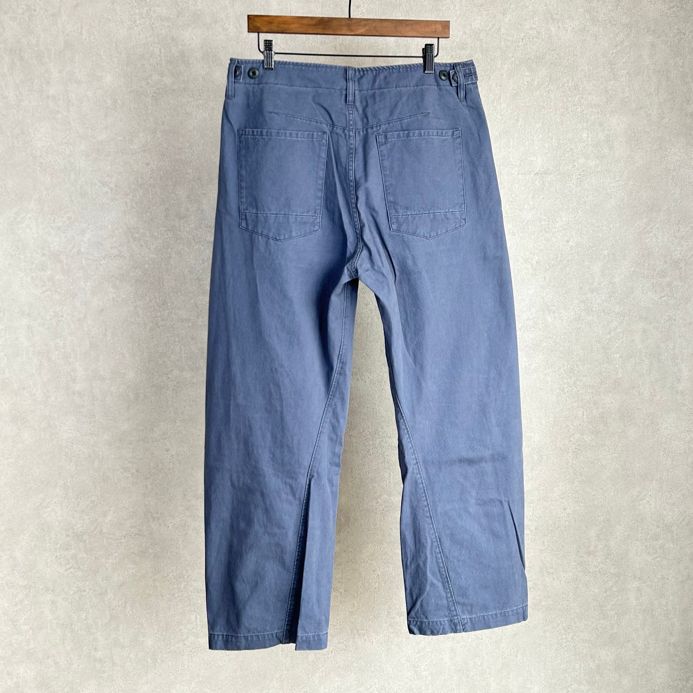 正直、僕自身あまりブルーのトラウザーをセレクトすることは多くないのですが、こちらは少し燻んだような、柔らかさを含んだブルー。主張はあるけれど強すぎない。そのバランスが絶妙で、「これなら穿きたい」と素直に思えた一本です。