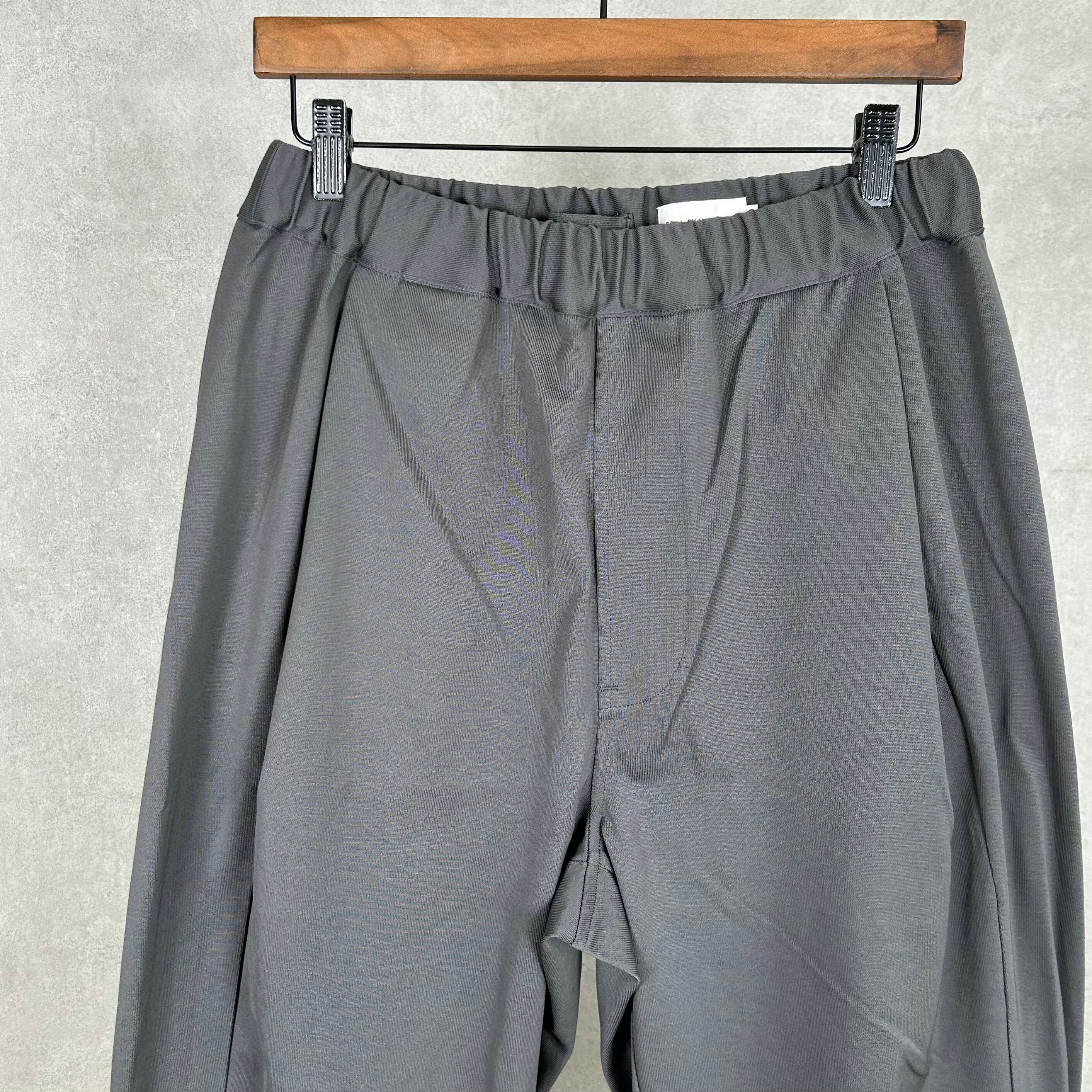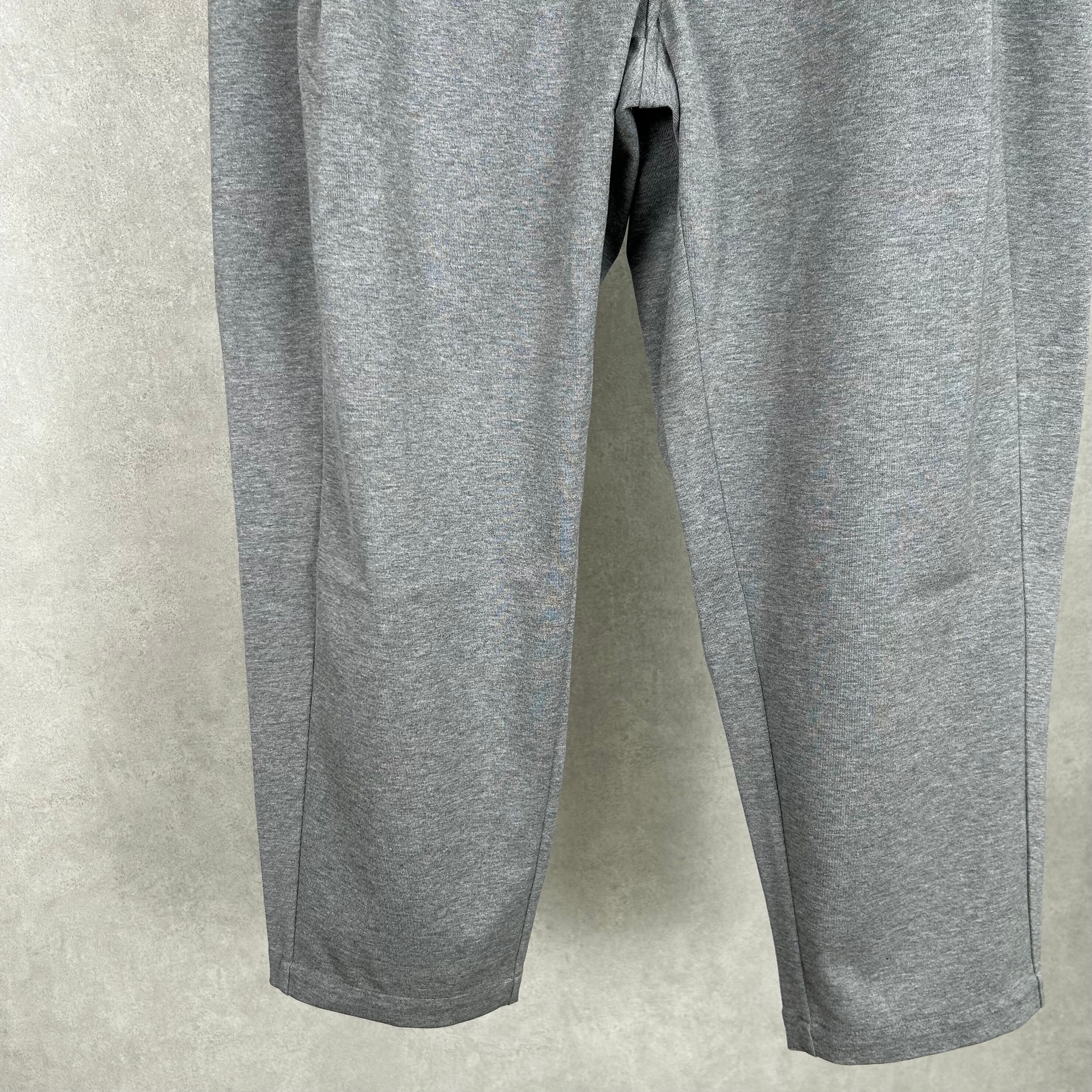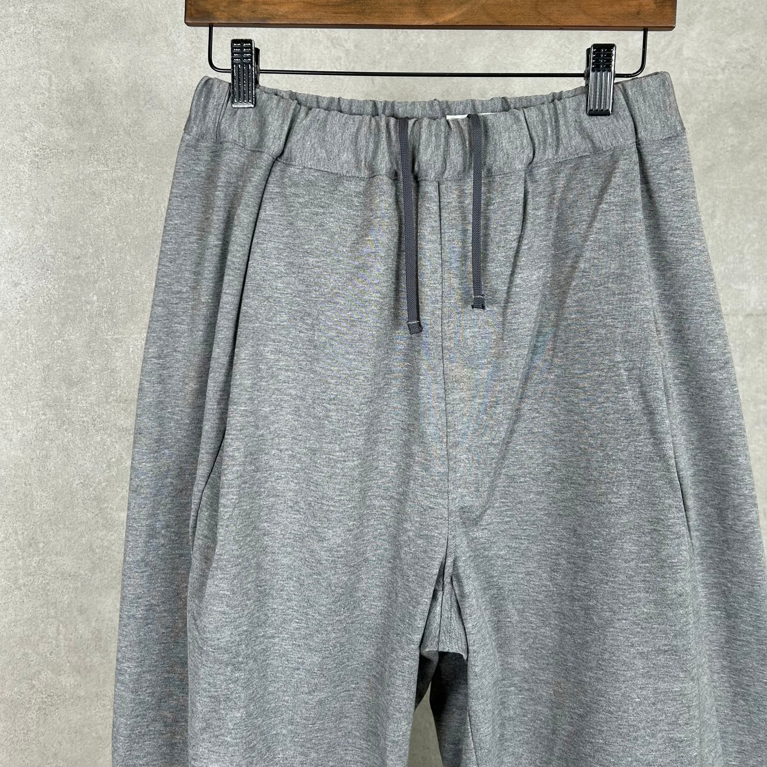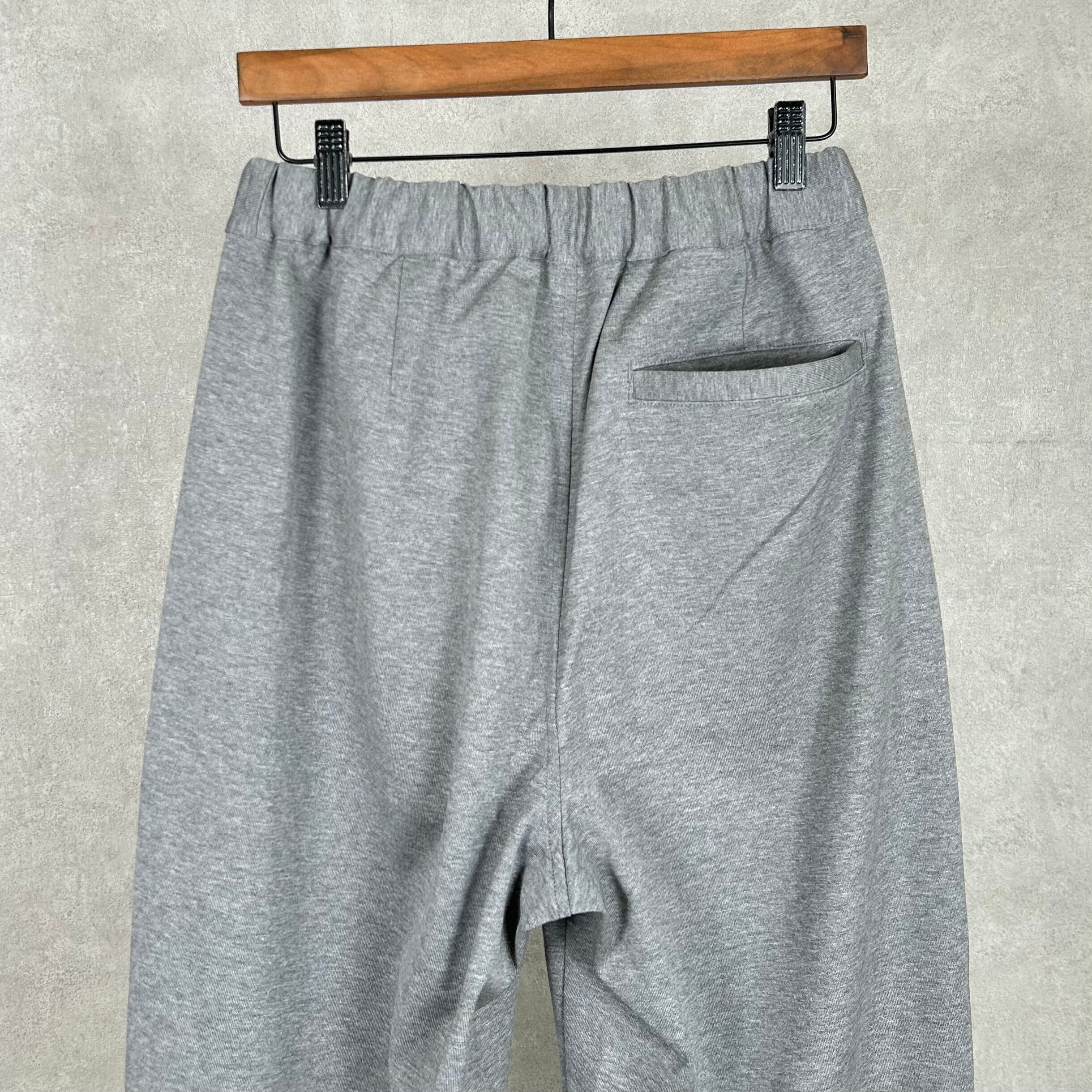 いわゆる「綺麗に穿けるスウェットパンツ」という視点で見ると、とてもバランスの良い仕上がり。カットソー素材のラフさはありつつも、すっきりとしたシルエットとクリーンな表情のおかげで、シャツやジャケットなどの綺麗めなアイテムとも自然に馴染みます。