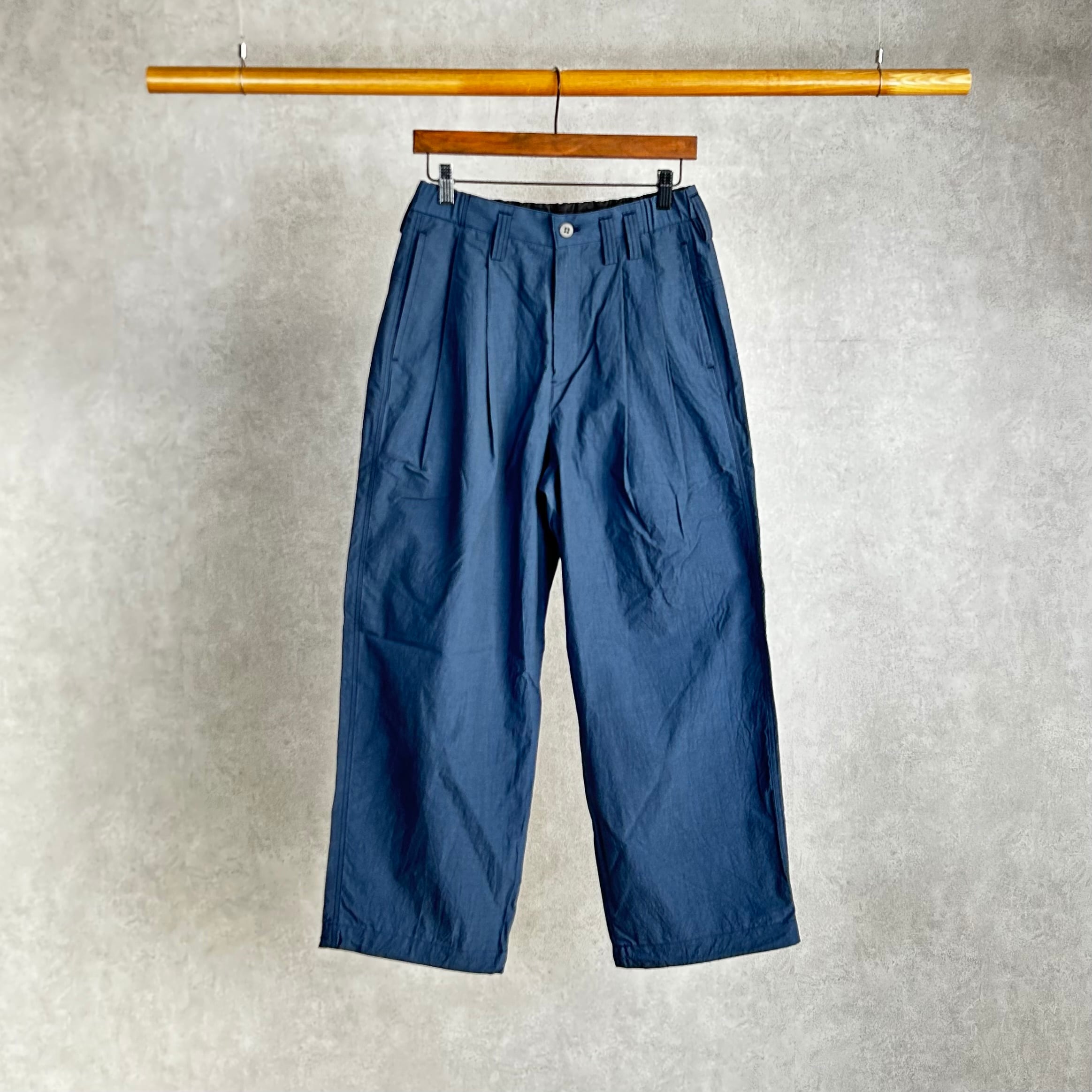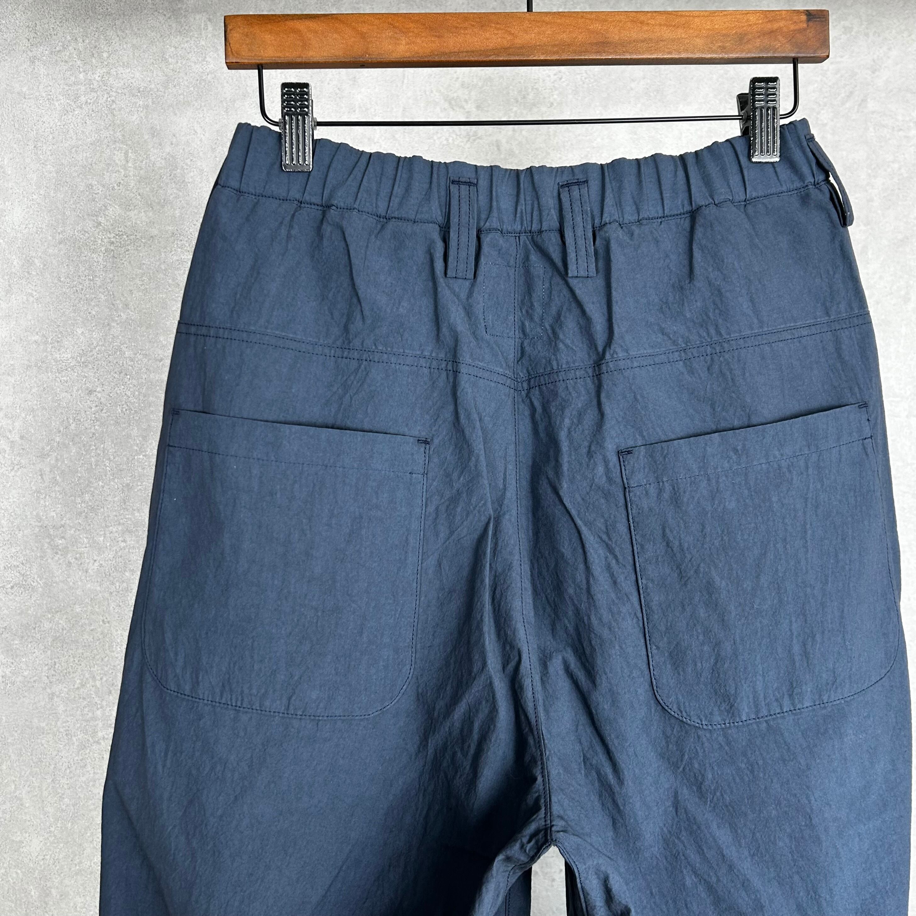 シルケット加工や晒加工を省き彩度を抑えるために直接染料で小さな染め釜を使い染めるグランジウォッシュ加工。染色後の乾燥は天日でおこなうため手間と時間がかかりますが生地へのダメージが少なく洗いざらしの自然な表情になります。カミナリ模様の細やかなあたりが特徴的で肌への接地面も少なく夏まで快適に着用できる素材です。デザインはゆったりとしたシルエットのバギー設計をベースにウエストゴムシャーリング、裾に裾巾調節用のゴムを配してシルエットに変化を作ることができる仕様にしました。