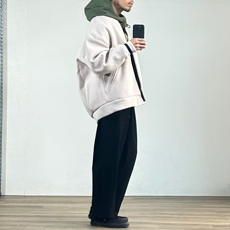 袖幅は過度に広くせず、全体としてはオーバーサイズでありながらもルーズに見えない、絶妙なバランスに仕上げられています。