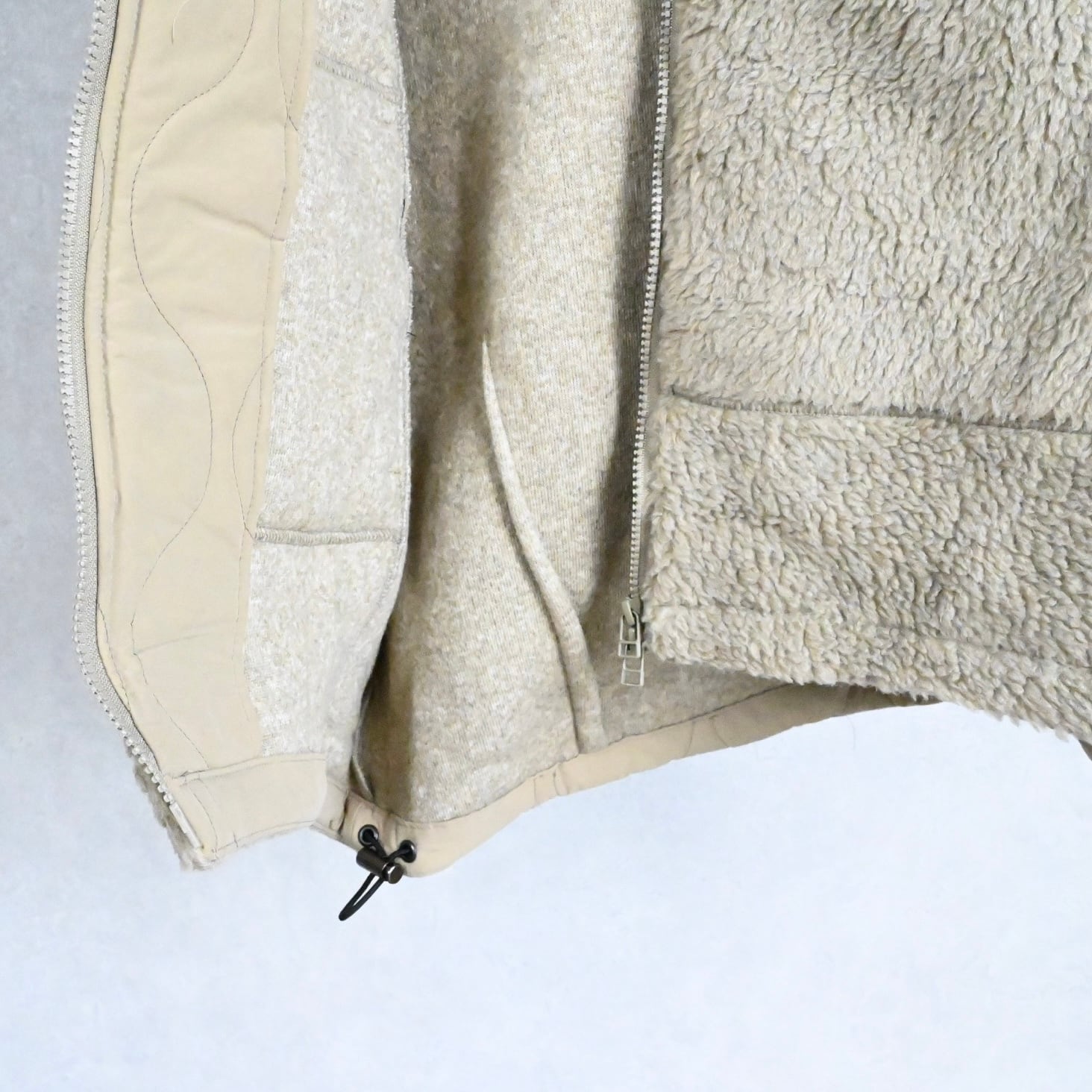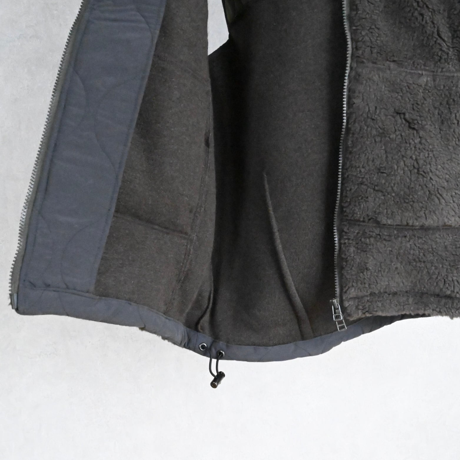 オランダ軍やチェコ軍のデッドストックを思わせる、ボア×テフロン素材の布帛を組み合わせた切り替えが印象的です。