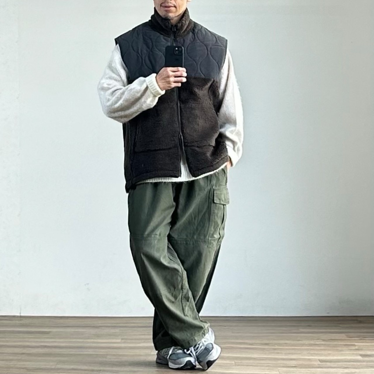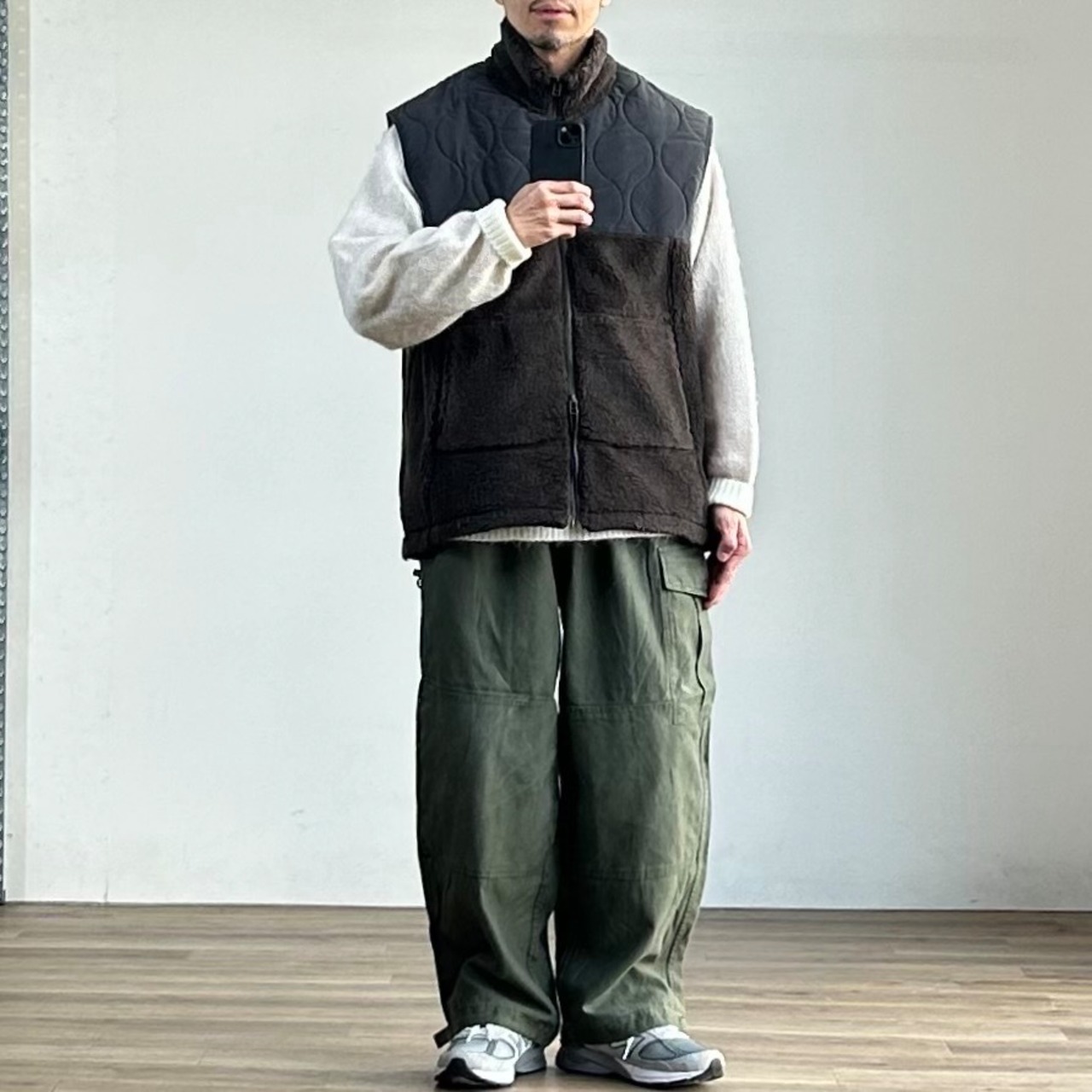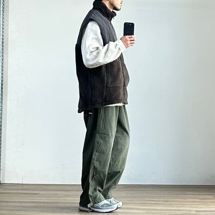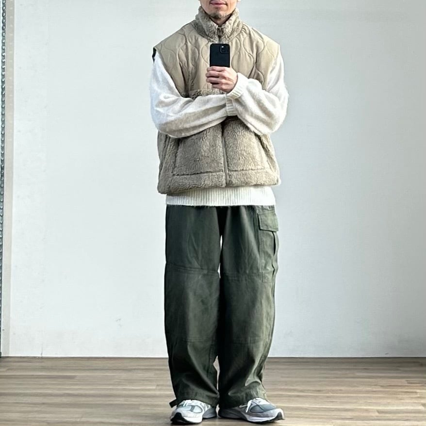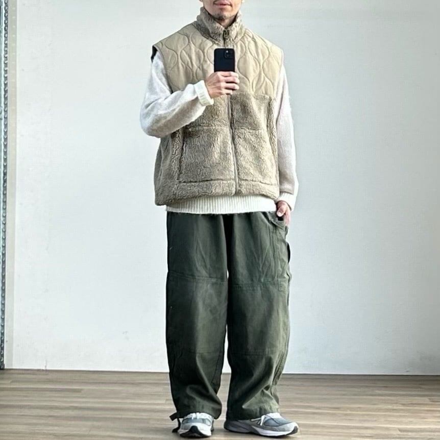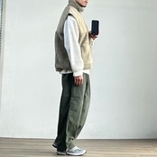 一方で、スウェットやニットの上に単体で着ても様になる汎用性の高さも魅力。今の空気感をしっかりと捉えた、旬なボアベストに仕上がっています。