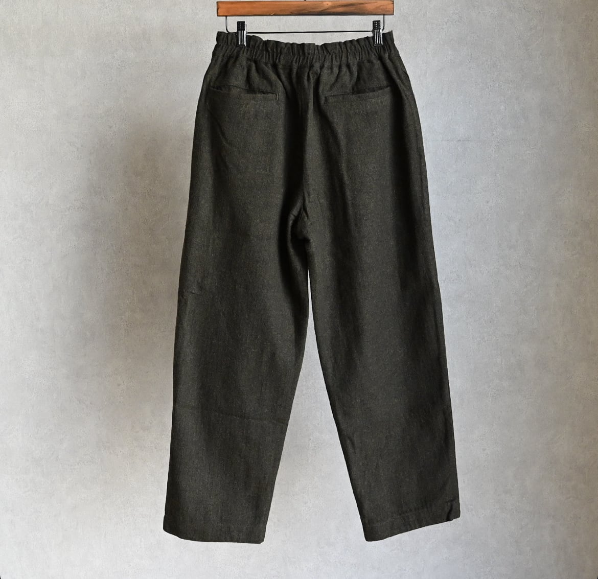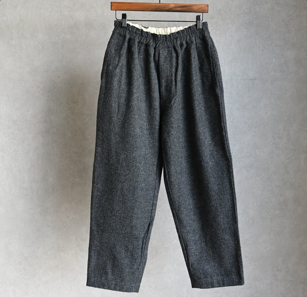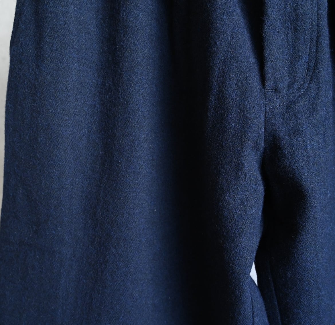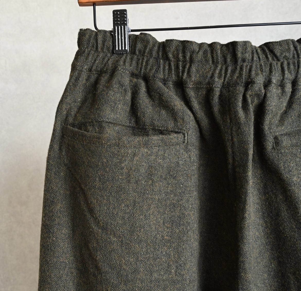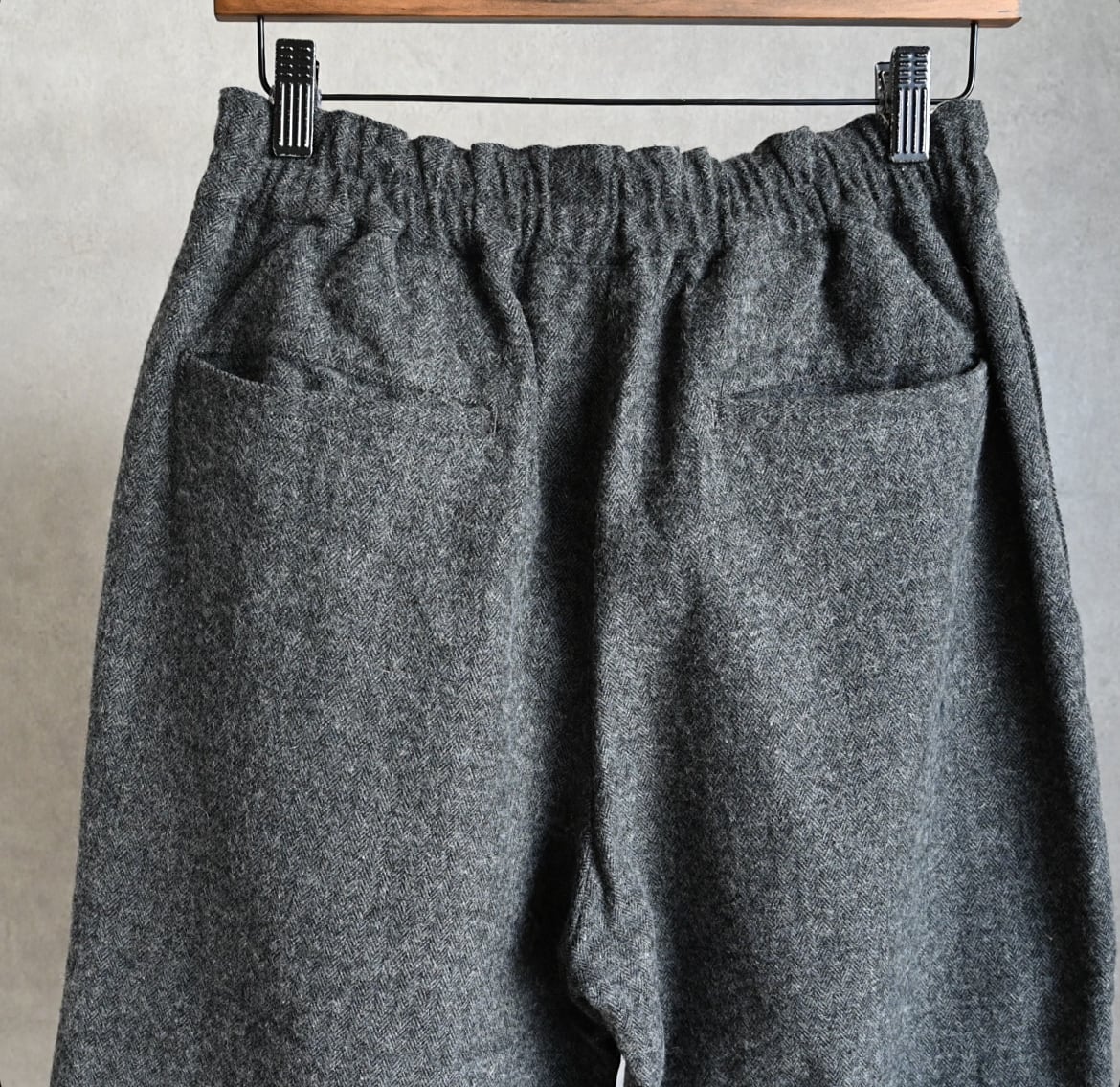 素材に程よく起毛感のあるコットンウールヘリンボン生地を使用したワイドイージーパンツ。