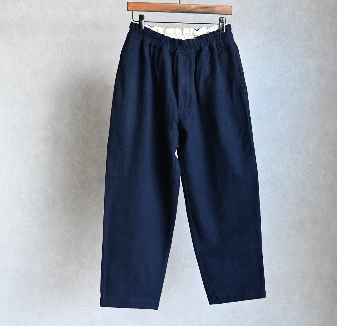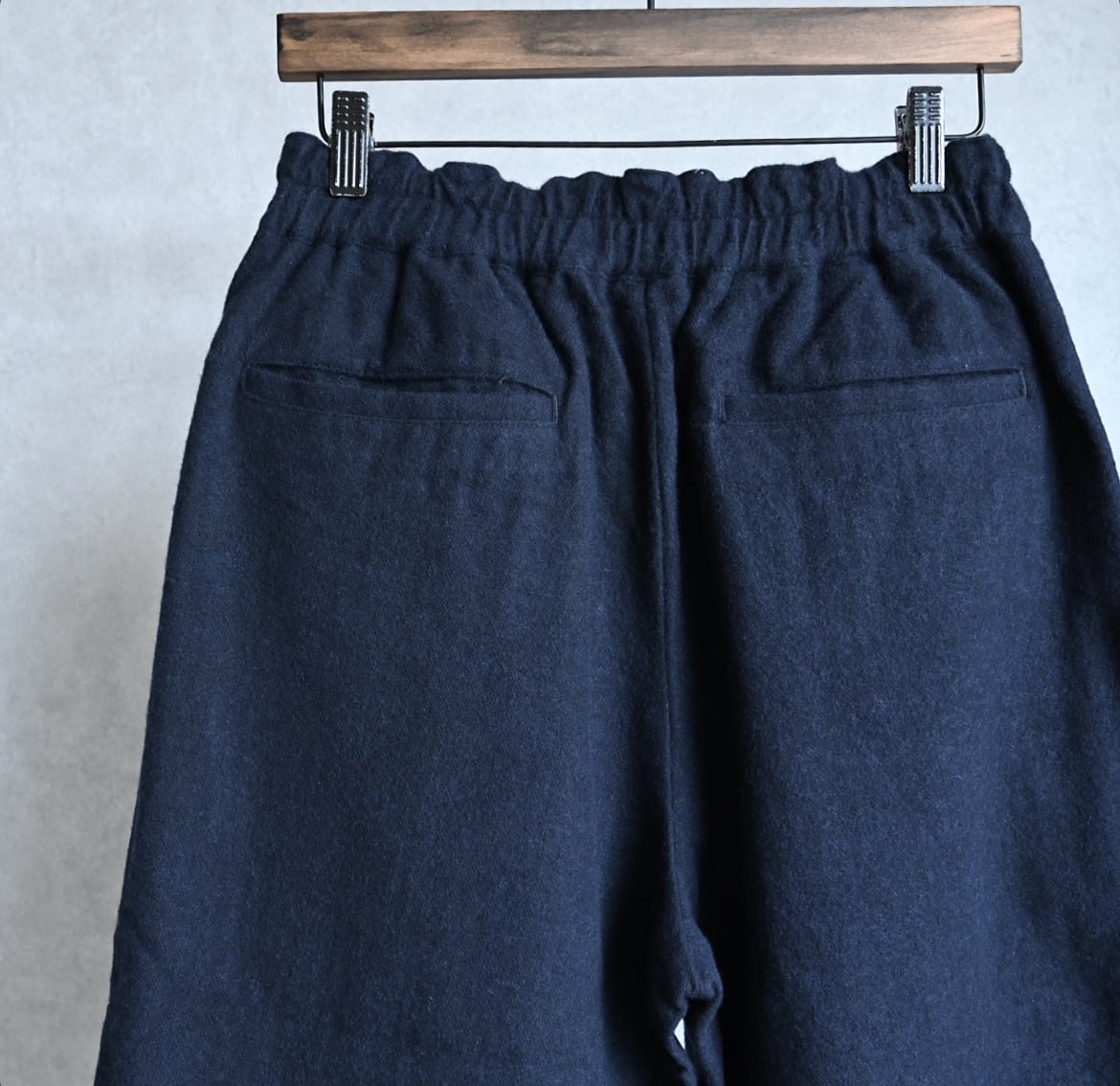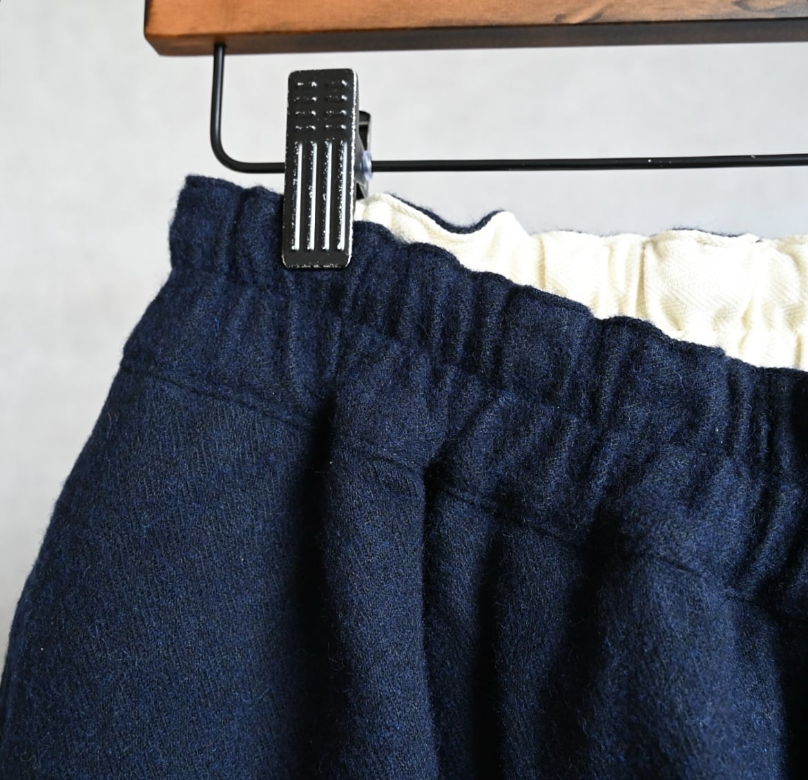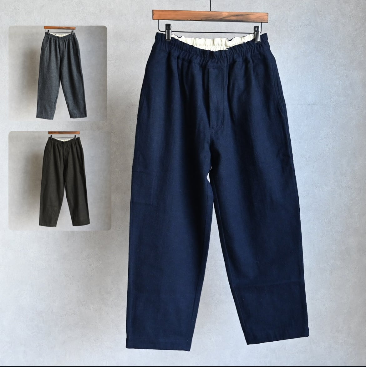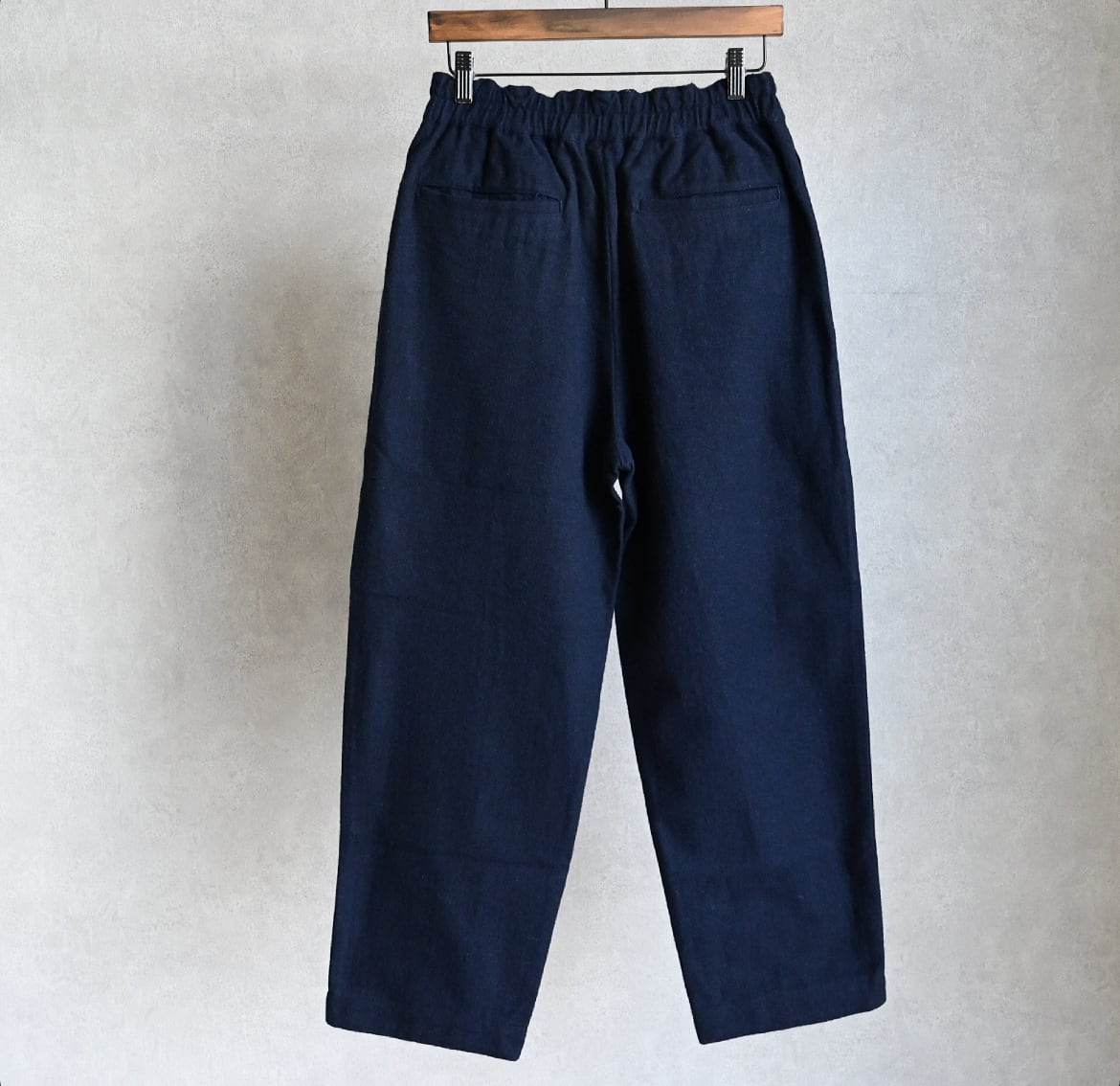 素材に程よく起毛感のあるコットンウールヘリンボン生地を使用したワイドイージーパンツ。