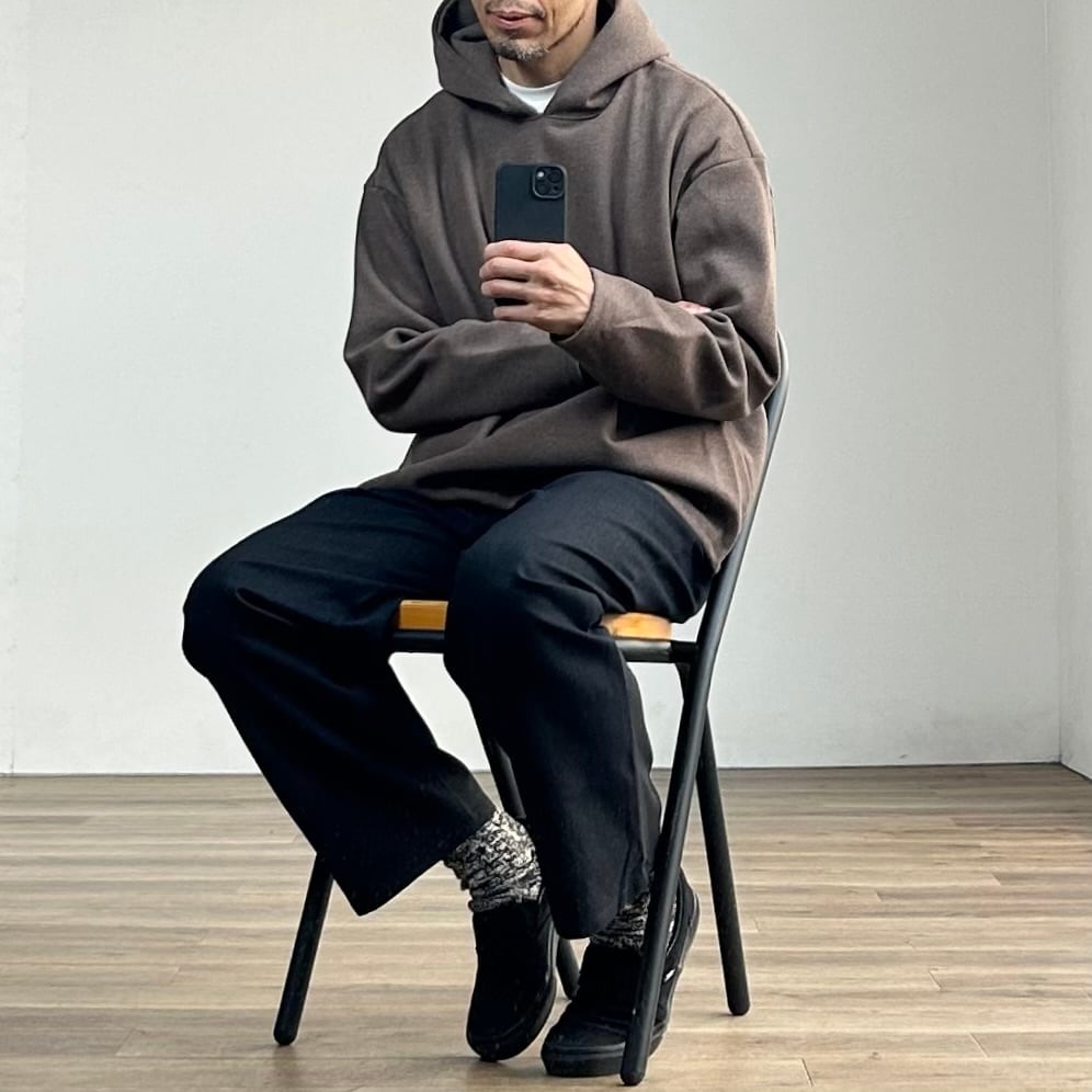 スウェット感覚でラフに着ても、軽アウターのように羽織っても、スタイリングに自然な抜け感を与えてくれます。さらに、コートやブルゾンの中に忍ばせても、素材の上品さが大人らしい冬のレイヤードをつくりあげます。