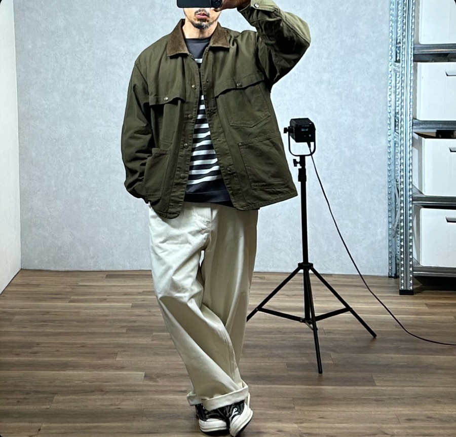 張りを抑え柔らかさを加えることで落ち感が増し、今回のワイドストレートシルエットをより引き立たせています。