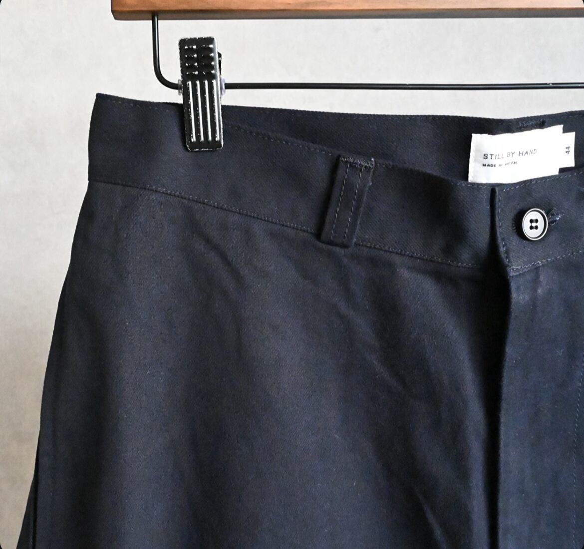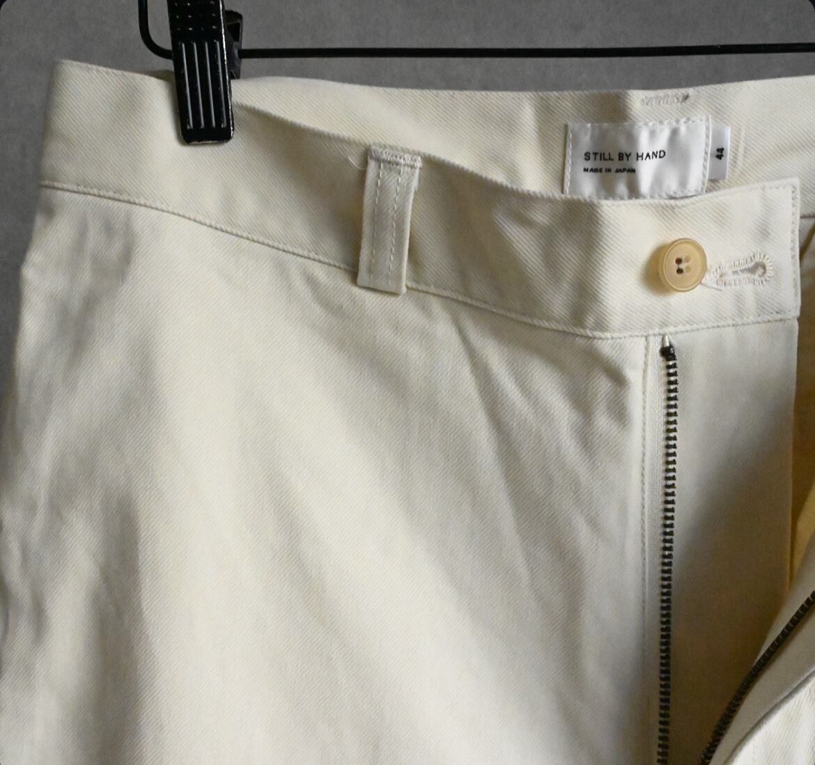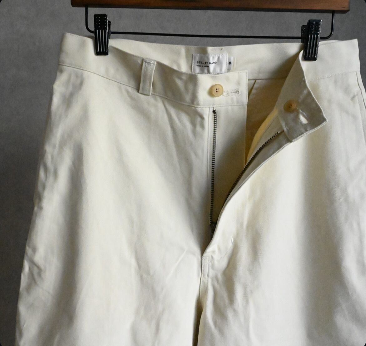STILL BY HANDのデザイナーはワンタックから多い時には3タックまで使い分けてふんわりとしたワイドシルエットを作り出すのがとても上手いので「タックの魔術師」と僕は勝手に命名してるくらいですが、今回は敢えてのノータック仕立て。