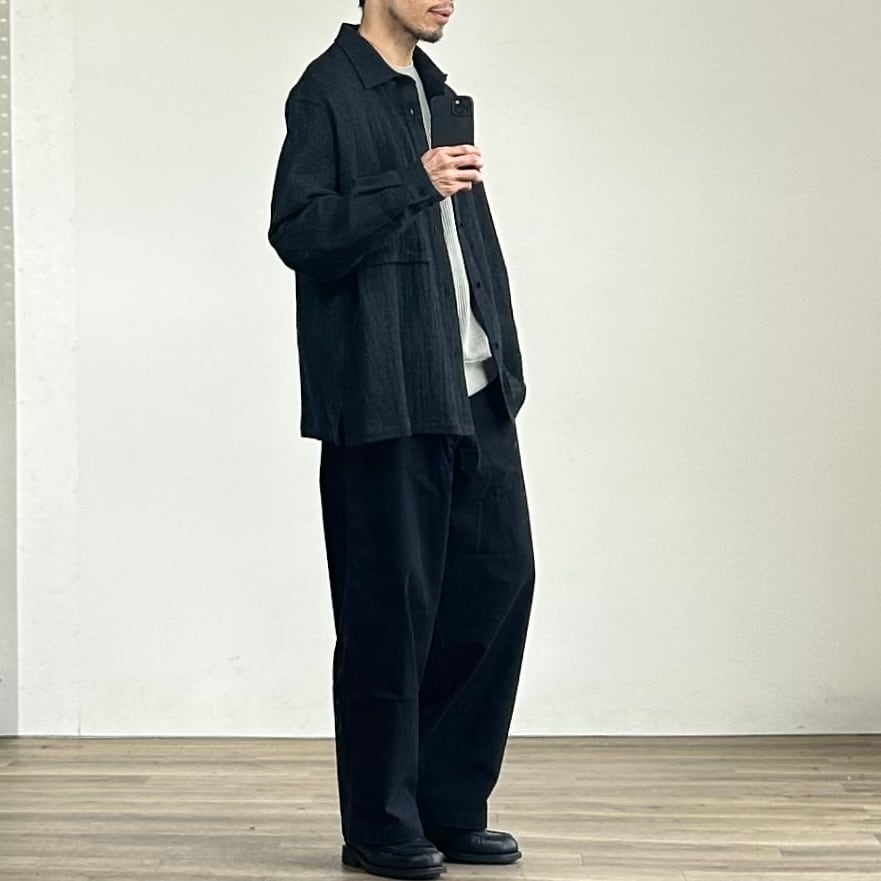 適度に張りを抑えて柔らかさを持たせているため落ち感が生まれ、今回のワイドストレートシルエットをより美しく見せてくれます。
