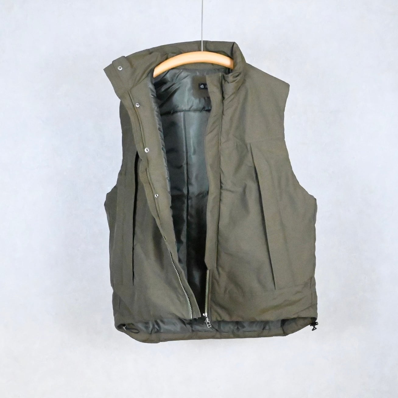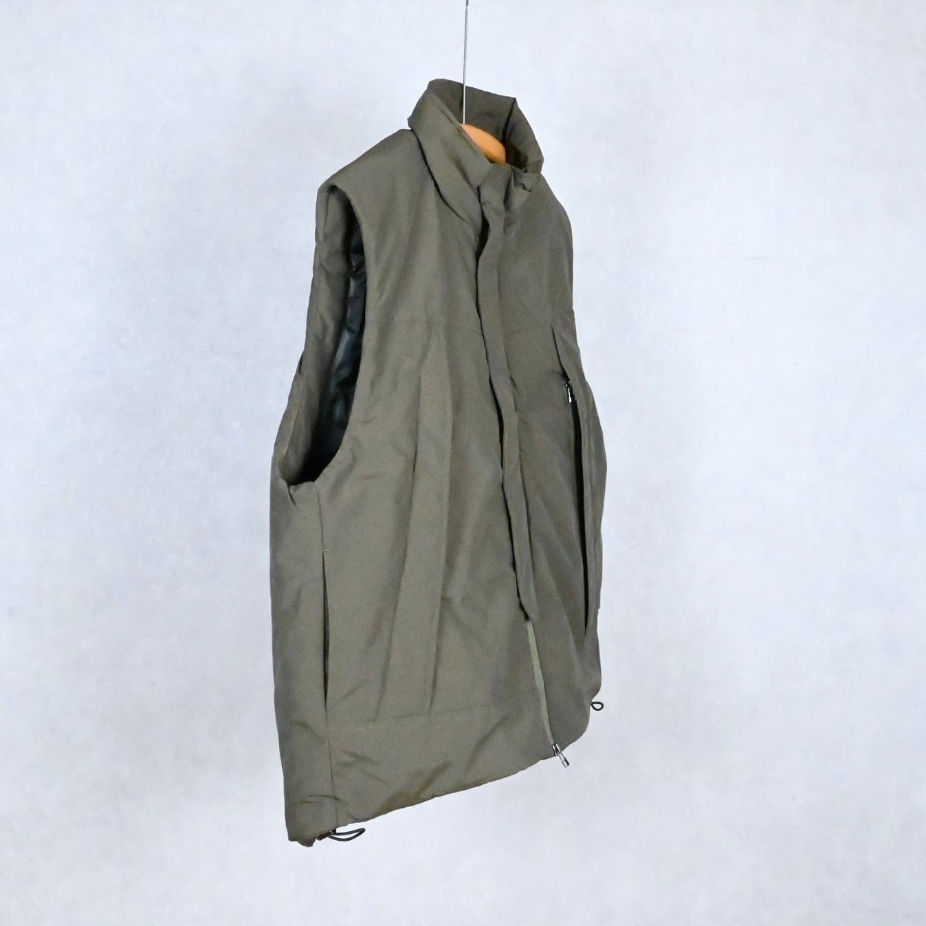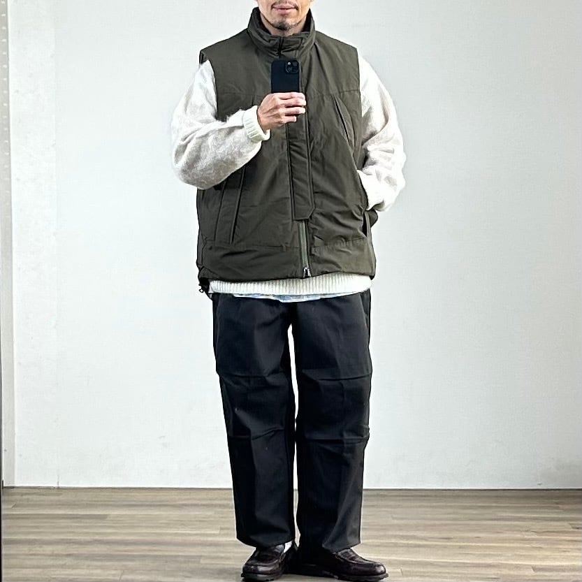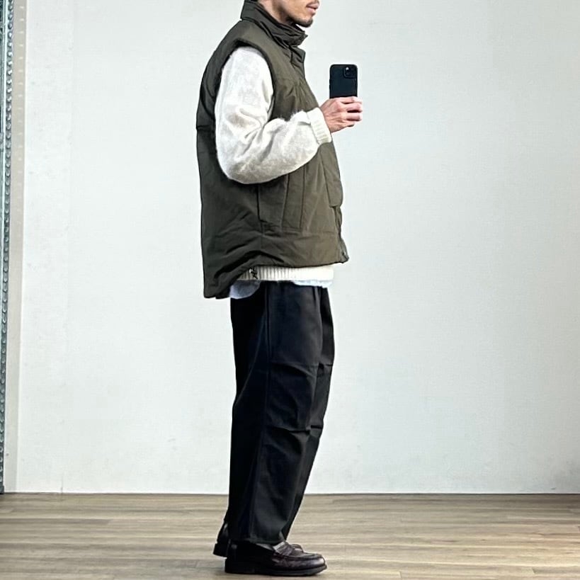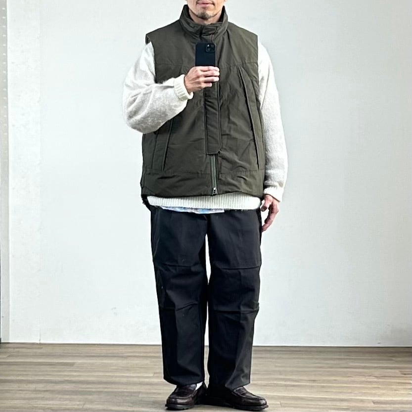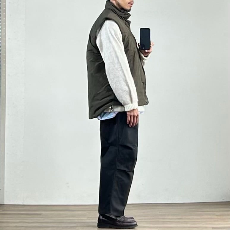 ミドルレイヤー使いを想定しての設計ではなく、あくまでアウターとしての提案のオーバーサイズベスト。