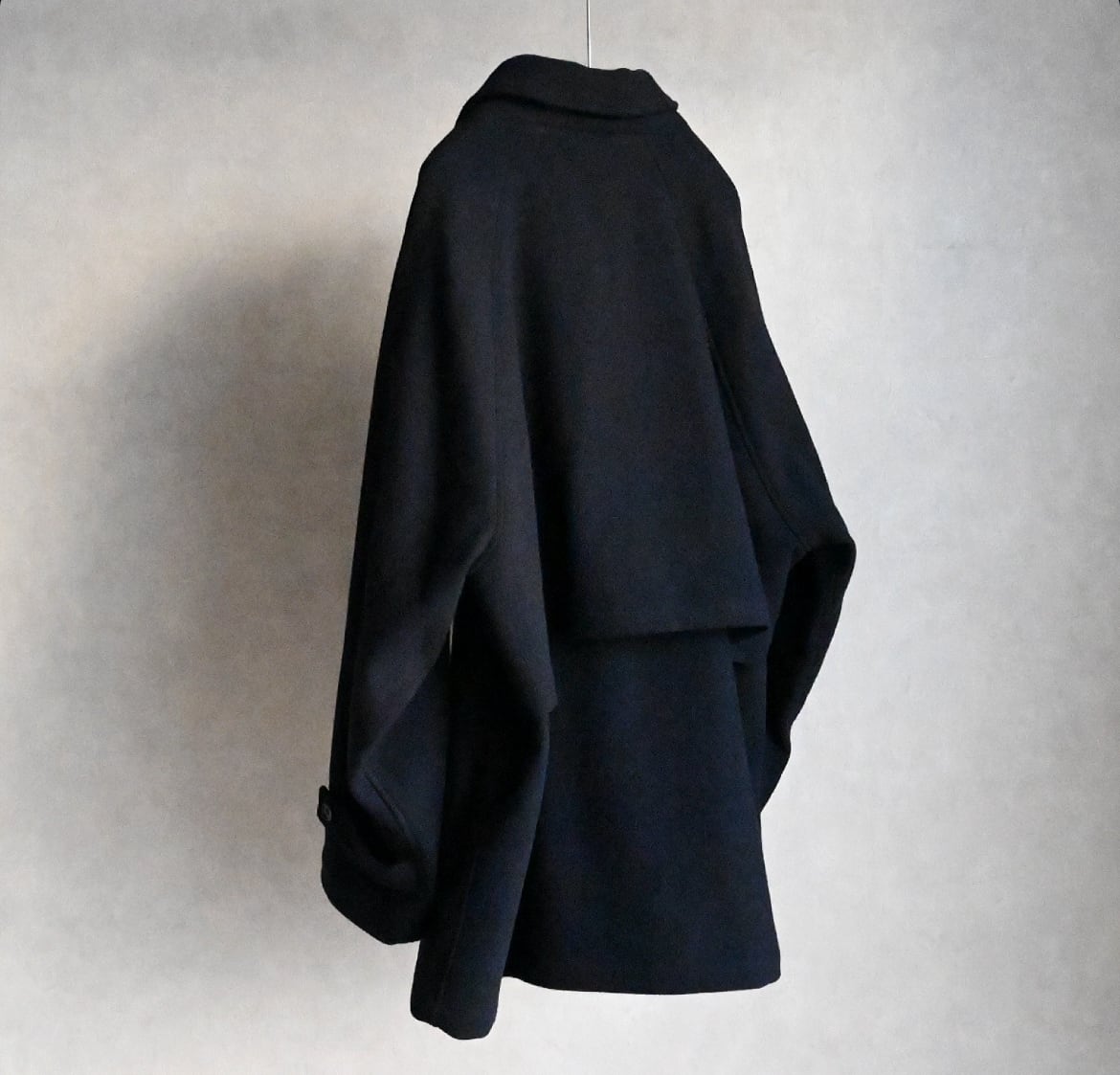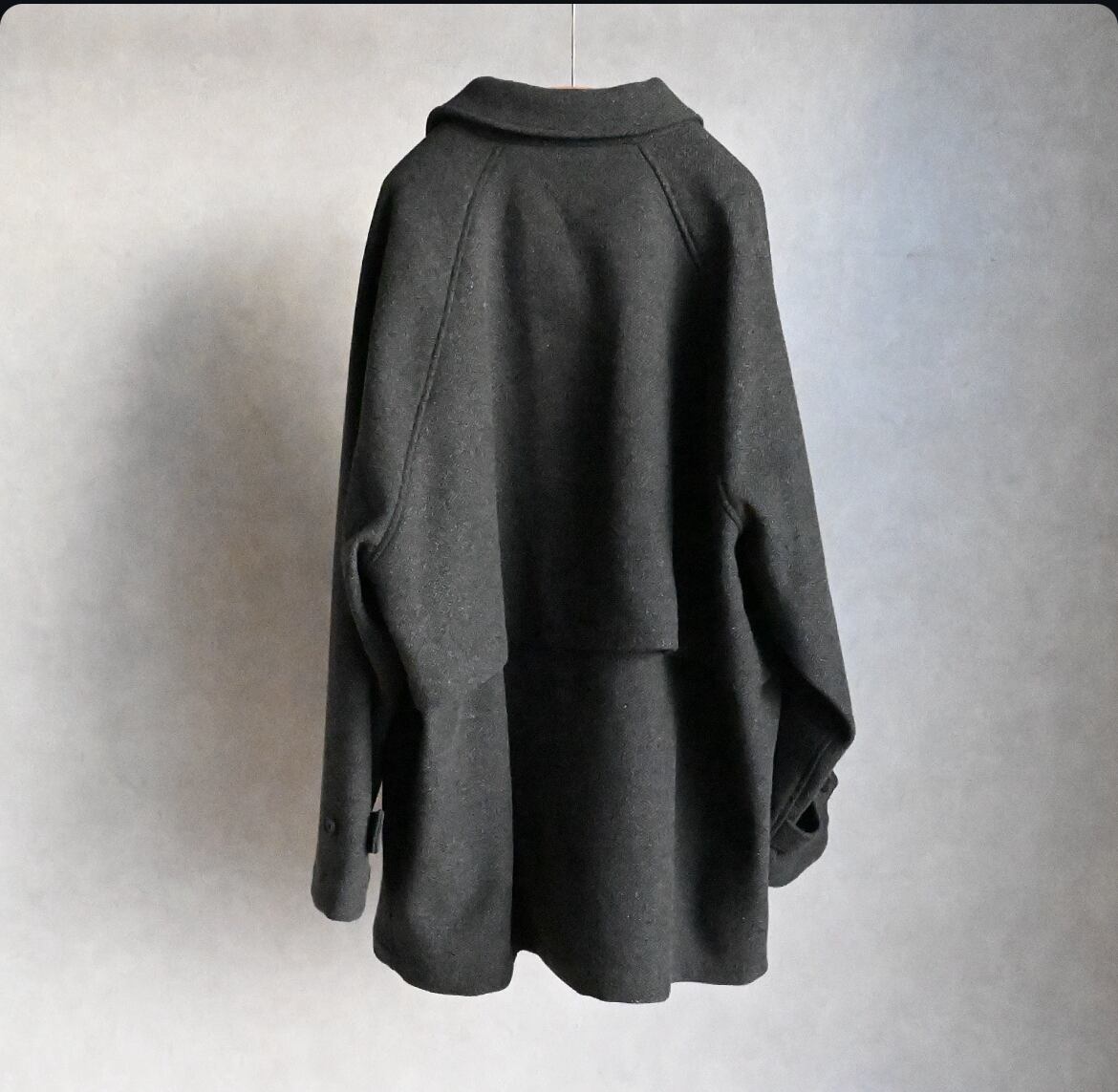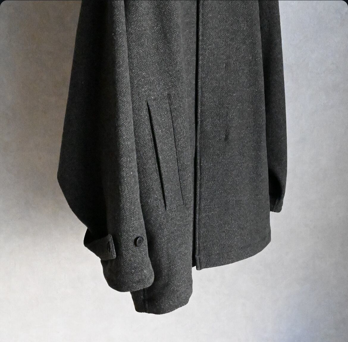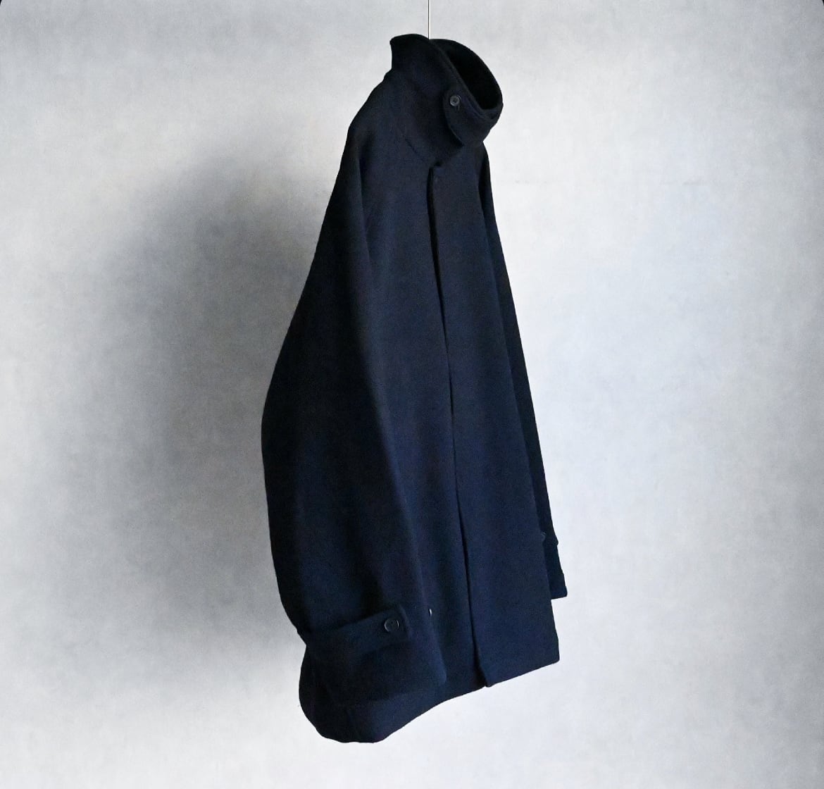 縦糸に太さの違う糸を交互に配置することで、無地でありながらストライプ上の凹凸のあるウール素材のハーフ丈ステンカラーコート。ハーフ丈にしたことで少し違和感のある面白いバランスになりました。アンブレラヨークと少し長めの袖のストラップもポイントです。