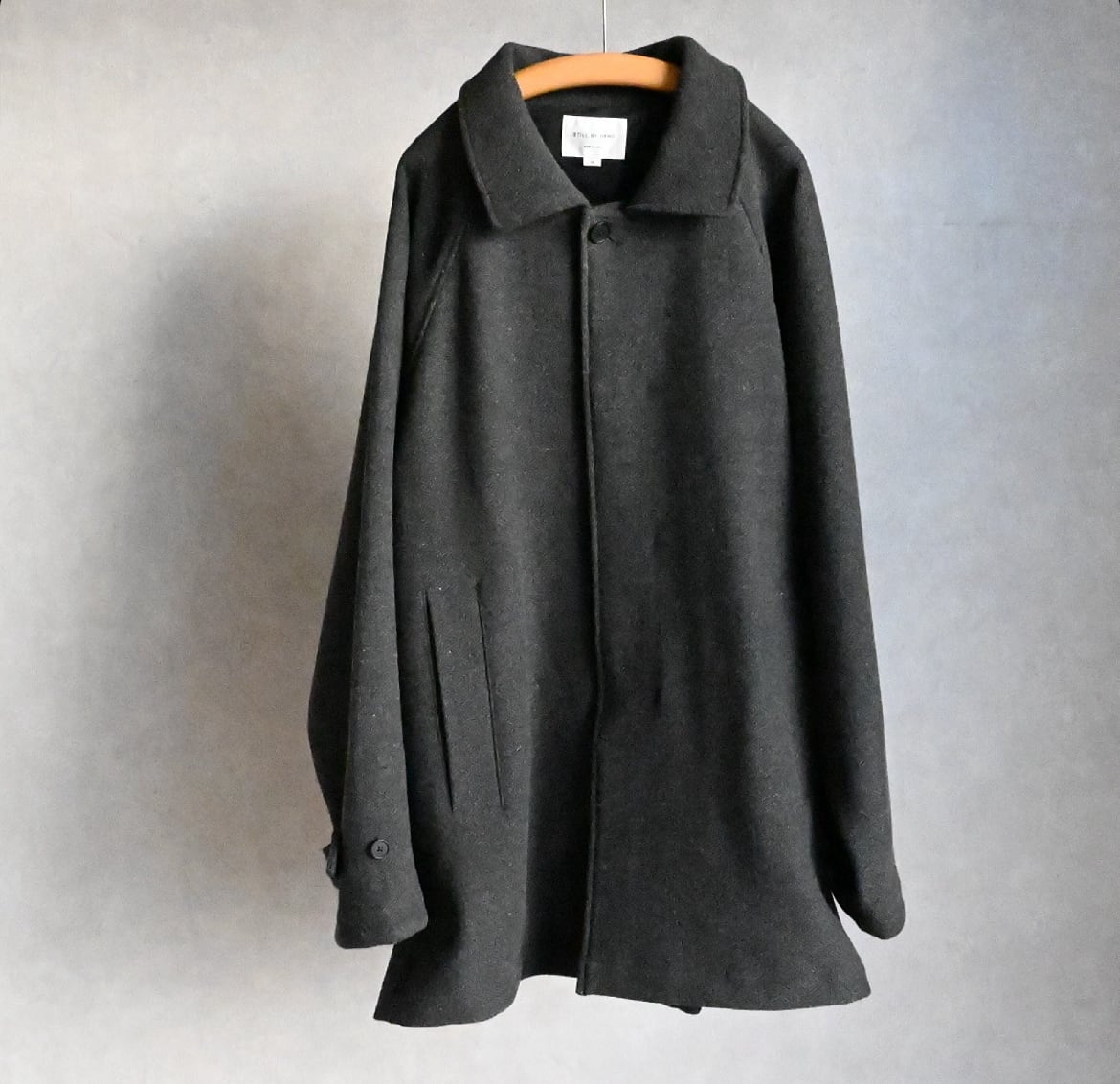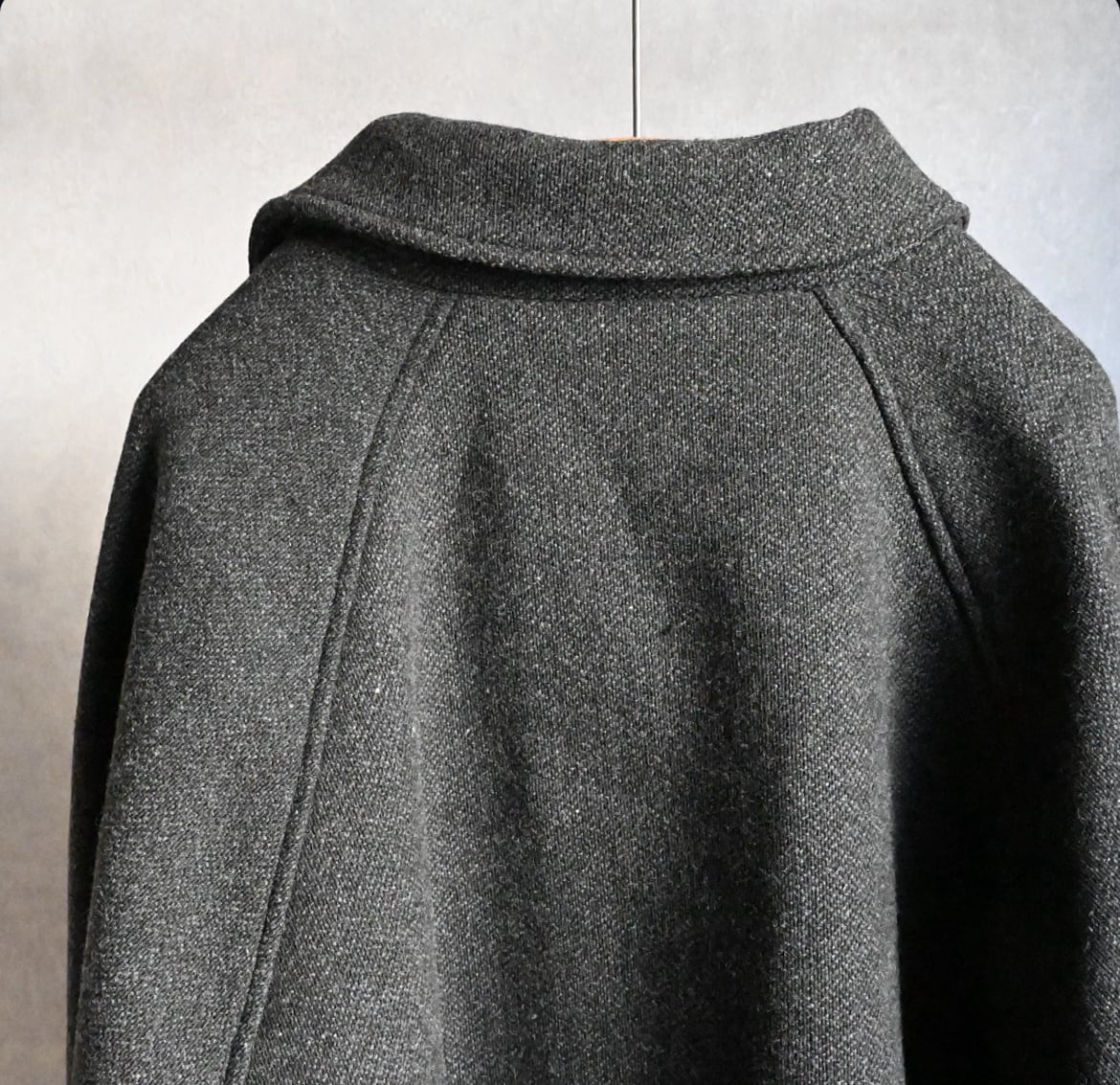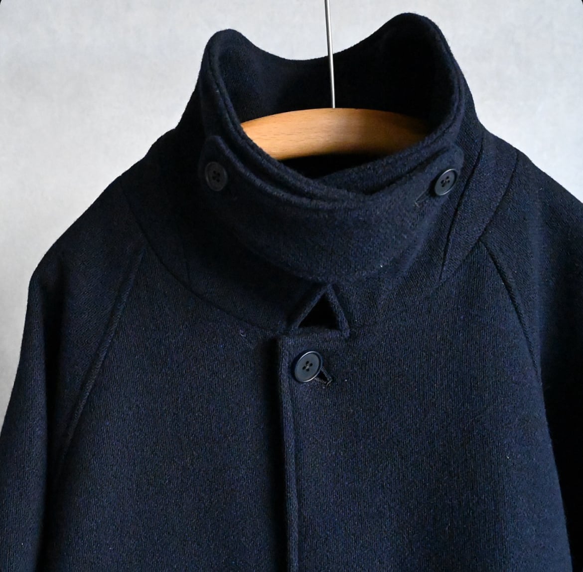 縦糸に太さの違う糸を交互に配置することで、無地でありながらストライプ上の凹凸のあるウール素材のハーフ丈ステンカラーコート。ハーフ丈にしたことで少し違和感のある面白いバランスになりました。アンブレラヨークと少し長めの袖のストラップもポイントです。