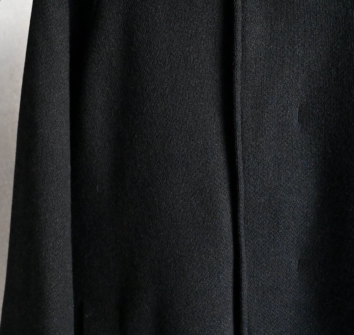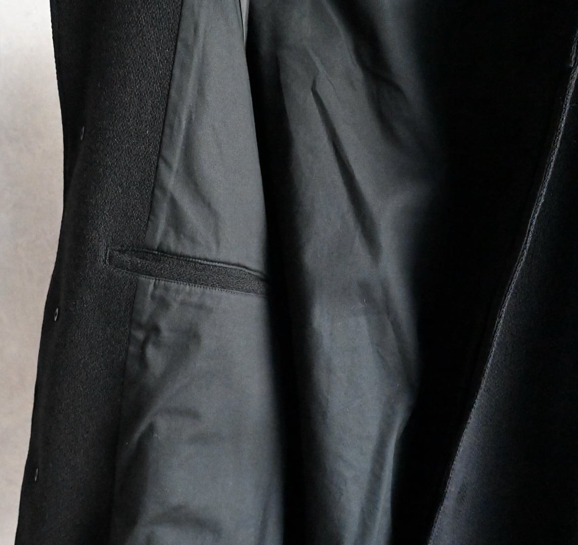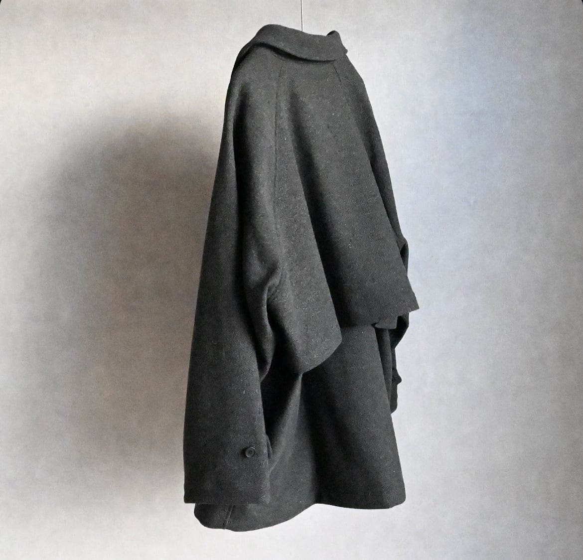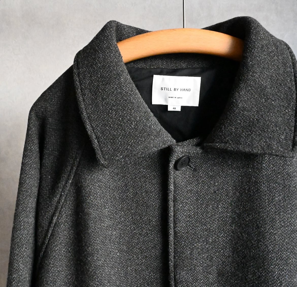 縦糸に太さの違う糸を交互に配置することで、無地でありながらストライプ上の凹凸のあるウール素材のハーフ丈ステンカラーコート。ハーフ丈にしたことで少し違和感のある面白いバランスになりました。アンブレラヨークと少し長めの袖のストラップもポイントです。