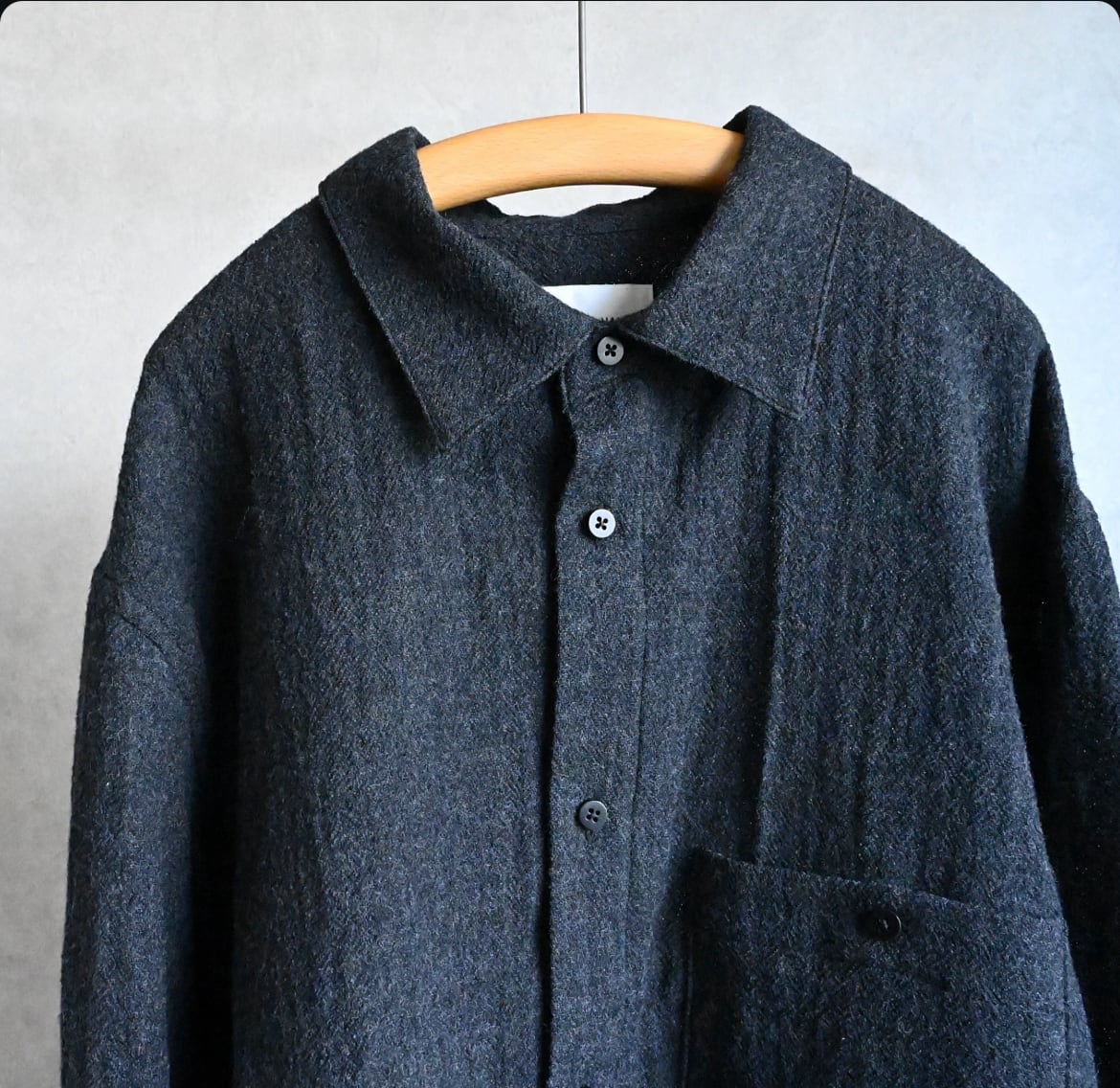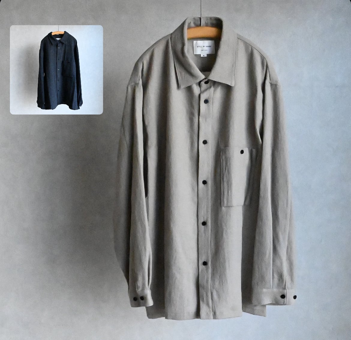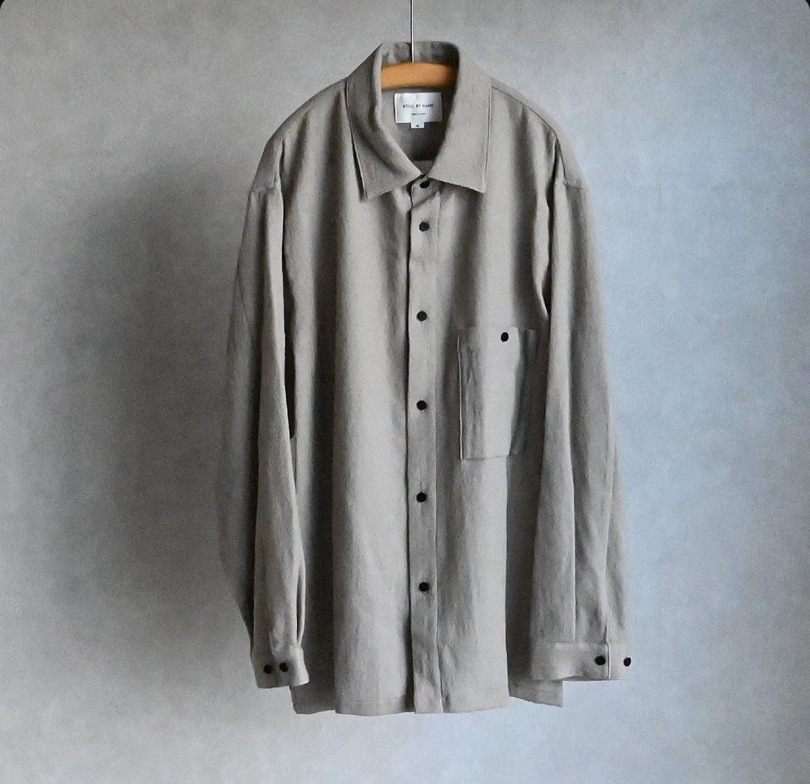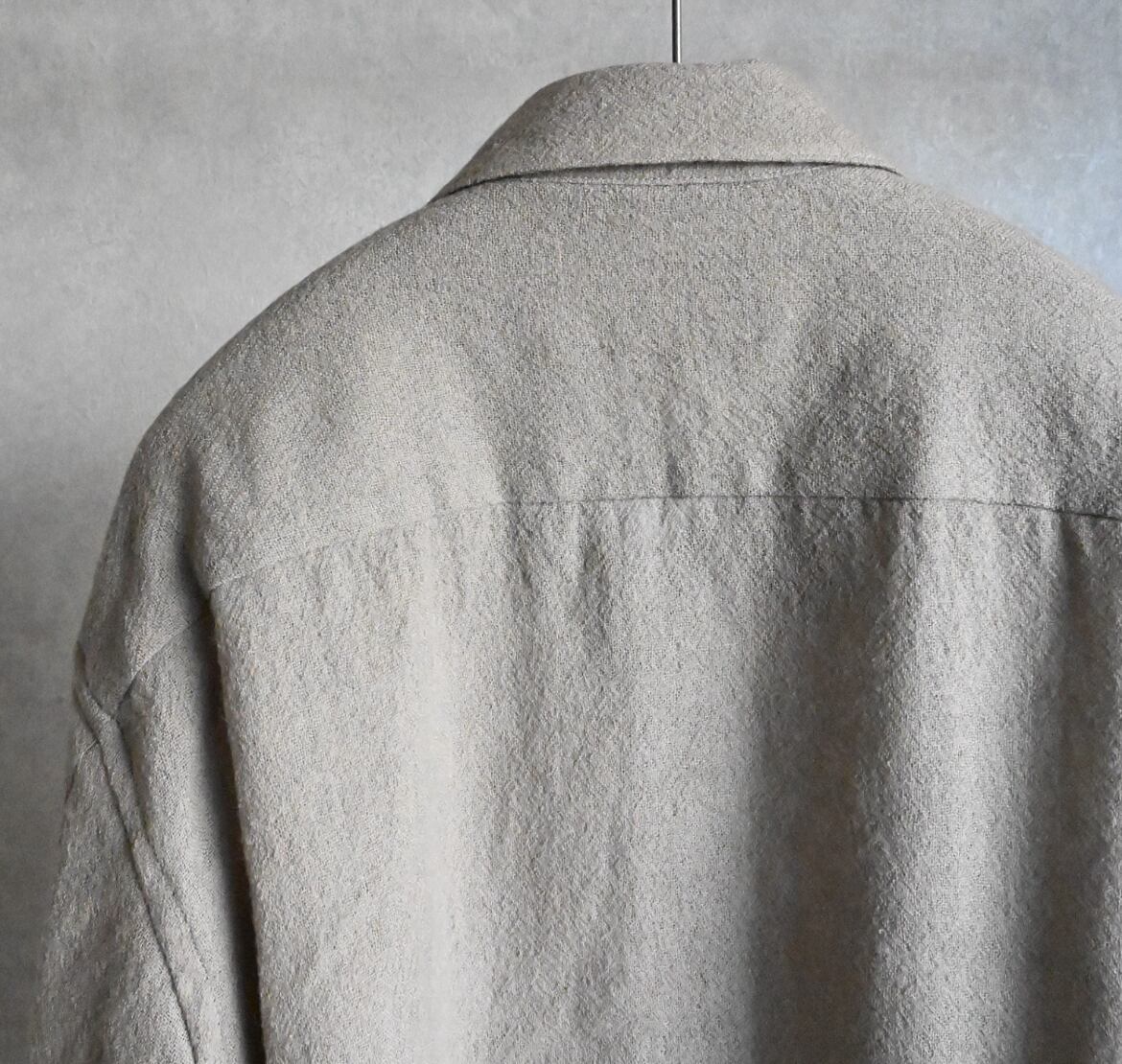 STILL BY HANDのオーバーシルエットが好きな方には今回も間違いなく気に入っていただけるでしょう。そこにウール特有のトロミや裾スクエアのデザイン、大きめのパッチポケットがアクセントになって袖を通すだけで気持ちが上がる一枚と言える仕上がりです。