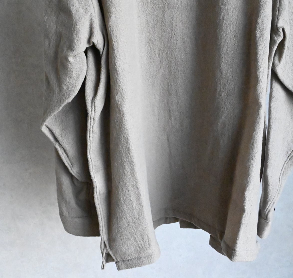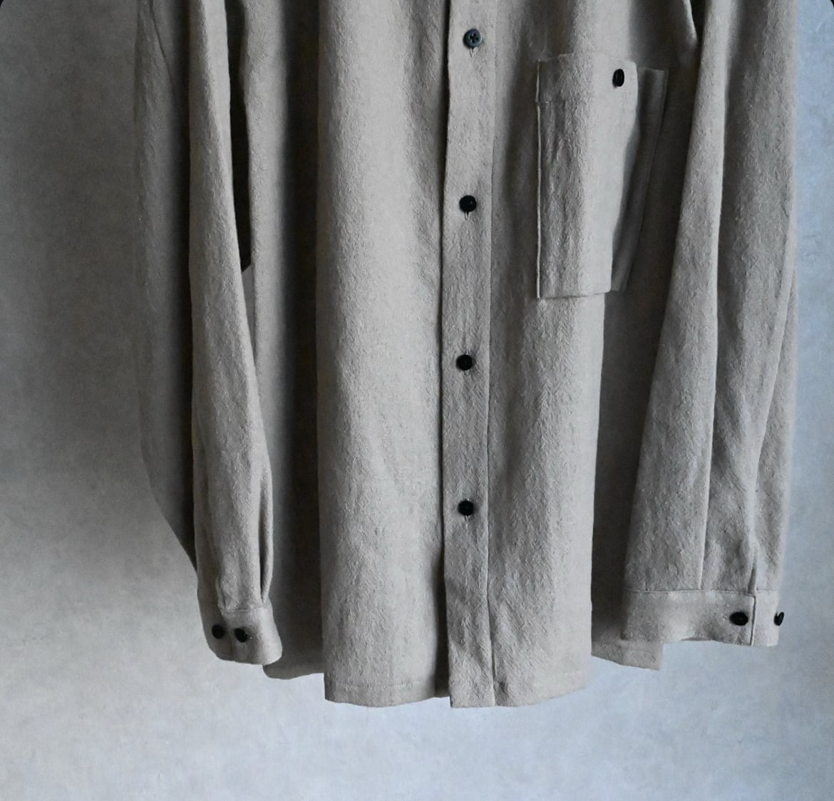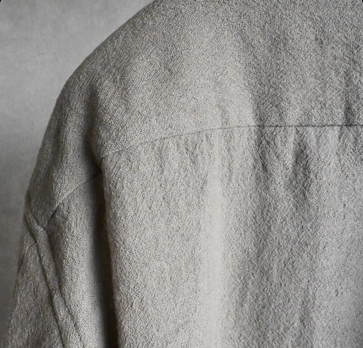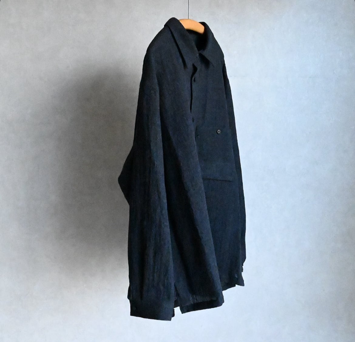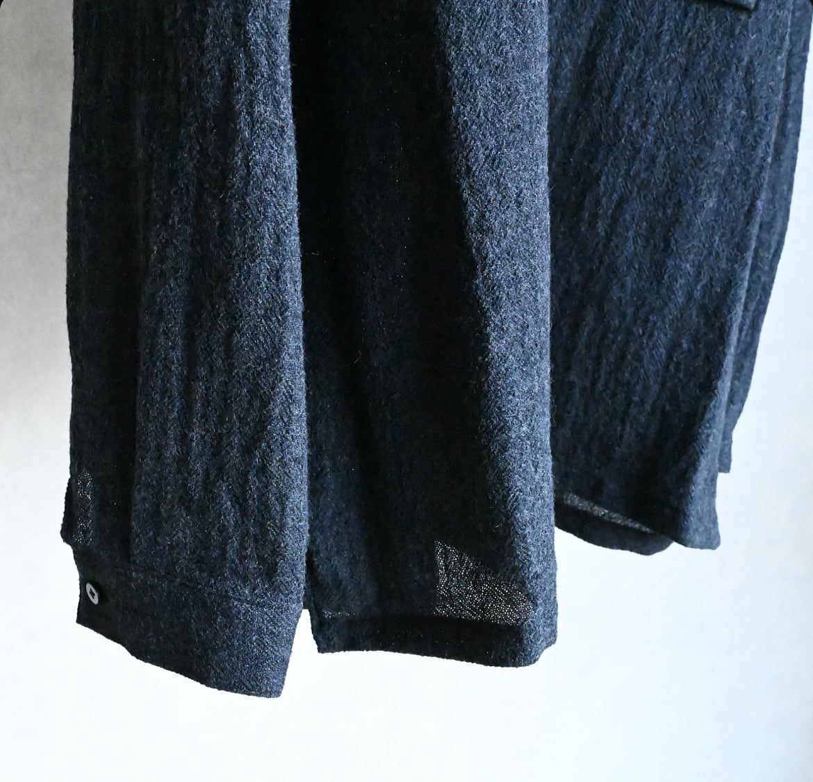 STILL BY HANDのオーバーシルエットが好きな方には今回も間違いなく気に入っていただけるでしょう。そこにウール特有のトロミや裾スクエアのデザイン、大きめのパッチポケットがアクセントになって袖を通すだけで気持ちが上がる一枚と言える仕上がりです。
