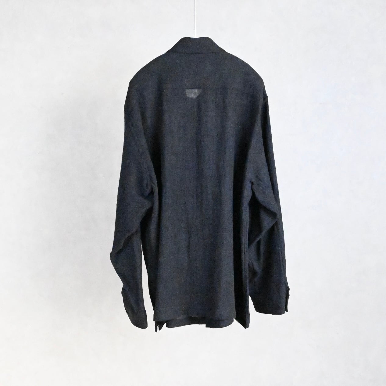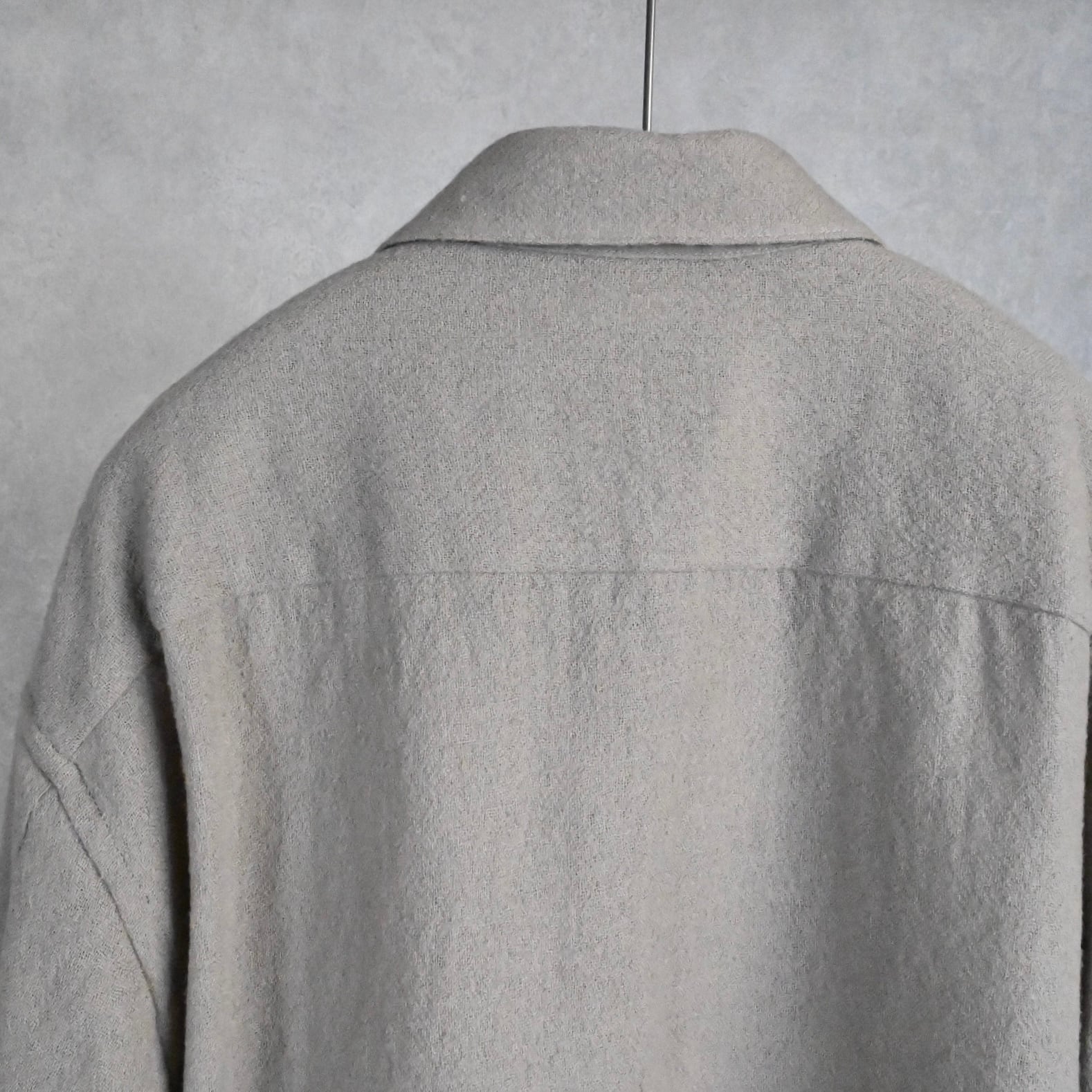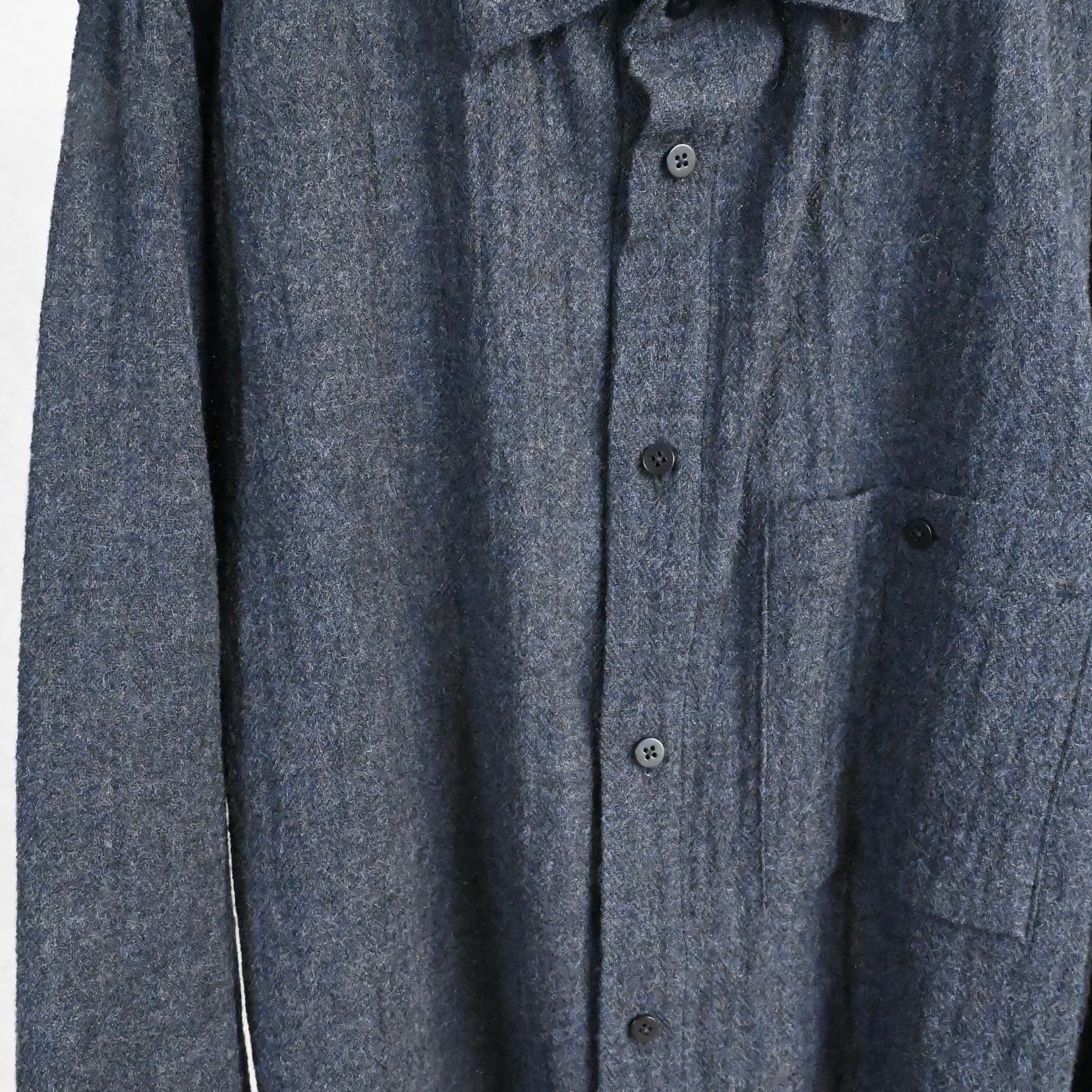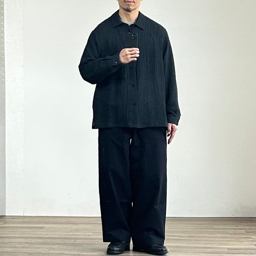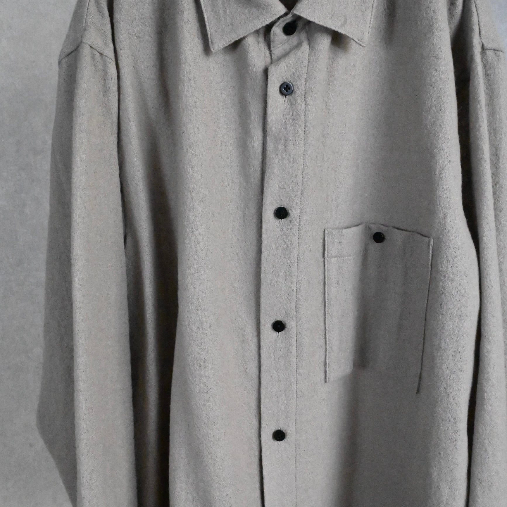 ウール特有の落ち感、大きめのパッチポケット、裾のスクエアデザイン──シンプルなのに袖を通すだけで気分が上がる仕上がり。好きな方には間違いなく刺さるウールシャツです。