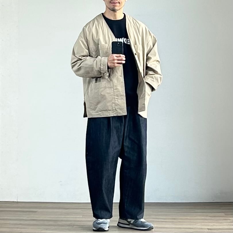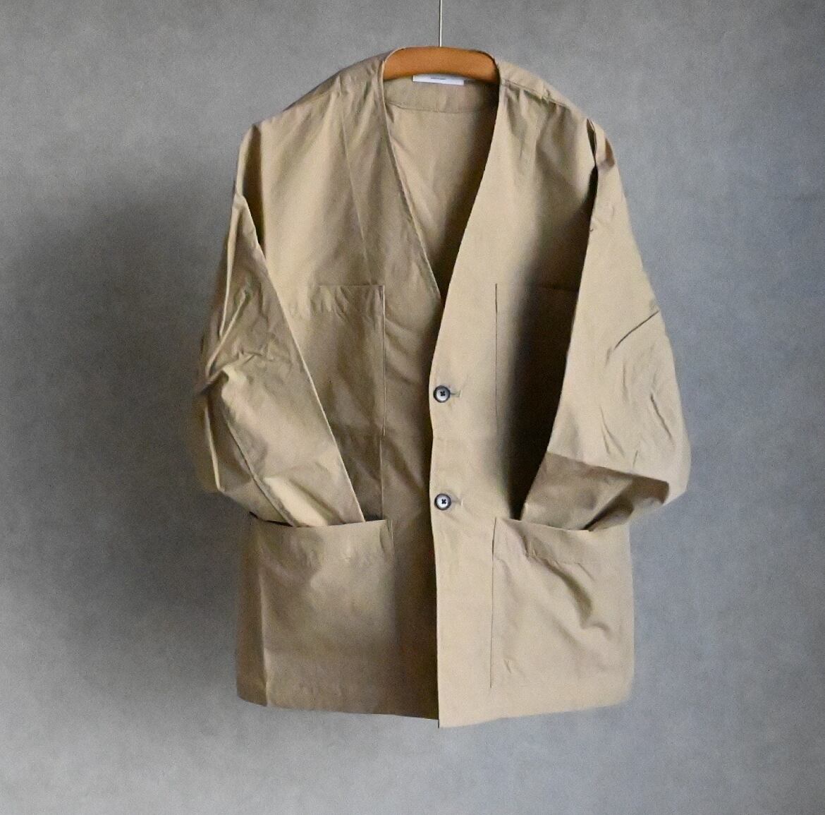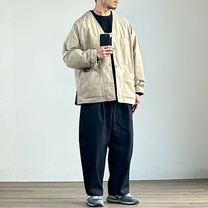 カーディガンとファティーグジャケットをミックスしたデザインで、作務衣のような雰囲気も兼ね備えています。インパクトのあるフロントの4つのポケットは収納力も兼備。